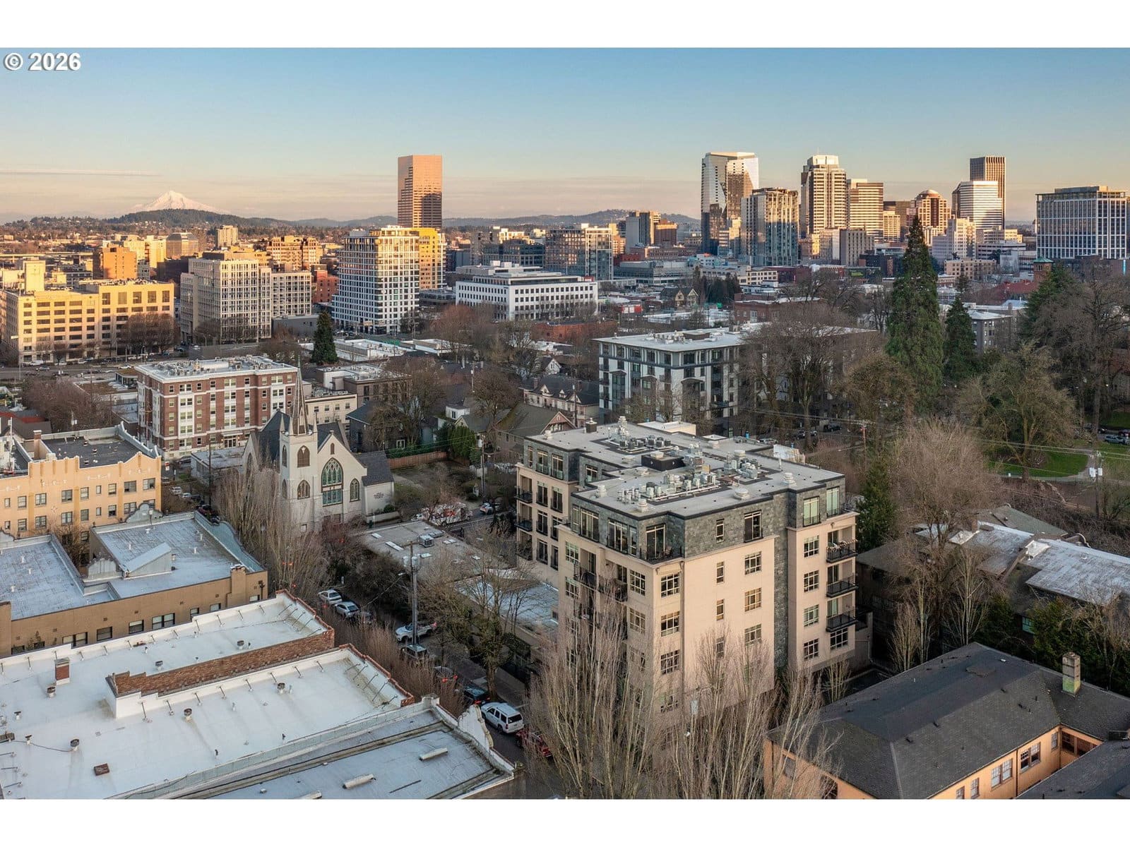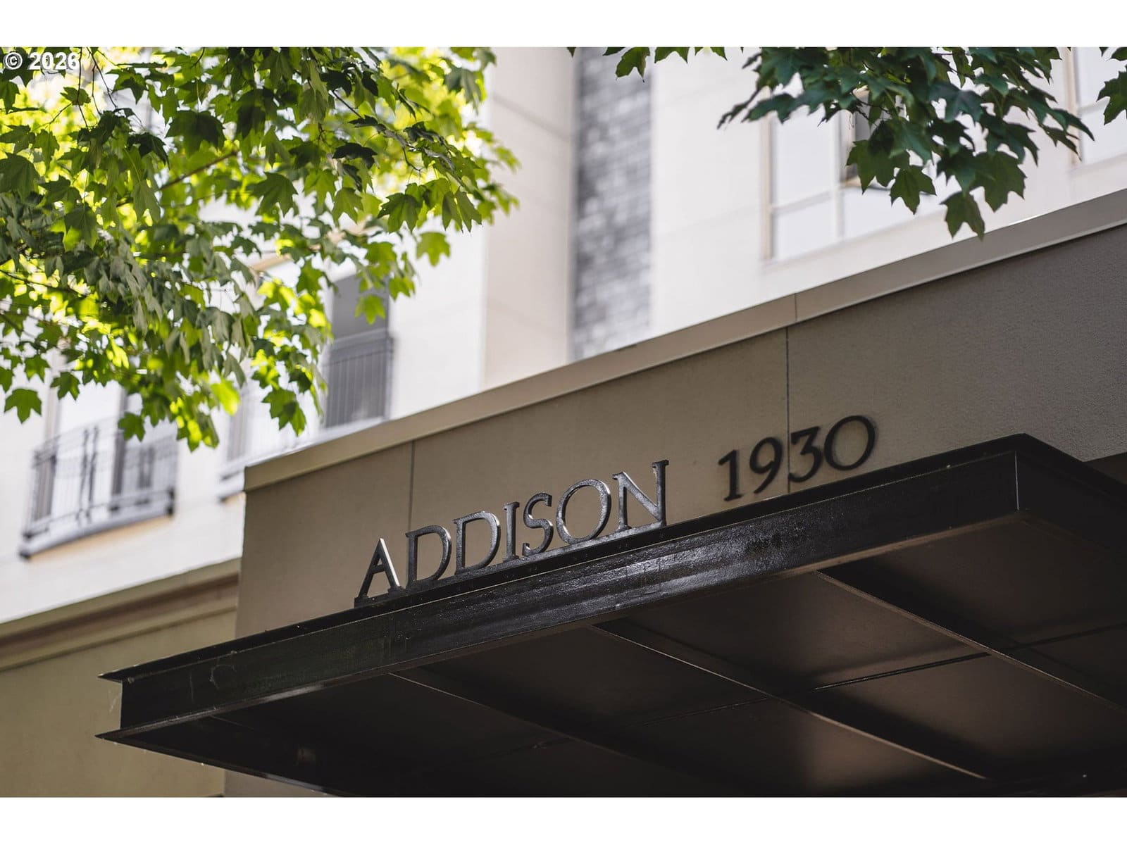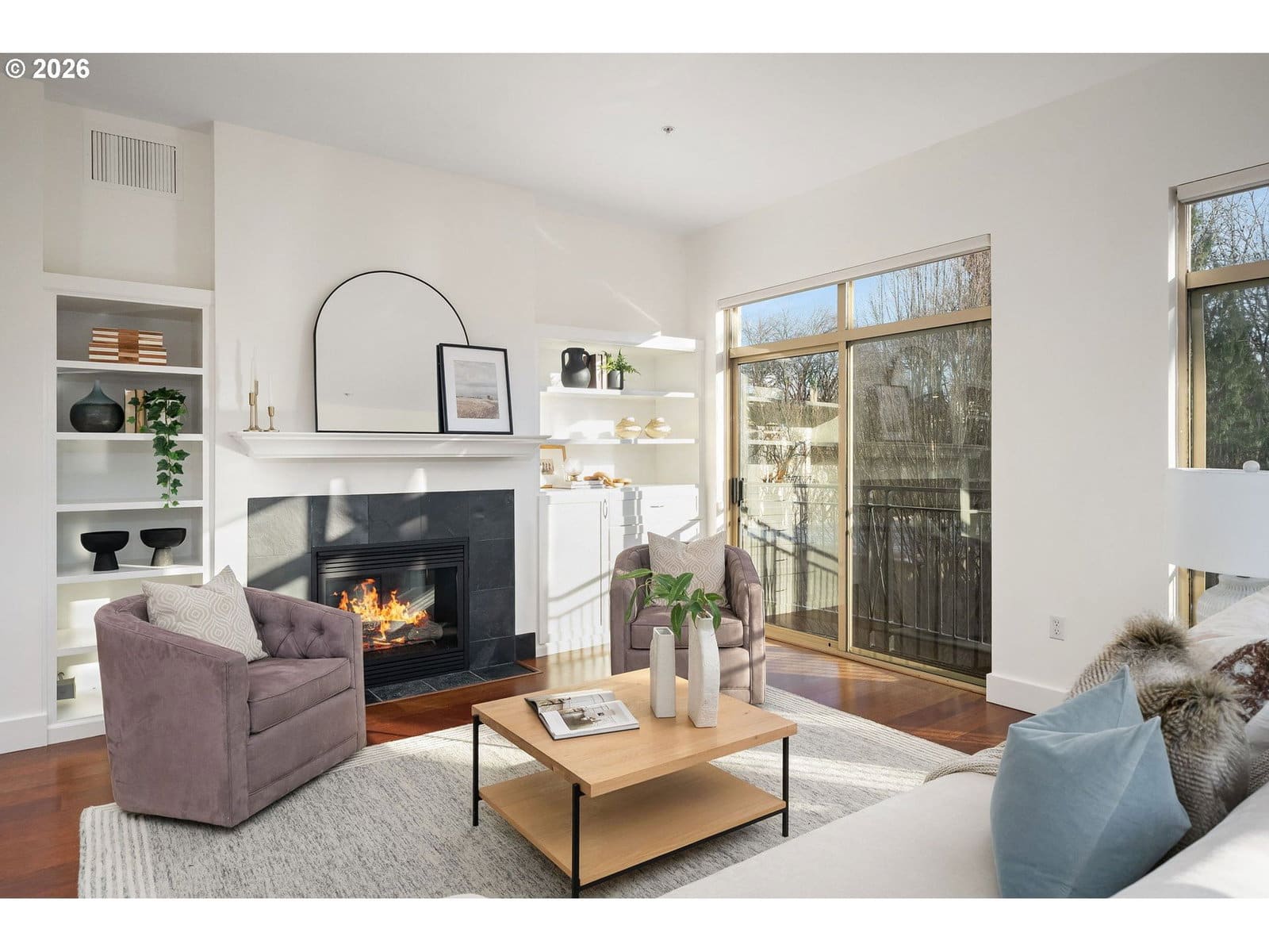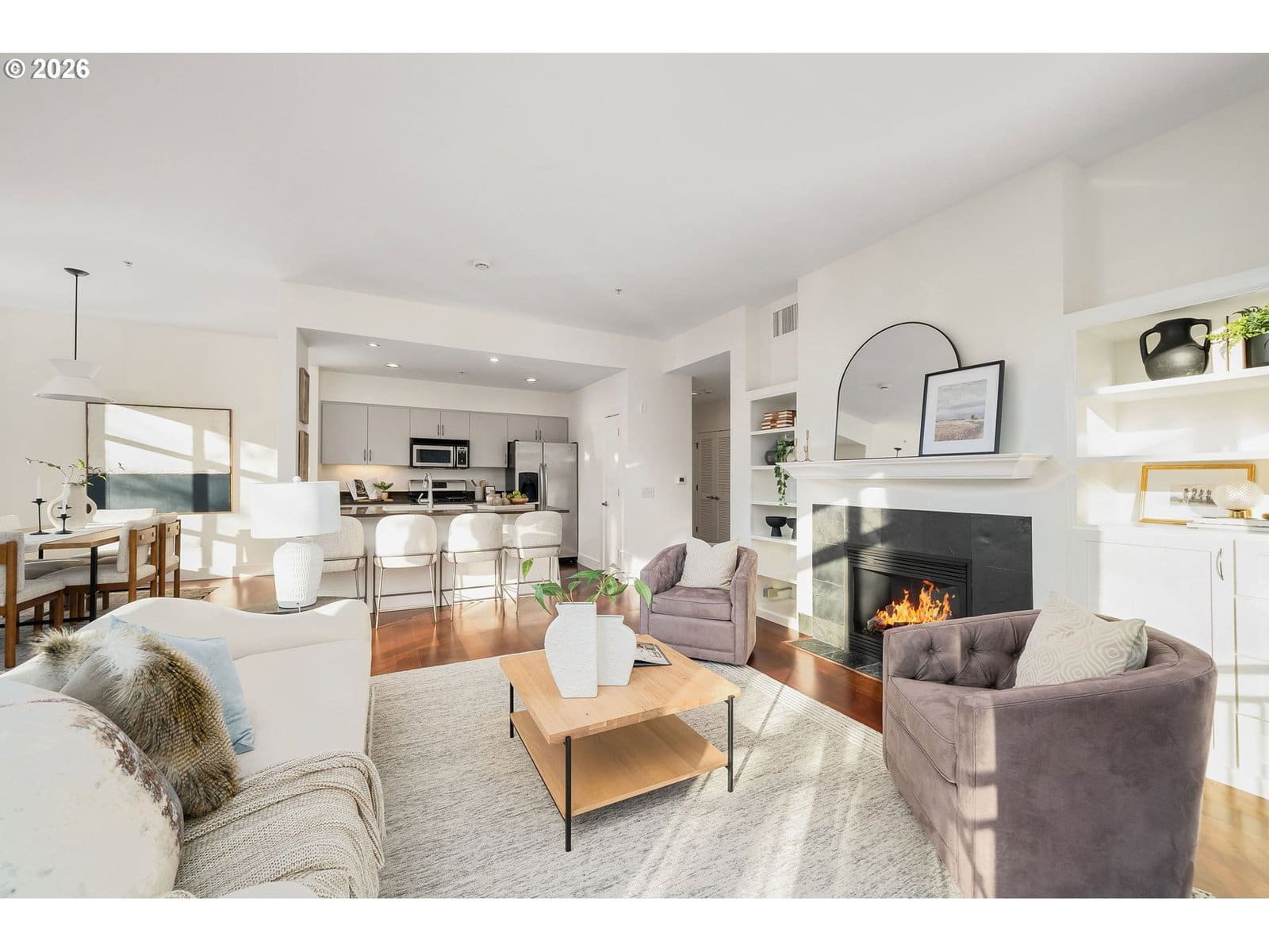 Set in the heart of Portland’s vibrant Alphabet District, this light-filled corner condo features a well-designed, functional floor plan with a focus on comfort, quality, and effortless city living. Located in Addison Condominiums—a boutique condo building nestled along tree-lined streets with a distinctive blend of historic architecture. Large windows, high ceilings, and three sliding glass doors provide an abundance of natural light, treetop views, and fresh air. The gas fireplace and built-ins add warmth and character, while the kitchen offers plenty of work space with the generous peninsula with bar seating and a pantry for additional storage. Step outside to a large private balcony—an extension of the living space—perfect for morning coffee, al fresco dining, or simply enjoying the surrounding greenery and neighborhood charm. Additional features include wood floors, a spacious walk-in closet in the primary bedroom, a stack-able washer & dryer, new paint throughout, new carpet in both bedrooms, new heat pump keeping the temperature just right no matter the weather, a deeded storage unit, and a deeded parking space in the gated garage.