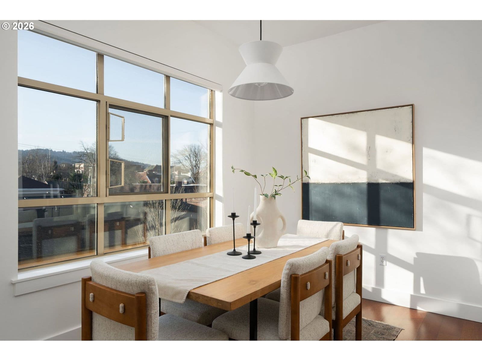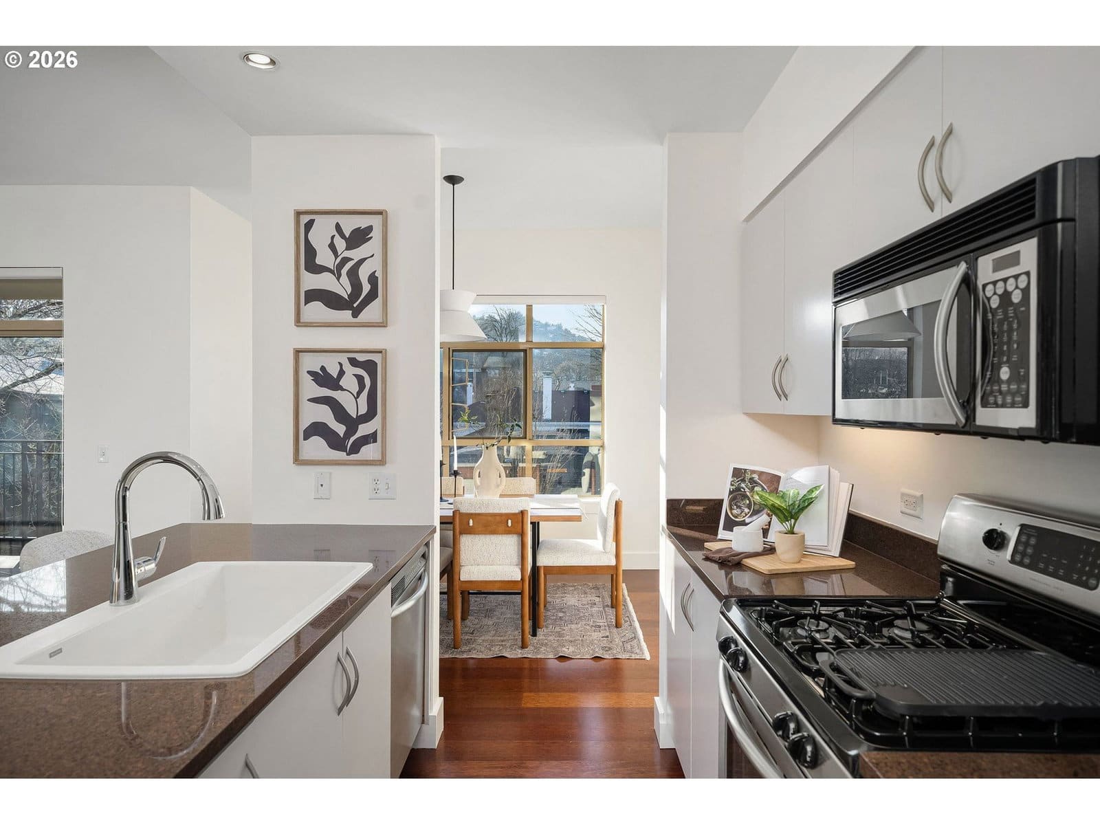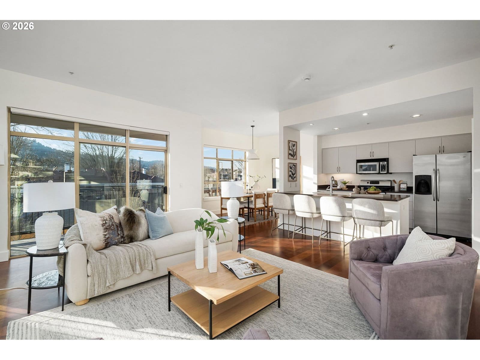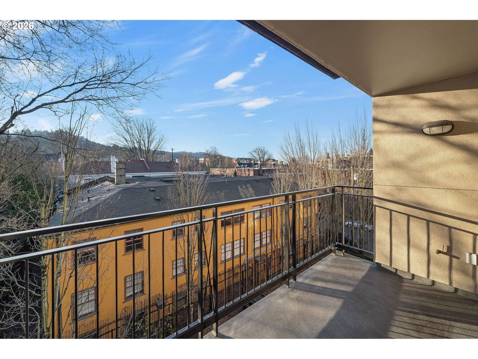 Set in the heart of Portland’s vibrant Alphabet District, this light-filled corner condo features a well-designed, functional floor plan with a focus on comfort, quality, and effortless city living. Located in Addison Condominiums—a boutique condo building nestled along tree-lined streets with a distinctive blend of historic architecture. Large windows, high ceilings, and three sliding glass doors provide an abundance of natural light, treetop views, and fresh air. The gas fireplace and built-ins add warmth and character, while the kitchen offers plenty of work space with the generous peninsula with bar seating and a pantry for additional storage. Step outside to a large private balcony—an extension of the living space—perfect for morning coffee, al fresco dining, or simply enjoying the surrounding greenery and neighborhood charm. Additional features include wood floors, a spacious walk-in closet in the primary bedroom, a stack-able washer & dryer, new paint throughout, new carpet in both bedrooms, new heat pump keeping the temperature just right no matter the weather, a deeded storage unit, and a deeded parking space in the gated garage.