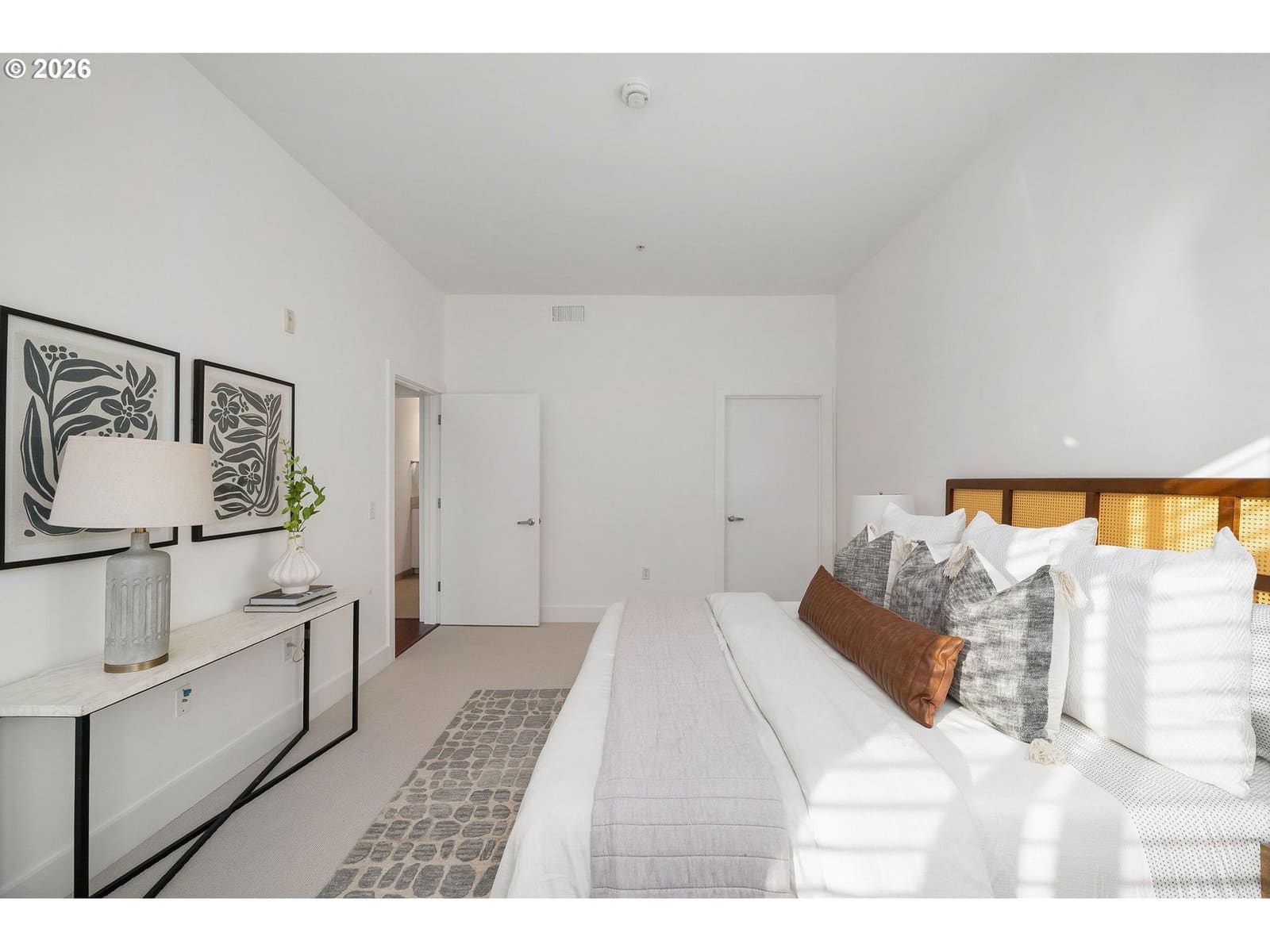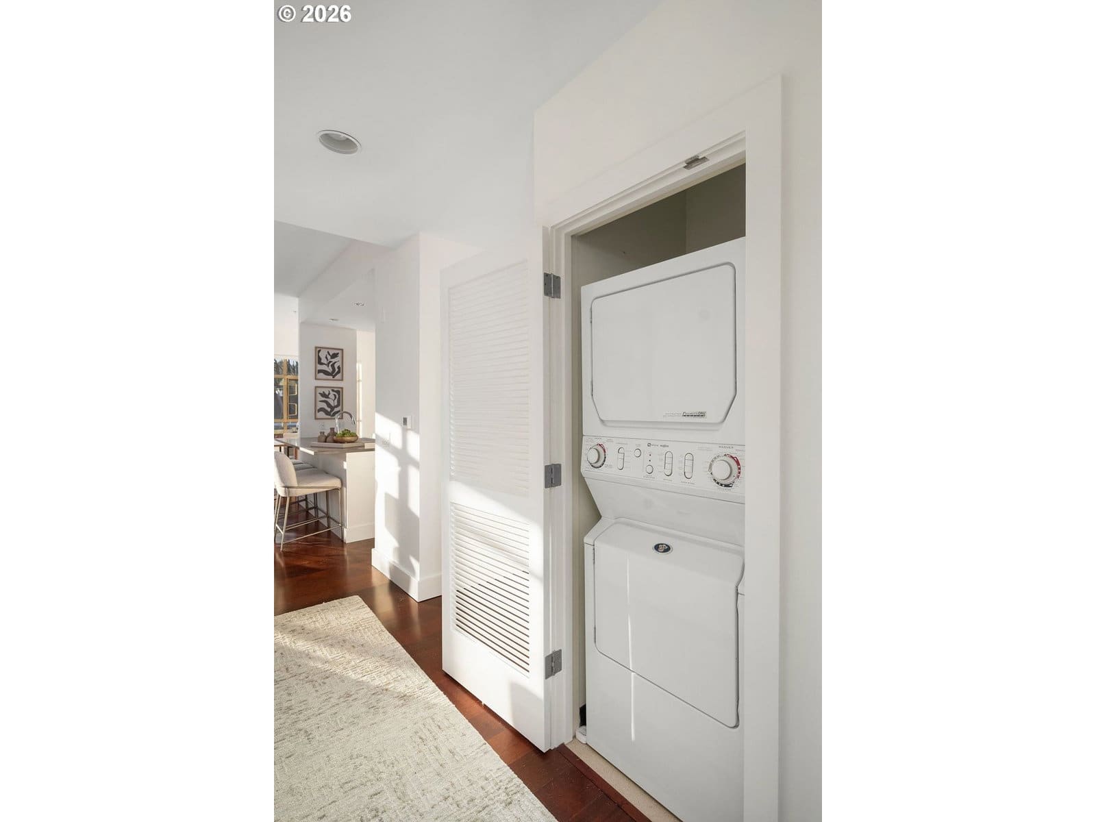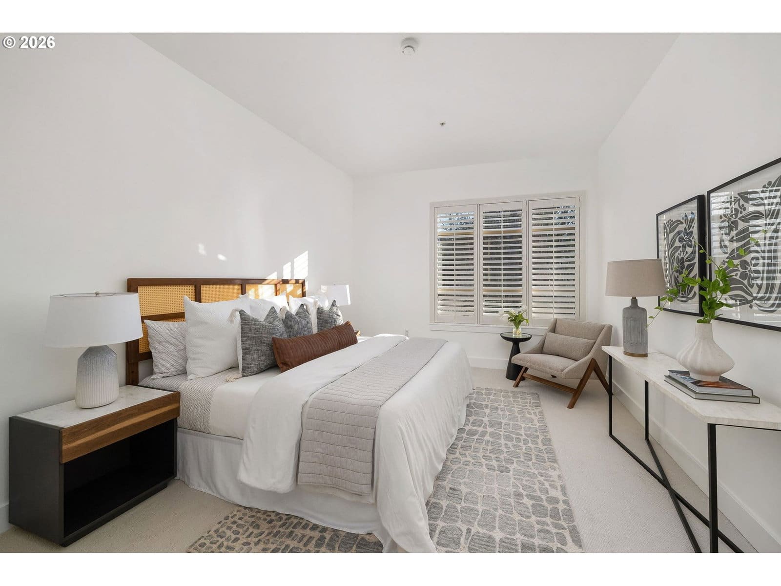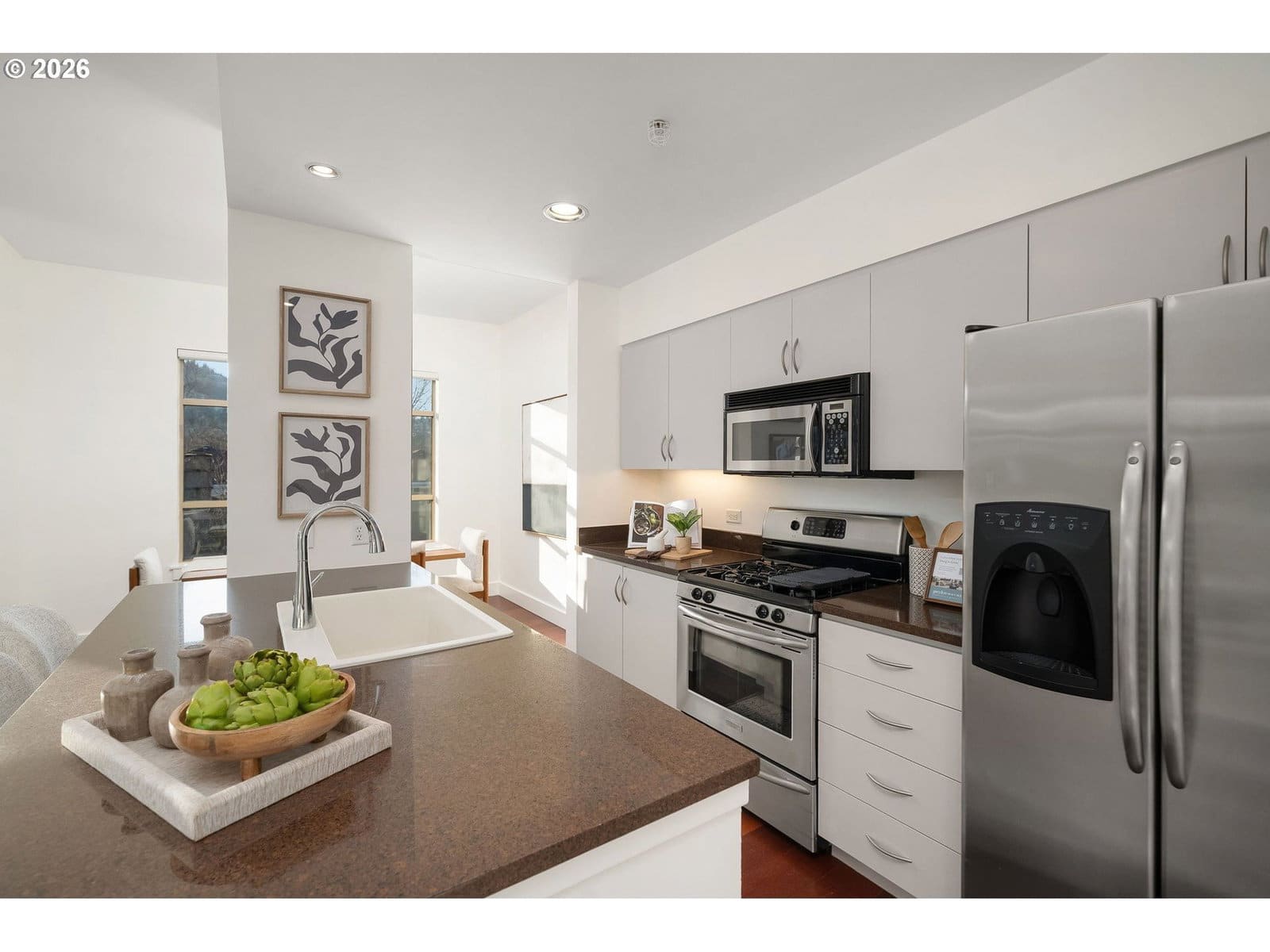 Set in the heart of Portland’s vibrant Alphabet District, this light-filled corner condo features a well-designed, functional floor plan with a focus on comfort, quality, and effortless city living. Located in Addison Condominiums—a boutique condo building nestled along tree-lined streets with a distinctive blend of historic architecture. Large windows, high ceilings, and three sliding glass doors provide an abundance of natural light, treetop views, and fresh air. The gas fireplace and built-ins add warmth and character, while the kitchen offers plenty of work space with the generous peninsula with bar seating and a pantry for additional storage. Step outside to a large private balcony—an extension of the living space—perfect for morning coffee, al fresco dining, or simply enjoying the surrounding greenery and neighborhood charm. Additional features include wood floors, a spacious walk-in closet in the primary bedroom, a stack-able washer & dryer, new paint throughout, new carpet in both bedrooms, new heat pump keeping the temperature just right no matter the weather, a deeded storage unit, and a deeded parking space in the gated garage.