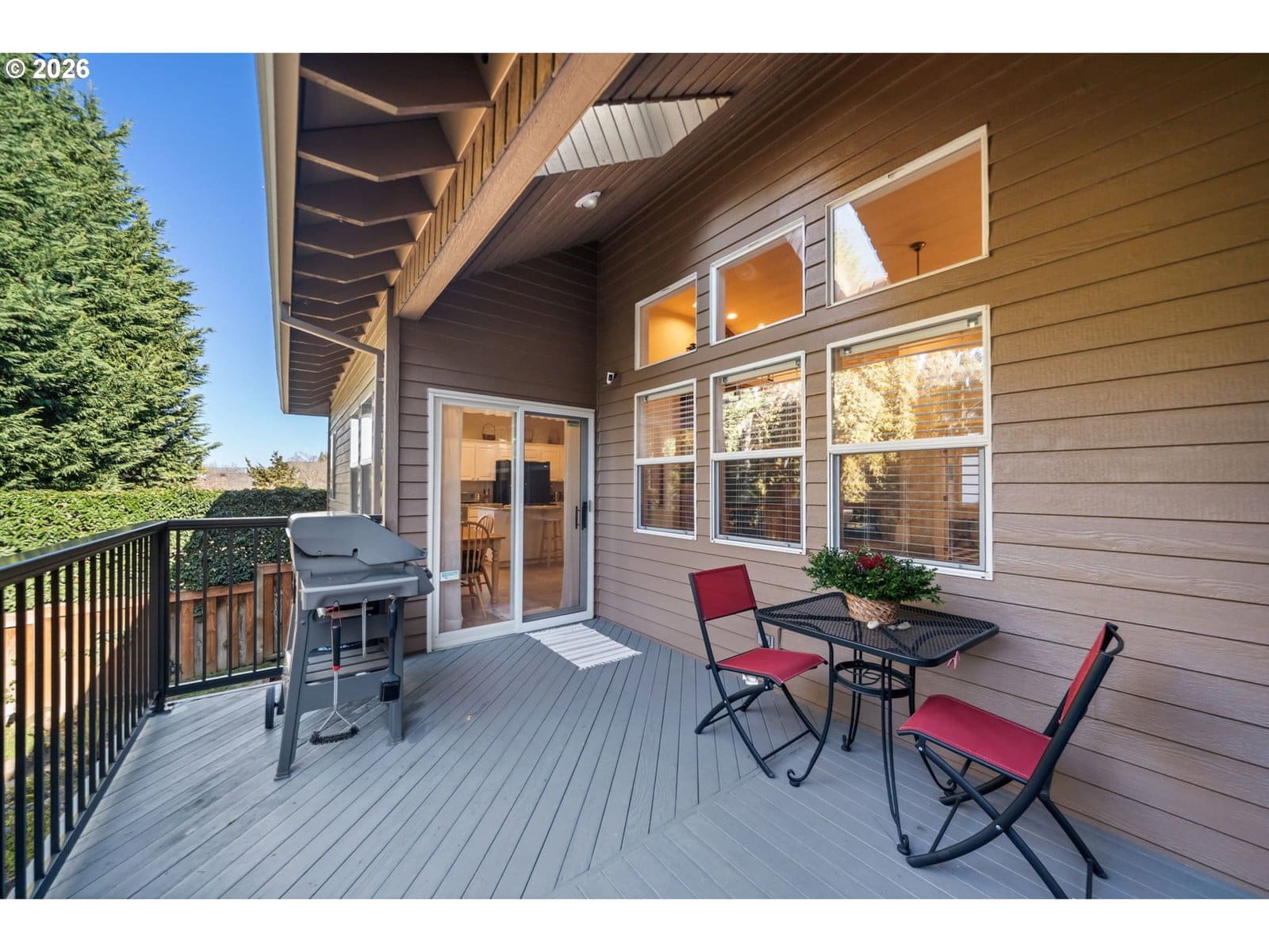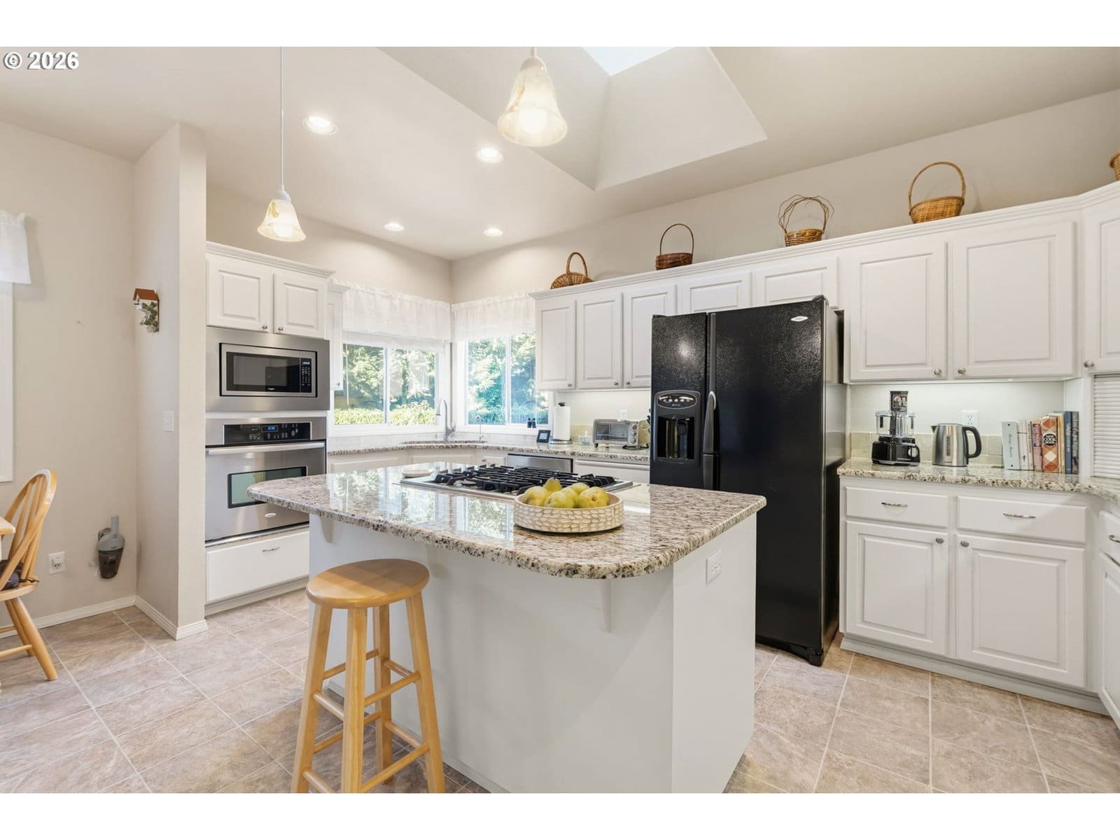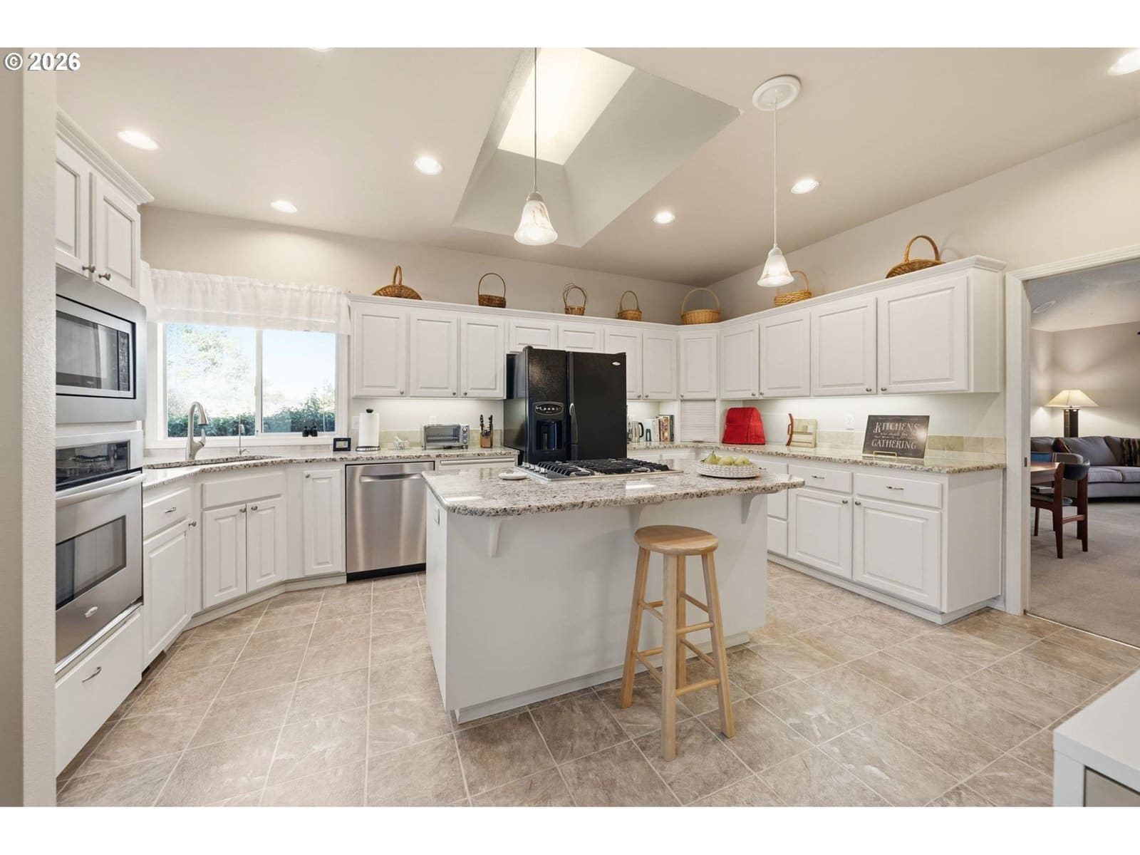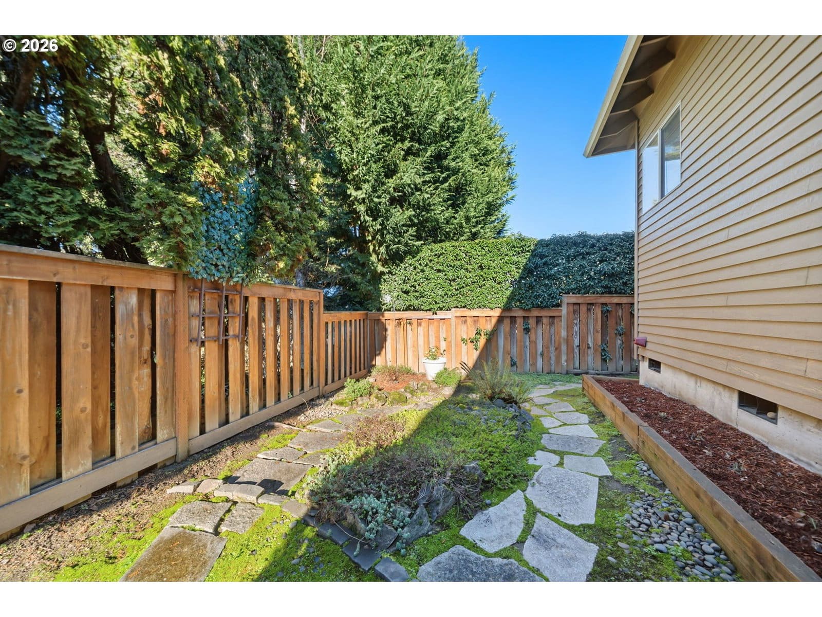 This custom one-level 3BR/2BA is just as neat as a pin and shows like new! Starting w outside, newer driveway, wide pathway to front door, and exterior paint all completed in 2020. Brickwork w ‘eyebrow’ archway leads to covered entry. Once inside black and white tiles on diagonal make for a pleasing and classic aesthetic. Formal living RM off to the right w double-sided fireplace shared w family RM. Continue thru to dining area w alcove for showcase or artwork. Head to kitchen w vaulted ceiling and skylight, white cabs, solid surface counters, 4-burner gas cook island w eating bar, Bosch dishwasher, built-in Whirlpool micro, and convection oven. Appliance garage, pantry, built-in desk, and eating nook. All feels spacious and open, light and bright. From eating nook, access covered wood deck w new railing in 2025. Enjoy outdoor gatherings and BBQ in all seasons! Family RM offers custom floor to ceiling wall unit and fireplace. Tall and vaulted ceilings. Warm neutral interior paint creates a very inviting appeal. Just off family RM double doors lead into a generous RETREAT of a primary suite leads to spacious en-suite offering a soak tub w waterfall adding to a spa-like appeal, separate shower, separate and private toilet. Dual sinks, solid surface countertop, and walk-in closet. This home has been lovingly maintained, lightly lived in w a ‘shoes off policy’. Carpet looks beautiful. HVAC system new in 2023. Beautifully landscaped and professionally maintained w front yard sprinklers. Backyard offers area for above ground gardening and storage space under deck. Largely privatized w fencing and tall arborvitae. Feels wonderfully private both inside and out. 3-car garage w painted floor. Great neighborhood and friendly Home Owner Association. Dues are $483 annually covers common areas and management. Wonderful proximity to Tualatin Hills Park & Rec, trails, parks, EZ access to HWY 26, quick commute to hi-tech, w endless options for shopping, groceries, dining, and more. Jenne Lake Park Project