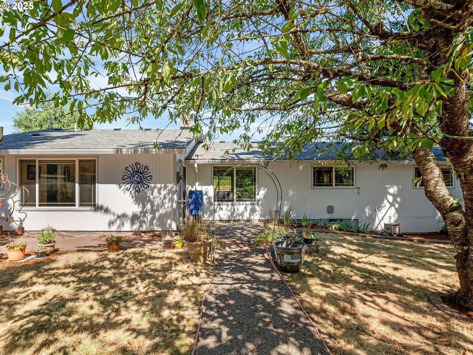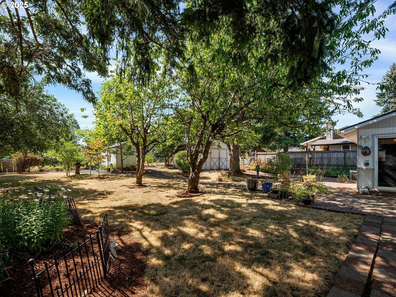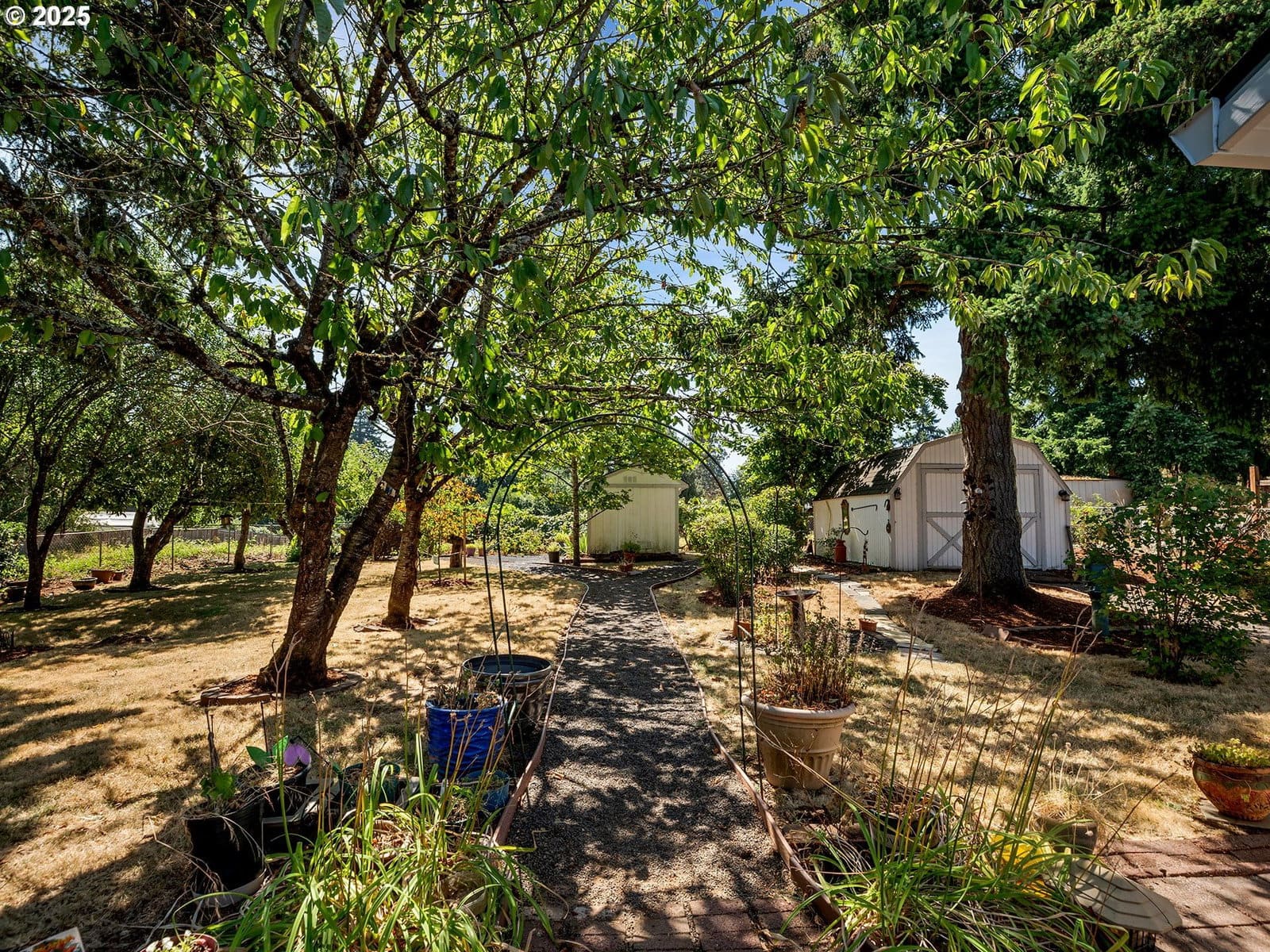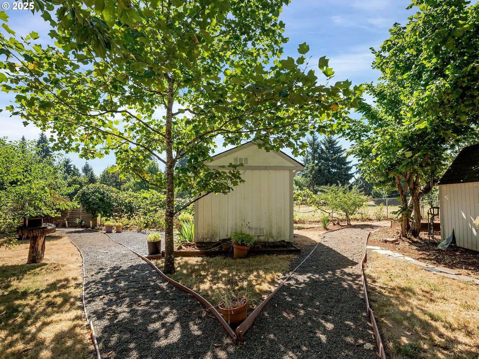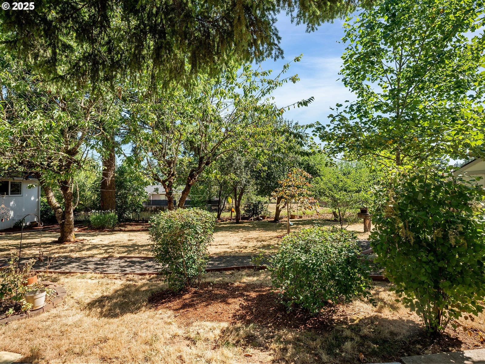 Open House Sunday 1/18 1:30pm to 3:30pm. Excellent single level home in the popular Finnegans neighborhood on a wonderful, lusciously landscaped large (0.28 acre) private lot surrounded by greenspace on three sides and with flowers galore and multiple fruit trees including apples, plums, cherries, a grape arbor and a filbert tree! This bountiful lot also has the convenience of a circular driveway, backyard patio and two sheds (12x16 & 12x8) for ample outdoor storage. Inside the easy flow floorplan consists of three bedrooms (two with new carpeting as of June 2025), two bathrooms, an extended kitchen for either additional work/storage space or an eat-in option. Use the center room for either a living room or dining room with a cozy fireplace and the additional room as you wish for bonus space. Other features include mostly solid surface floors, double paned vinyl windows with newer blinds throughout (approx 2019), updated kitchen in 2019 (with quartz countertops, soft close cabinets and drawers and pull out shelves), updated bathroom in 2025, water heater approx 6yrs old, HVAC (with central A/C) approx 4yrs old, newer roof (2025), updated paint inside and out (approx 2019), updated canned lighting added in 2024, crawlspace refresh including Visqueen vapor barrier and insulation (2024). Home also comes with a newer Generac generator and is part of the Clackamas River Water District. Annual HOA dues of $79/year are for greenspace and park/rec facility maintenance only.