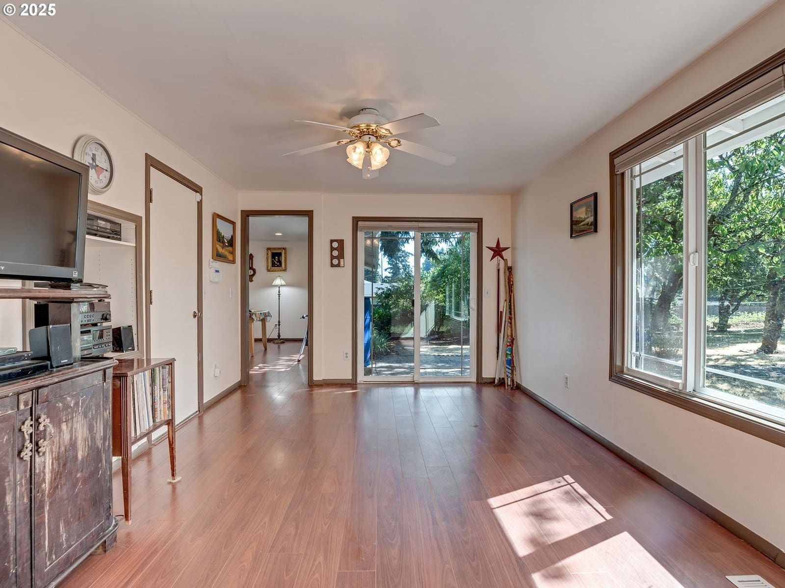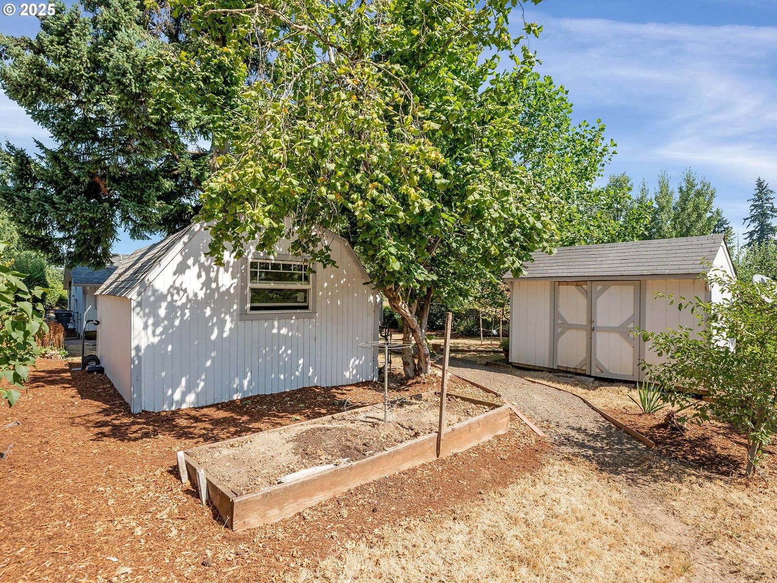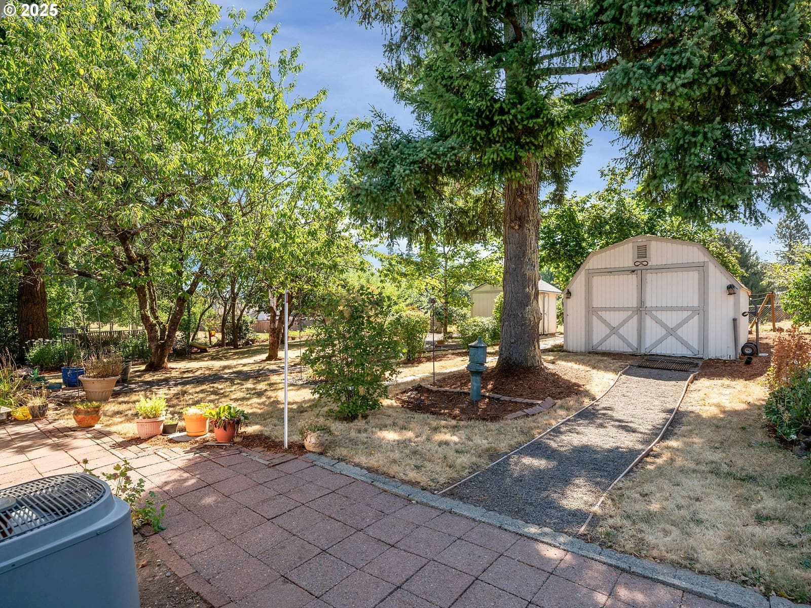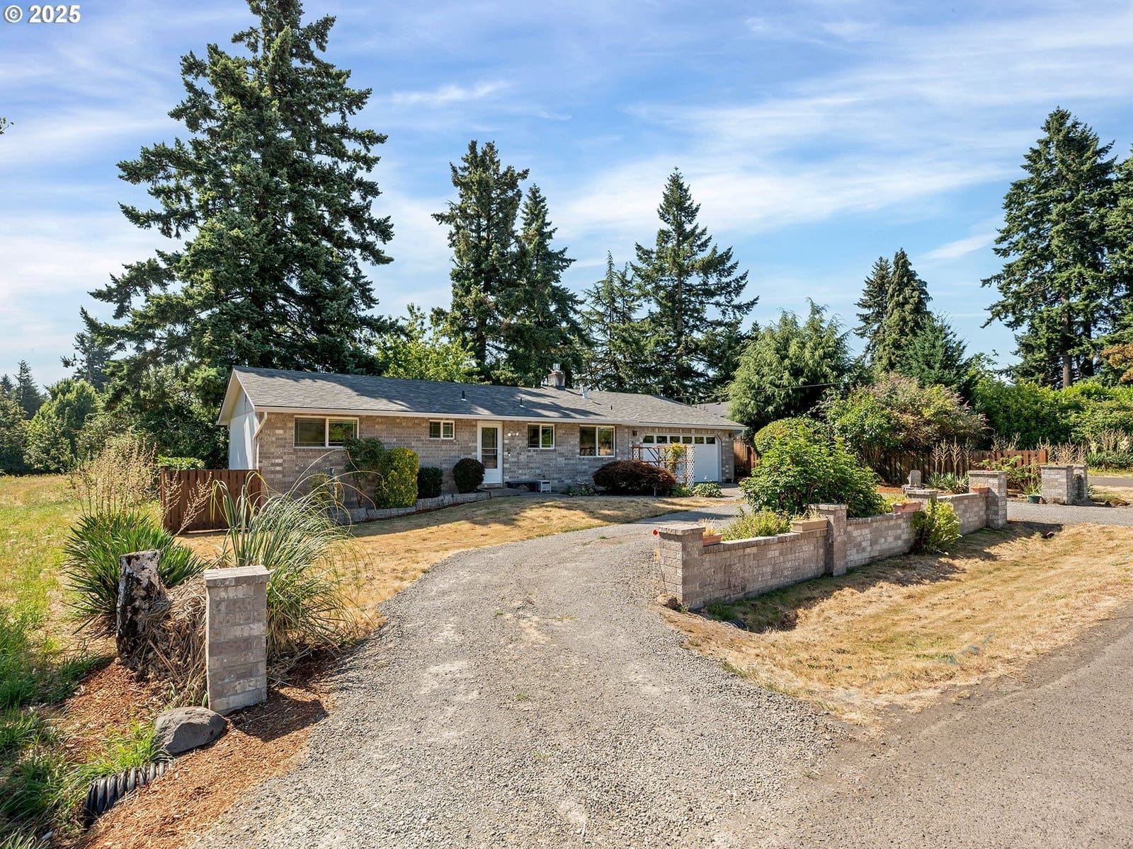 Open House Sunday 1/18 1:30pm to 3:30pm. Excellent single level home in the popular Finnegans neighborhood on a wonderful, lusciously landscaped large (0.28 acre) private lot surrounded by greenspace on three sides and with flowers galore and multiple fruit trees including apples, plums, cherries, a grape arbor and a filbert tree! This bountiful lot also has the convenience of a circular driveway, backyard patio and two sheds (12x16 & 12x8) for ample outdoor storage. Inside the easy flow floorplan consists of three bedrooms (two with new carpeting as of June 2025), two bathrooms, an extended kitchen for either additional work/storage space or an eat-in option. Use the center room for either a living room or dining room with a cozy fireplace and the additional room as you wish for bonus space. Other features include mostly solid surface floors, double paned vinyl windows with newer blinds throughout (approx 2019), updated kitchen in 2019 (with quartz countertops, soft close cabinets and drawers and pull out shelves), updated bathroom in 2025, water heater approx 6yrs old, HVAC (with central A/C) approx 4yrs old, newer roof (2025), updated paint inside and out (approx 2019), updated canned lighting added in 2024, crawlspace refresh including Visqueen vapor barrier and insulation (2024). Home also comes with a newer Generac generator and is part of the Clackamas River Water District. Annual HOA dues of $79/year are for greenspace and park/rec facility maintenance only.