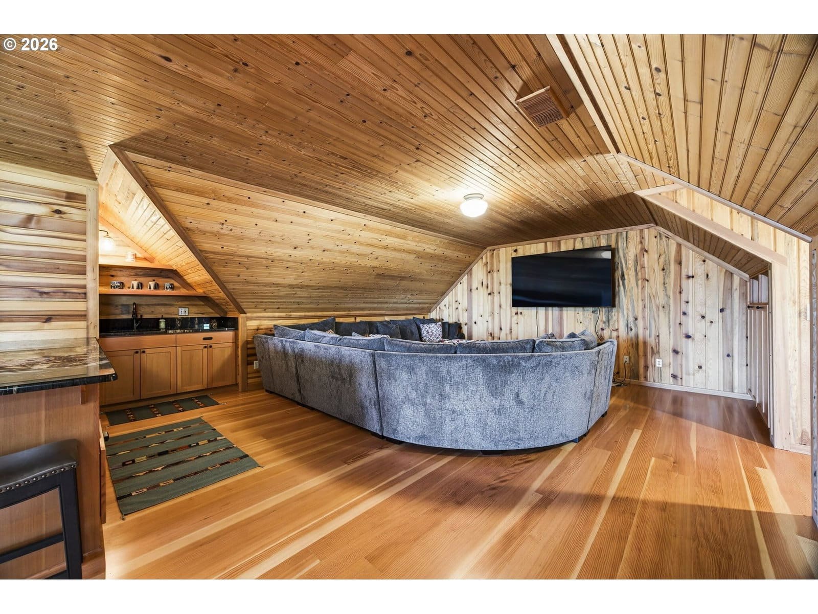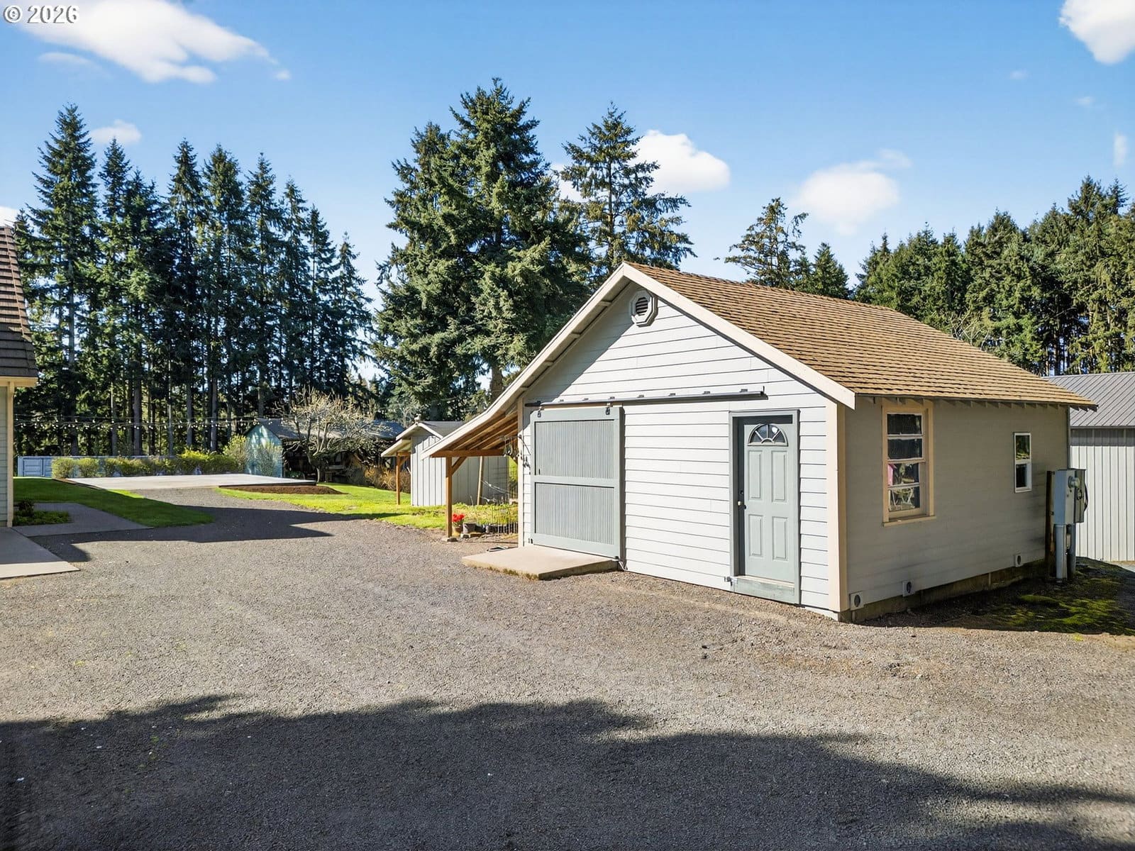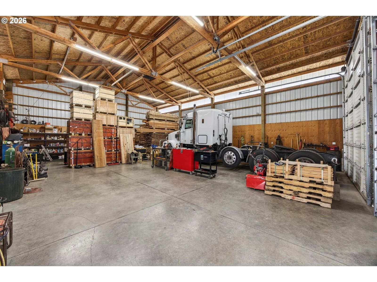 Set on 4 usable acres in the desirable Hubbard countryside, this exceptional custom-built estate offers a rare blend of luxury living and true business-ready functionality. Designed with craftsmanship and longevity in mind, the home showcases extensive use of grand fir, Oregon white oak, black walnut, blue pine, and cedar throughout, creating a warm, refined interior. Vaulted ceilings and abundant natural light highlight the open living spaces, while the main-level primary suite offers a private retreat with a beautifully finished ensuite. The chef’s kitchen features solid fir cabinetry, granite countertops, double ovens, and a walk-in pantry, flowing into a spacious great room with exterior access for seamless indoor-outdoor entertaining. An expansive concrete patio provides ideal space for gatherings, while the front of the home captures views of Mt. Hood. Flooring includes matching 1-inch thick boards with white oak, acacia, and fir throughout. Upstairs features four additional bedrooms for a true 5-bedroom layout, along with a large bonus room with wet bar, peninsula, and separation from the main living areas—perfect for guests or flexible use. The property is equipped with 400-amp service split between the home and outbuildings, with individual circuits throughout. A tile lifetime roof and natural materials reflect the level of build quality. The exterior is equally impressive with a 36x48 shop, loft, covered areas, and additional outbuildings. The lower level of the main shop offers potential for conversion to horse stalls. A full loop, pull-through driveway allows easy access for larger vehicles, including trucks, and includes a wash station. The rear pasture, framed by mature trees and currently maintained by grazing sheep, features a year-round creek, creating a private, park-like setting ideal for livestock or recreation. Septic and well systems are in good working order. Conveniently located minutes to I-5 with access to Wilsonville, Salem, and Portland. Main shop measures 36x48 with a 24x60 lower level and a 12x48 enclosed loft above. A 28x36 equipment shed is currently used for vehicle storage. 8x8 pump house. 20x22 utility/storage building with an attached 8x16 kennel.
