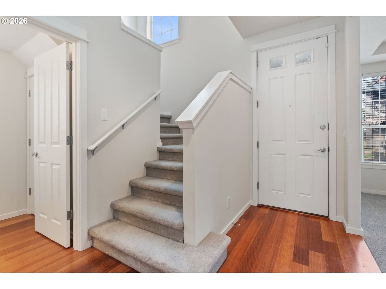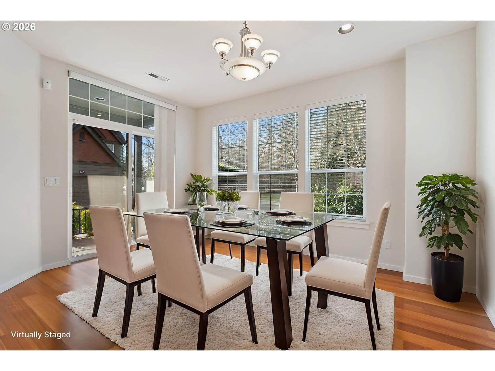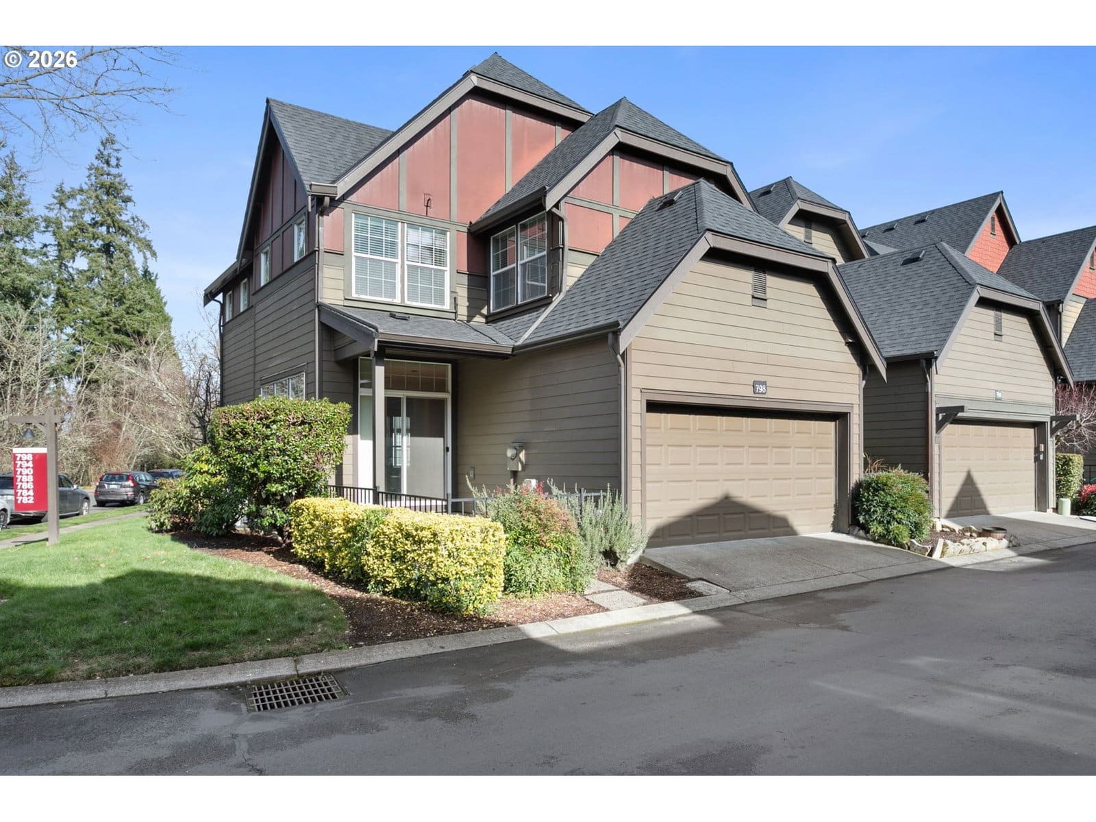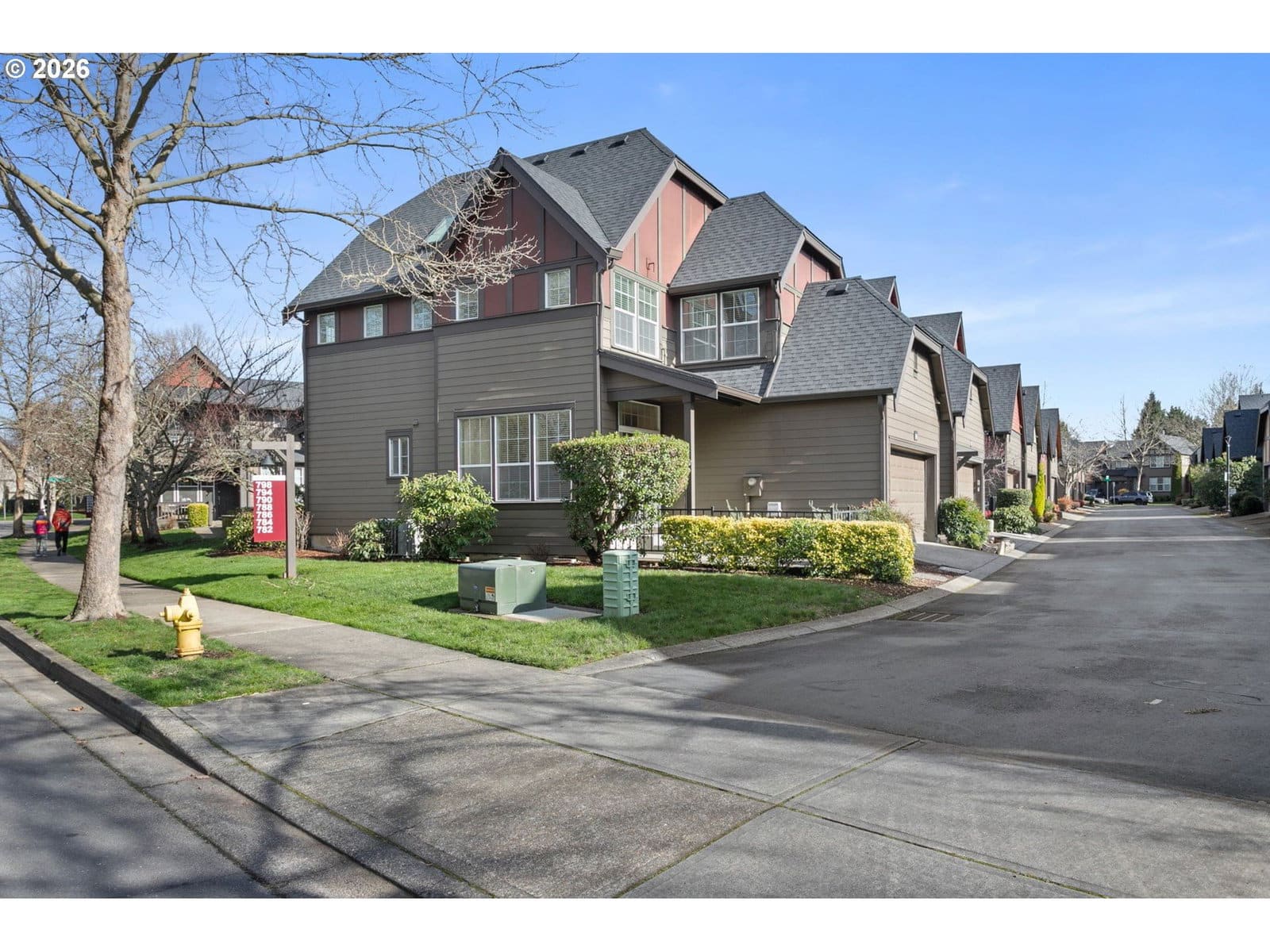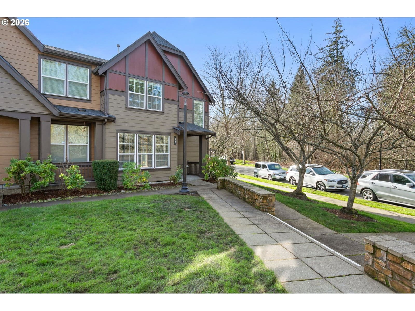 Light-filled end-unit townhome on a desirable corner lot, offering 1,704 SF of open and inviting living space. Enjoy cozying up by the fireplace in the spacious living room with new carpet. The property also features fresh interior paint. Gleaming hardwood floors welcome you in the entry and span throughout the kitchen and dining room. Upstairs you'll find the spacious primary suite with an en-suite bathroom featuring a modern vanity with double sinks and new walk-in shower, along with 2 additional bedrooms and the laundry room. While the two-car garage adds everyday convenience. Step outside to a lovely gated patio—perfect for entertaining or unwinding next a peaceful treed greenspace. Ideally located to Orenco Station MAX, popular restaurants and shops, New Seasons, Nike, Intel, and quick Hwy 26 access for an easy commute. [Home Energy Score = 6. HES Report at https://rpt.greenbuildingregistry.com/hes/OR10244236]