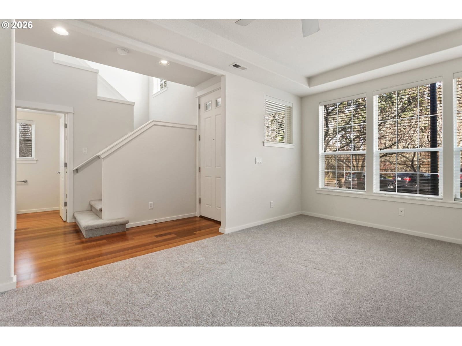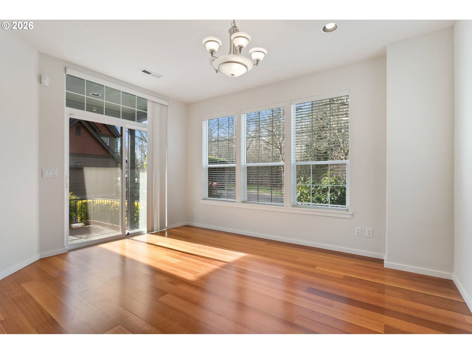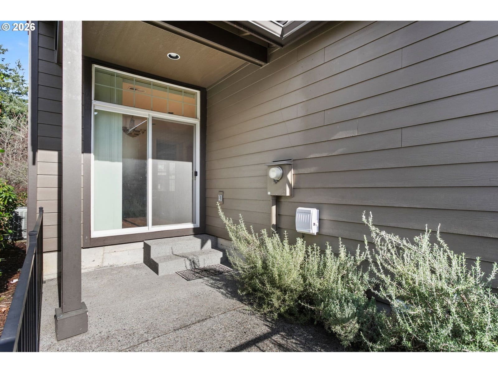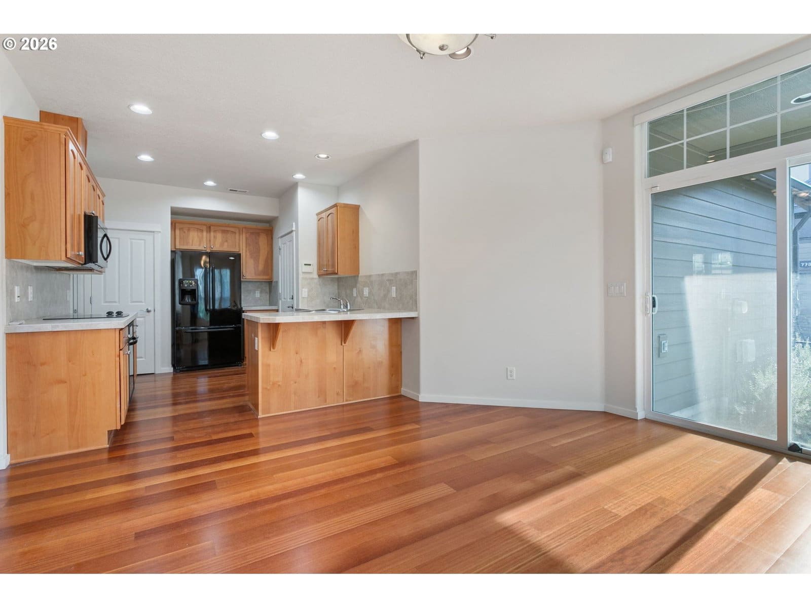 Light-filled end-unit townhome on a desirable corner lot, offering 1,704 SF of open and inviting living space. Enjoy cozying up by the fireplace in the spacious living room with new carpet. The property also features fresh interior paint. Gleaming hardwood floors welcome you in the entry and span throughout the kitchen and dining room. Upstairs you'll find the spacious primary suite with an en-suite bathroom featuring a modern vanity with double sinks and new walk-in shower, along with 2 additional bedrooms and the laundry room. While the two-car garage adds everyday convenience. Step outside to a lovely gated patio—perfect for entertaining or unwinding next a peaceful treed greenspace. Ideally located to Orenco Station MAX, popular restaurants and shops, New Seasons, Nike, Intel, and quick Hwy 26 access for an easy commute. [Home Energy Score = 6. HES Report at https://rpt.greenbuildingregistry.com/hes/OR10244236]
