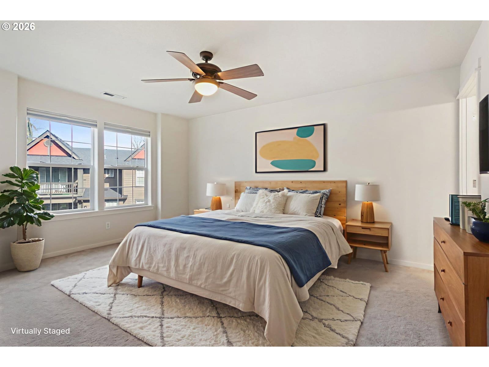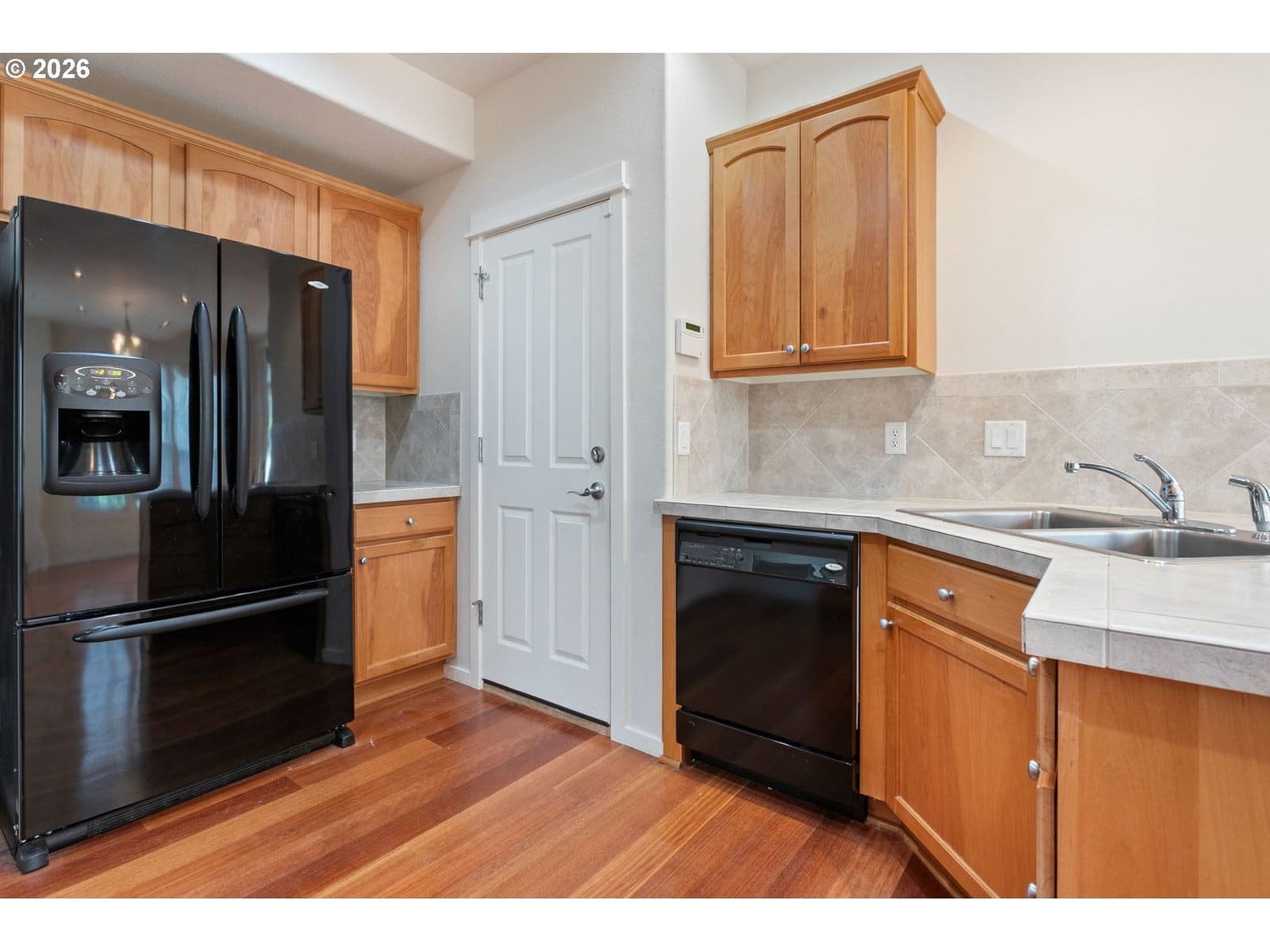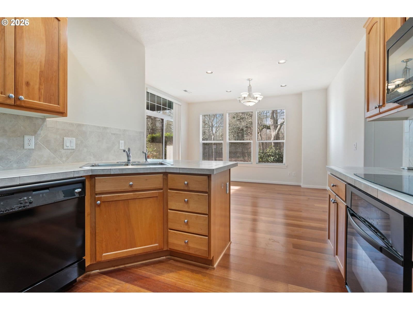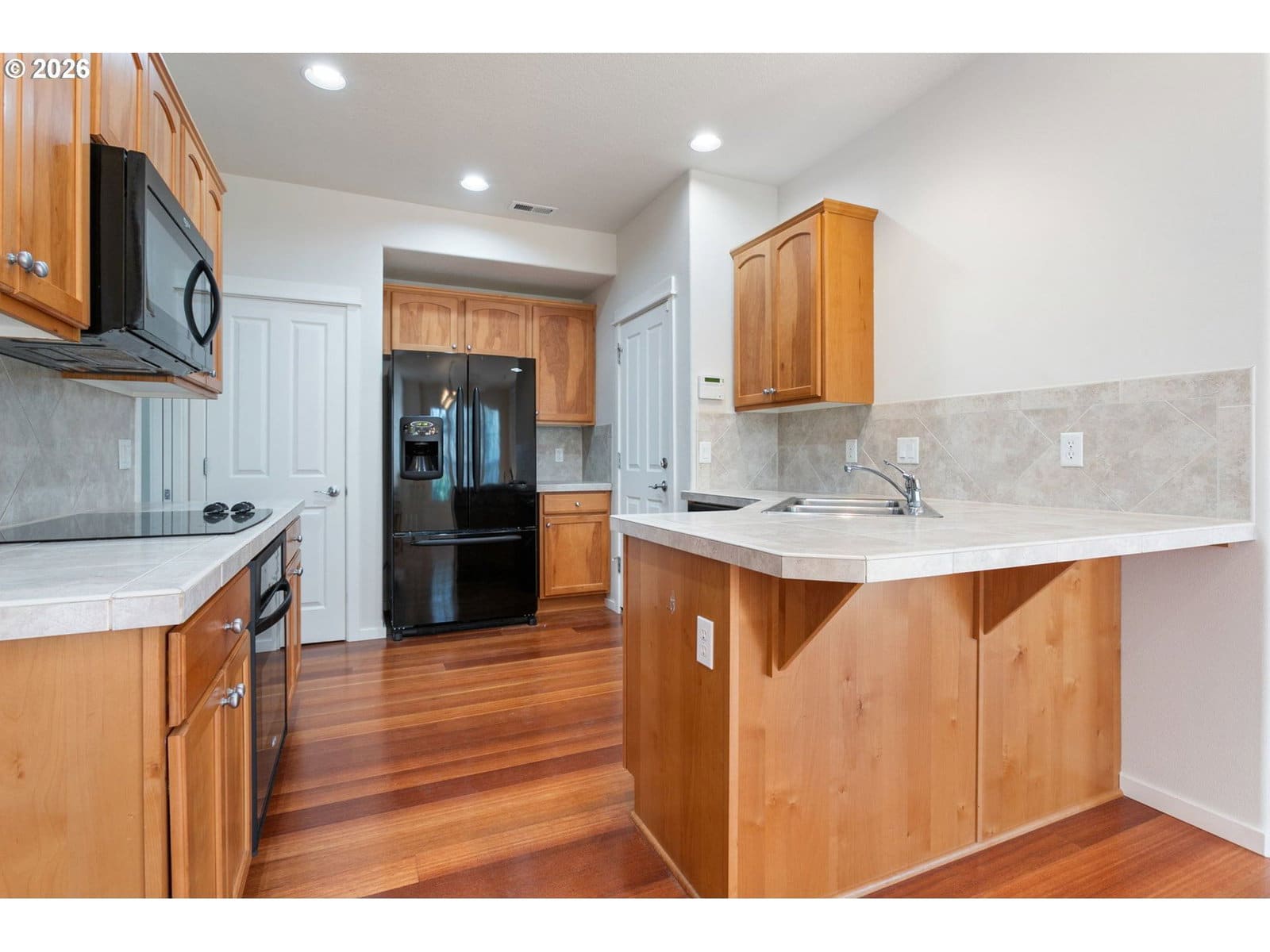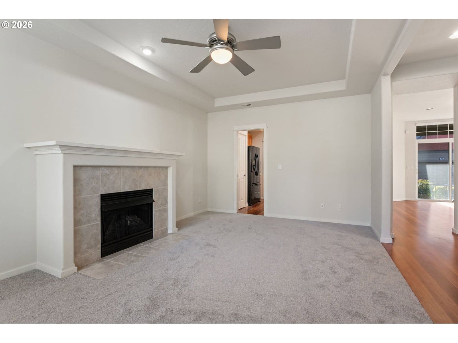 Light-filled end-unit townhome on a desirable corner lot, offering 1,704 SF of open and inviting living space. Enjoy cozying up by the fireplace in the spacious living room with new carpet. The property also features fresh interior paint. Gleaming hardwood floors welcome you in the entry and span throughout the kitchen and dining room. Upstairs you'll find the spacious primary suite with an en-suite bathroom featuring a modern vanity with double sinks and new walk-in shower, along with 2 additional bedrooms and the laundry room. While the two-car garage adds everyday convenience. Step outside to a lovely gated patio—perfect for entertaining or unwinding next a peaceful treed greenspace. Ideally located to Orenco Station MAX, popular restaurants and shops, New Seasons, Nike, Intel, and quick Hwy 26 access for an easy commute. [Home Energy Score = 6. HES Report at https://rpt.greenbuildingregistry.com/hes/OR10244236]