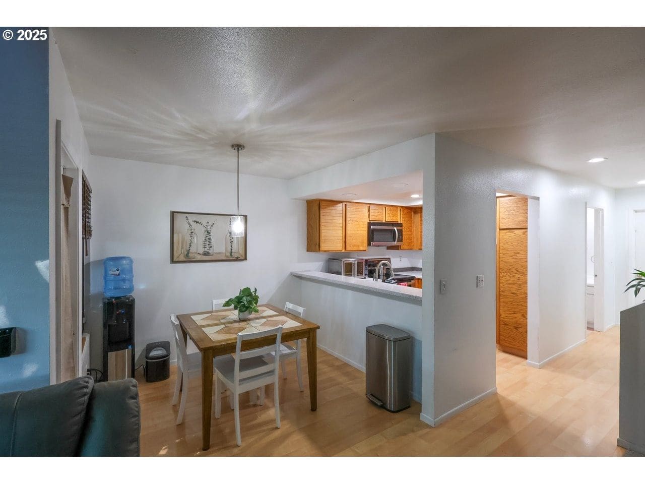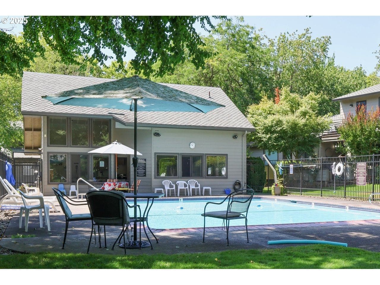 Experience serene, treelined living in this open, light-filled 2-story condo nestled at the end of a quiet lane. Featuring vaulted ceilings, skylights, and a cozy brick hearth fireplace in the great room. Enjoy a kitchen with stainless appliances, laminate floors, and inside laundry for daily convenience. The upstairs master suite includes a vaulted ceiling, walk-in closet, and private balcony overlooking lush greenery. Outside, unwind in the covered patio or take full advantage of the amenities: refreshing pool, clubhouse, parking in your attached one-car garage, and well-managed HOA. Plenty of visitor parking and conveniently located just minutes from shopping, dining, and major highways for an easy commute to PDX offering the ideal blend of peaceful living and everyday convenience.
