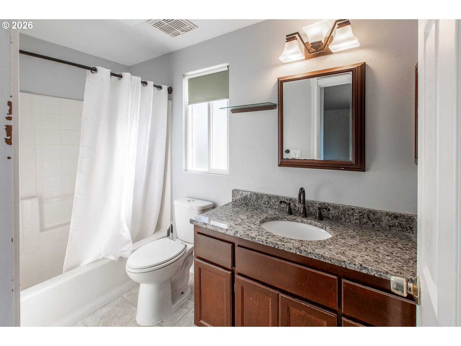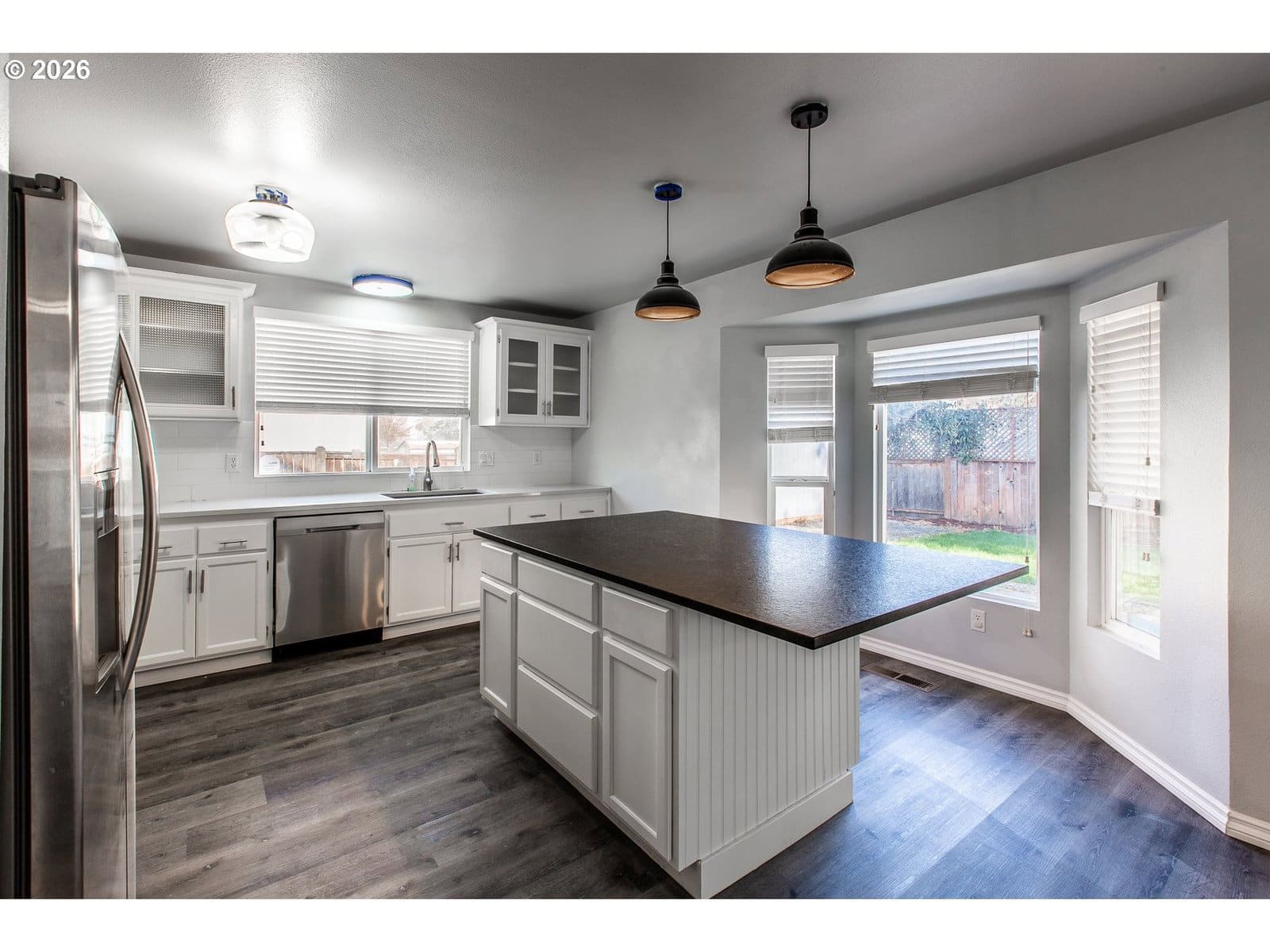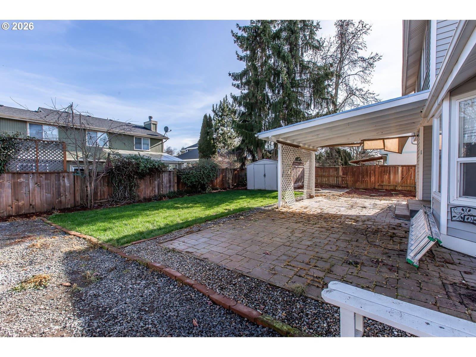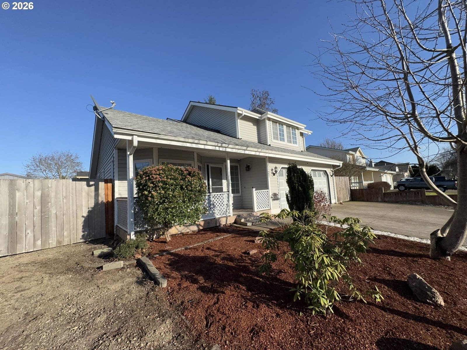 Welcome to this beautifully updated home offering comfort and modern style in one of Eugene’s most desirable areas near parks, shopping, the freeway and more! The covered front porch is an inviting entryway and from the moment you step inside, you’ll appreciate the light-filled interior and open, welcoming layout. The main living area features new flooring that flows seamlessly throughout the home. There are fresh welcoming paint tones, new trim, new vanities, new light fixtures, new carpet, high ceilings & abundant natural light. The kitchen features updated and freshly painted cabinetry, quartz countertops, modern hardware, new microwave, stainless steel appliances, and ample counter space designed for both cooking & entertaining. A generous center island provides additional prep space and seating, making it perfect for casual meals or social gatherings. Contemporary pendant lighting adds style & warmth. French doors provide easy access to the backyard, seamlessly connecting indoor and outdoor living. The cozy den offers a bay window, wood burning fireplace, guest bathroom and connected laundry room. Upstairs the bedrooms are well-proportioned and thoughtfully laid out. Each bedroom offers comfortable space, and ample closet storage. The primary bedroom provides a peaceful retreat with room for a king-sized bed, plush carpet, dual closets and a modern bathroom, making it a true sanctuary after a long day. The backyard is a canvas with low maintenance landscaping. There is a paver patio and covered area, creating an inviting outdoor setting ideal for summer barbecues, morning coffee, or relaxing evenings. The fully fenced backyard offers privacy and versatility, perfect for pets, gardening, play, or entertaining. There is a large storage shed for tools and equipment, fresh sod, and room to park a large RV and boat with two gates for recreational equipment parking. All of this and an oversized garage!