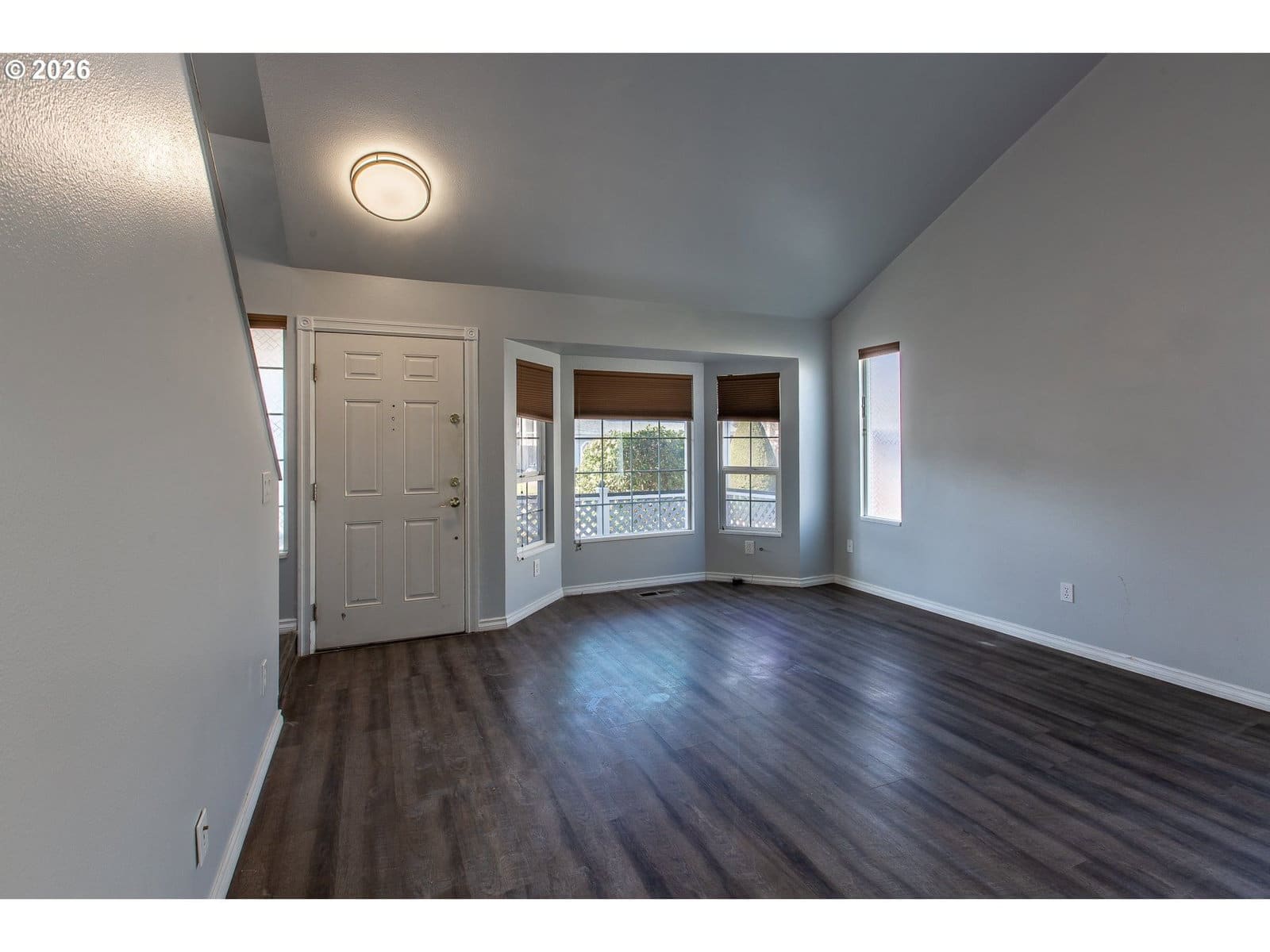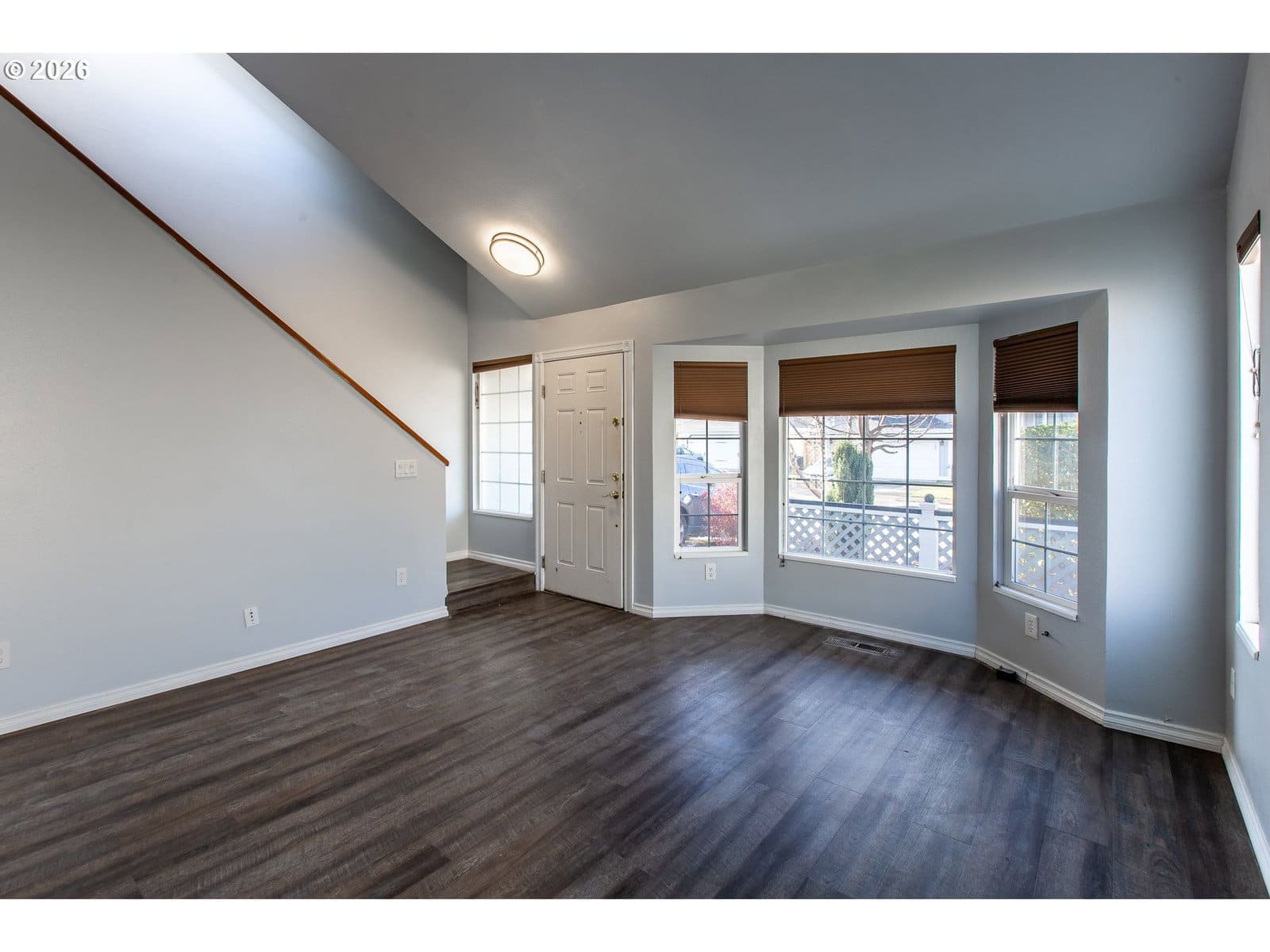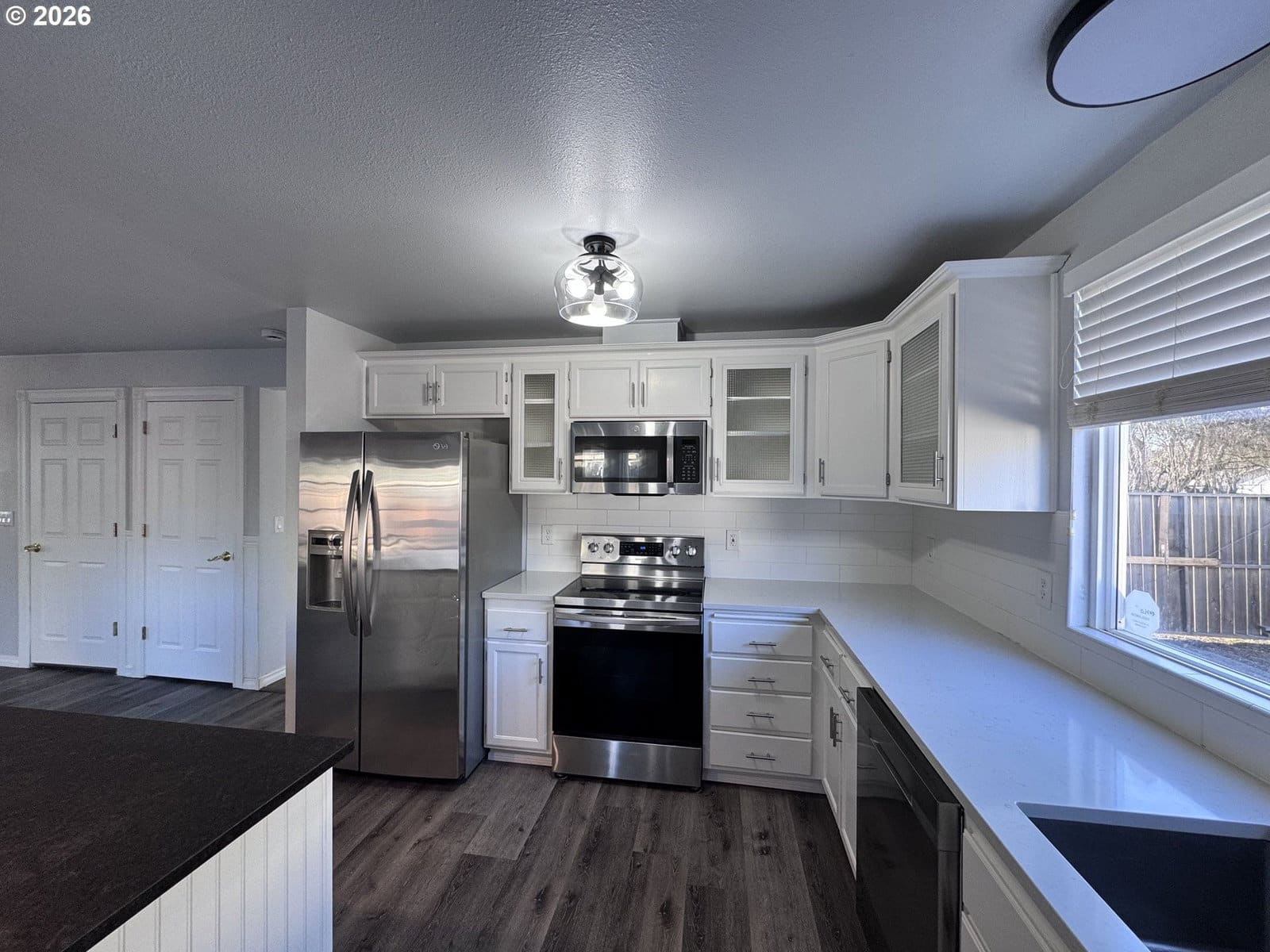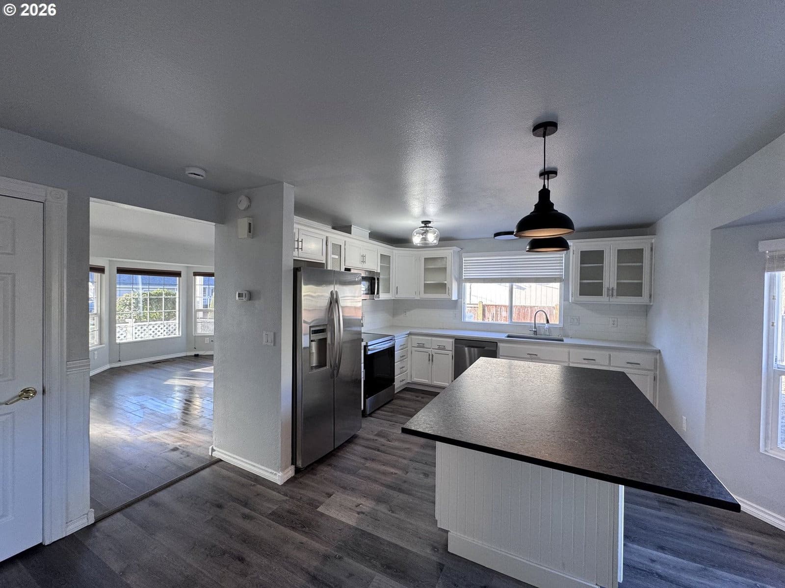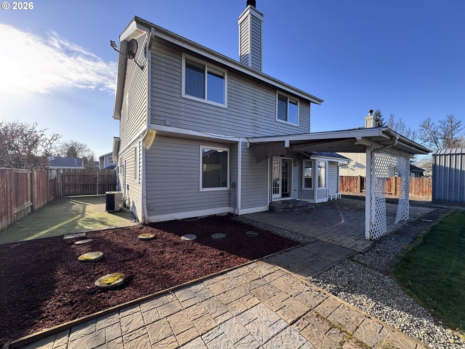 Welcome to this beautifully updated home offering comfort and modern style in one of Eugene’s most desirable areas near parks, shopping, the freeway and more! The covered front porch is an inviting entryway and from the moment you step inside, you’ll appreciate the light-filled interior and open, welcoming layout. The main living area features new flooring that flows seamlessly throughout the home. There are fresh welcoming paint tones, new trim, new vanities, new light fixtures, new carpet, high ceilings & abundant natural light. The kitchen features updated and freshly painted cabinetry, quartz countertops, modern hardware, new microwave, stainless steel appliances, and ample counter space designed for both cooking & entertaining. A generous center island provides additional prep space and seating, making it perfect for casual meals or social gatherings. Contemporary pendant lighting adds style & warmth. French doors provide easy access to the backyard, seamlessly connecting indoor and outdoor living. The cozy den offers a bay window, wood burning fireplace, guest bathroom and connected laundry room. Upstairs the bedrooms are well-proportioned and thoughtfully laid out. Each bedroom offers comfortable space, and ample closet storage. The primary bedroom provides a peaceful retreat with room for a king-sized bed, plush carpet, dual closets and a modern bathroom, making it a true sanctuary after a long day. The backyard is a canvas with low maintenance landscaping. There is a paver patio and covered area, creating an inviting outdoor setting ideal for summer barbecues, morning coffee, or relaxing evenings. The fully fenced backyard offers privacy and versatility, perfect for pets, gardening, play, or entertaining. There is a large storage shed for tools and equipment, fresh sod, and room to park a large RV and boat with two gates for recreational equipment parking. All of this and an oversized garage!