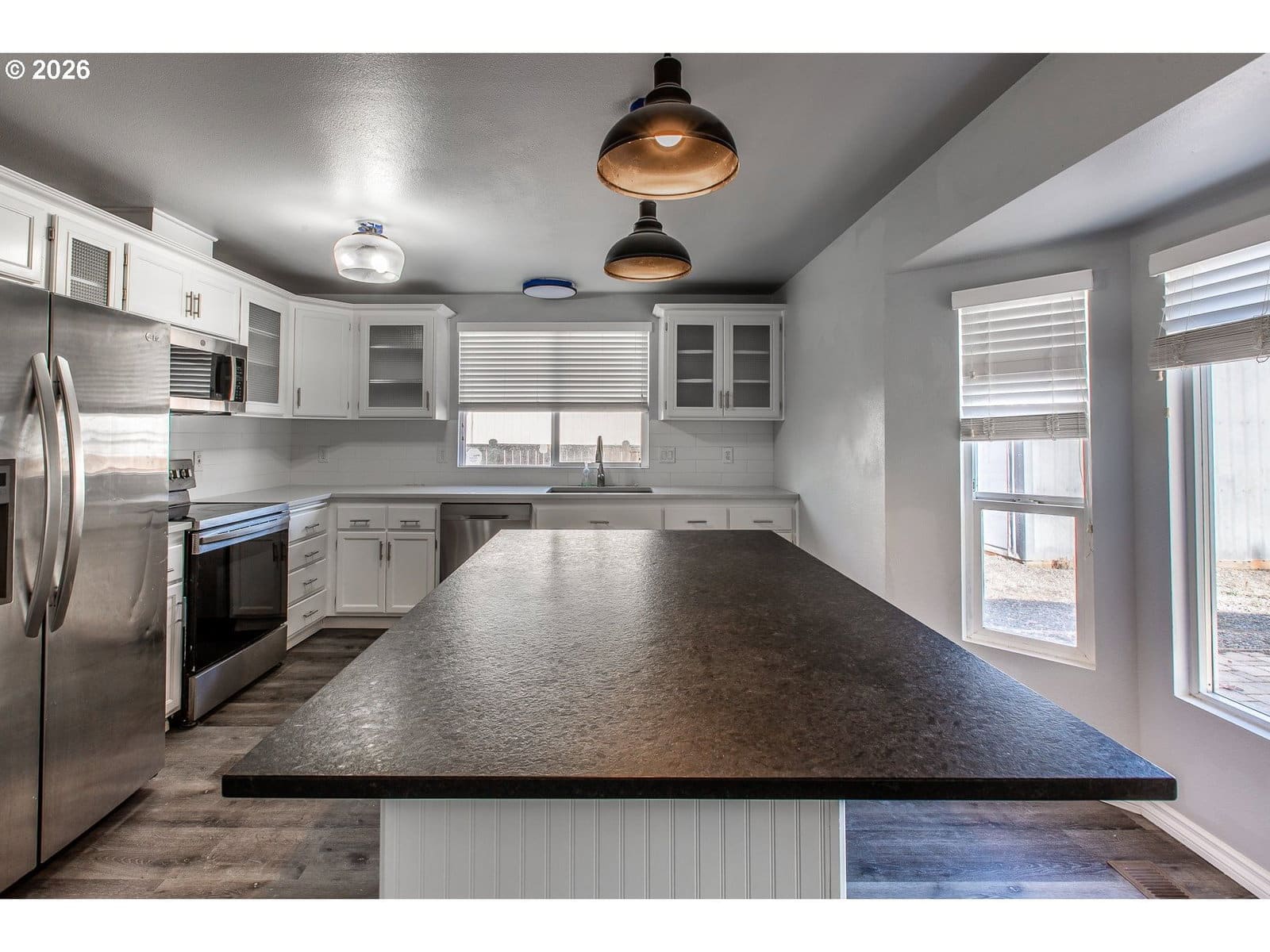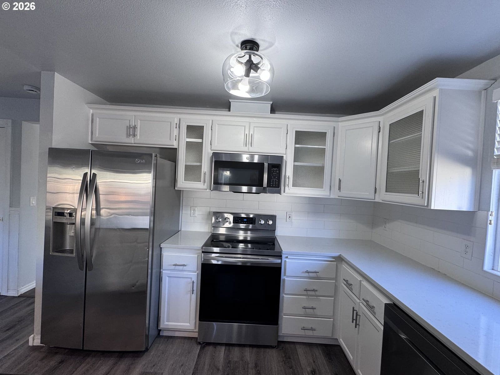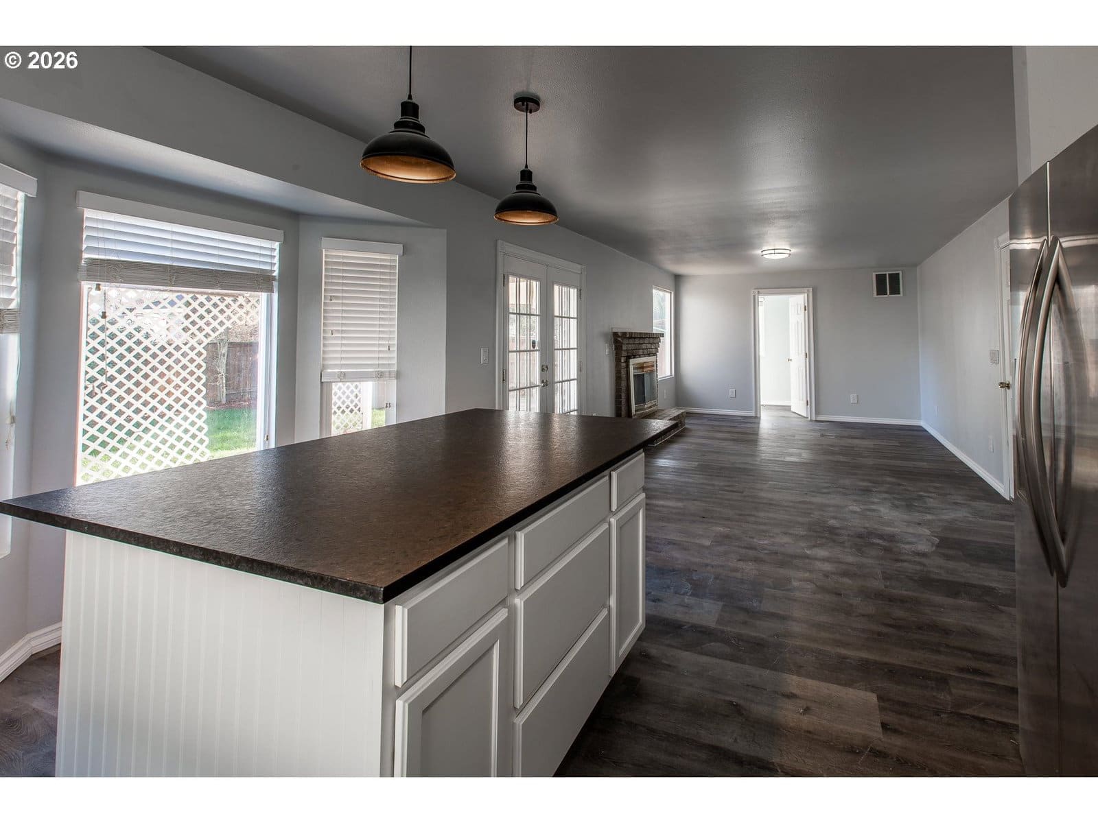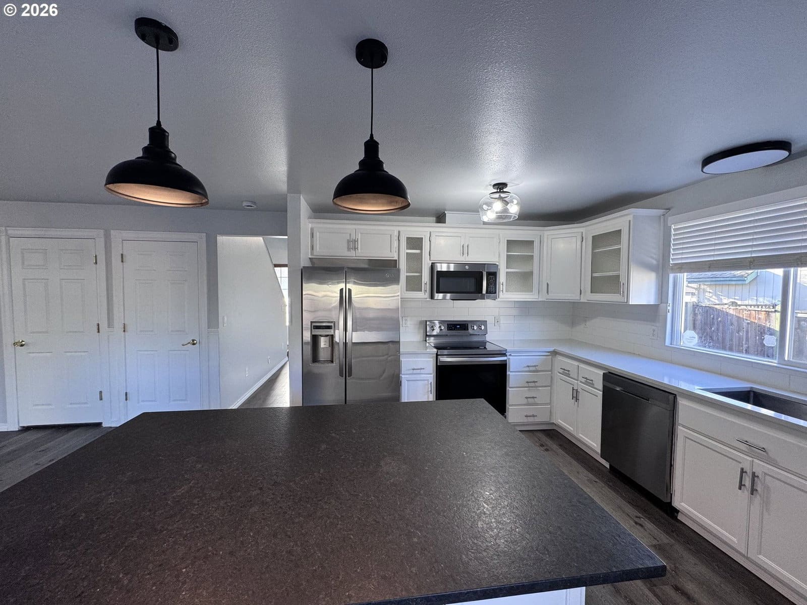 Welcome to this beautifully updated home offering comfort and modern style in one of Eugene’s most desirable areas near parks, shopping, the freeway and more! The covered front porch is an inviting entryway and from the moment you step inside, you’ll appreciate the light-filled interior and open, welcoming layout. The main living area features new flooring that flows seamlessly throughout the home. There are fresh welcoming paint tones, new trim, new vanities, new light fixtures, new carpet, high ceilings & abundant natural light. The kitchen features updated and freshly painted cabinetry, quartz countertops, modern hardware, new microwave, stainless steel appliances, and ample counter space designed for both cooking & entertaining. A generous center island provides additional prep space and seating, making it perfect for casual meals or social gatherings. Contemporary pendant lighting adds style & warmth. French doors provide easy access to the backyard, seamlessly connecting indoor and outdoor living. The cozy den offers a bay window, wood burning fireplace, guest bathroom and connected laundry room. Upstairs the bedrooms are well-proportioned and thoughtfully laid out. Each bedroom offers comfortable space, and ample closet storage. The primary bedroom provides a peaceful retreat with room for a king-sized bed, plush carpet, dual closets and a modern bathroom, making it a true sanctuary after a long day. The backyard is a canvas with low maintenance landscaping. There is a paver patio and covered area, creating an inviting outdoor setting ideal for summer barbecues, morning coffee, or relaxing evenings. The fully fenced backyard offers privacy and versatility, perfect for pets, gardening, play, or entertaining. There is a large storage shed for tools and equipment, fresh sod, and room to park a large RV and boat with two gates for recreational equipment parking. All of this and an oversized garage!