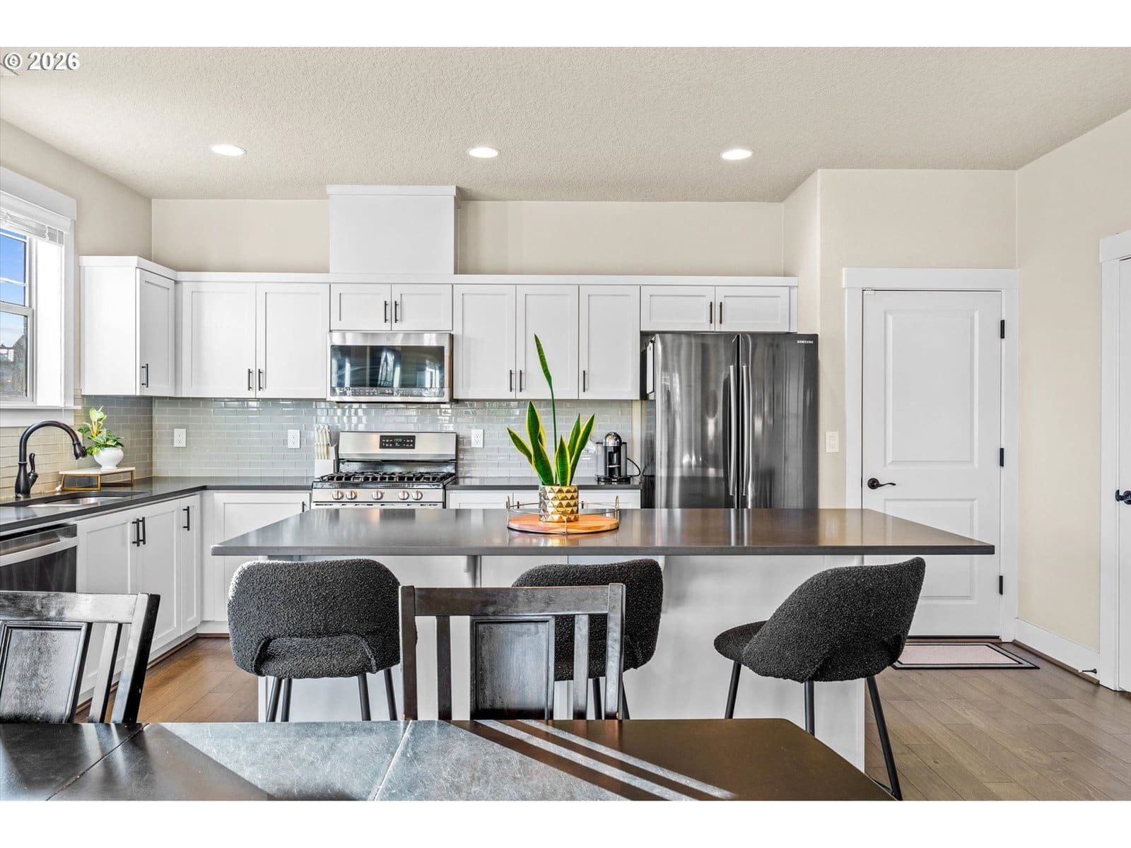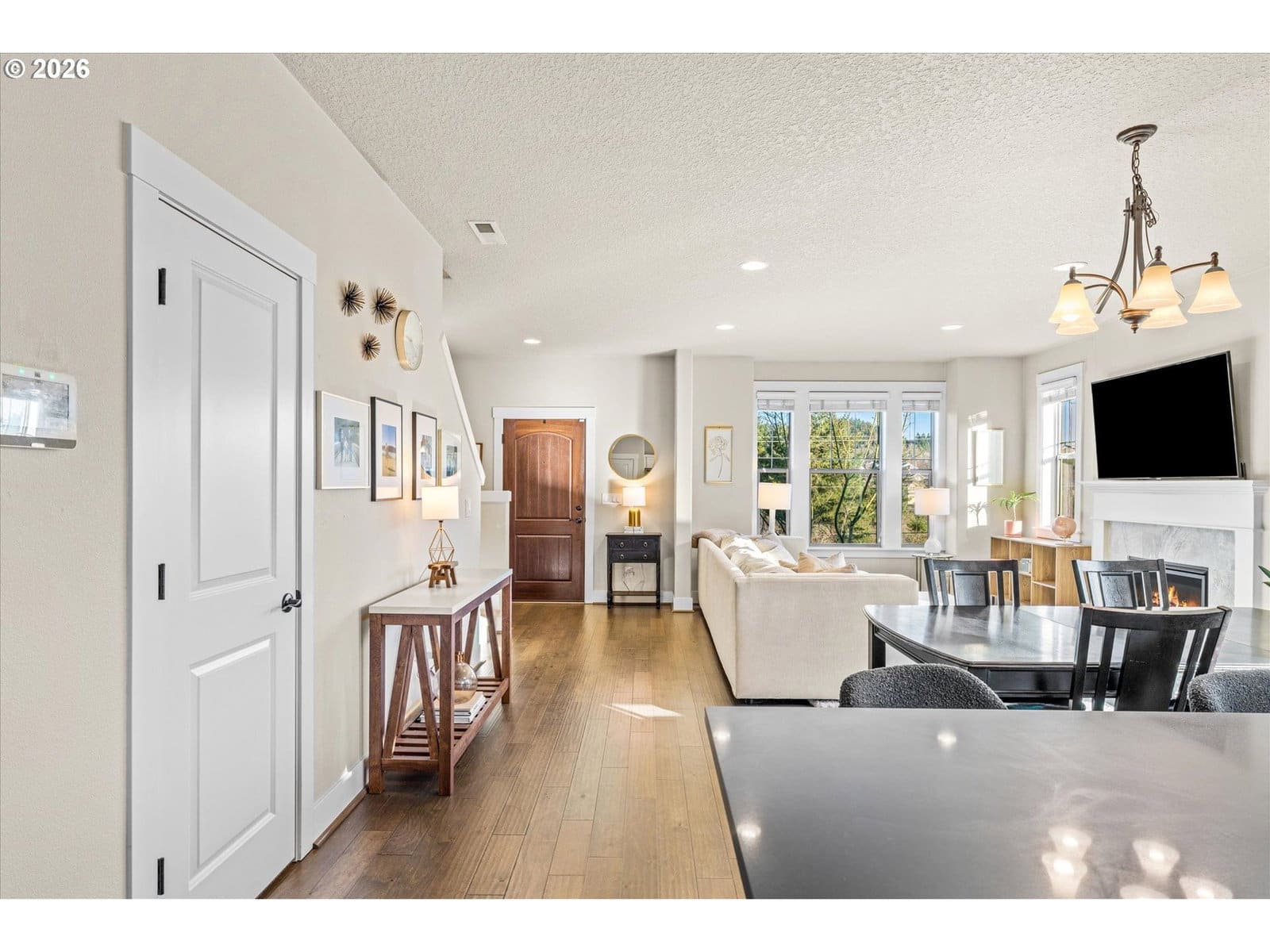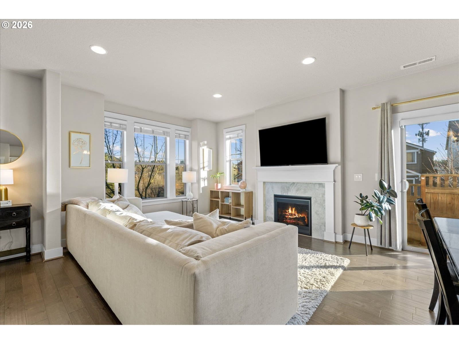 OPEN SATURDAY 12-2!!!! Sought-after River Terrace neighborhood at an affordable price on a corner lot. Enjoy the community center featuring a gym, recreation center, playground, and pool, all included in the HOA dues. Solar panels provide for summer electric bills as low as $3 a month. The main level offers laminate flooring throughout and a great-room floor plan with an open kitchen, dining, and living area with a gas fireplace. The kitchen features white cabinets, quartz countertops, an eat-at island, stainless steel appliances, and a gas range. The upper level includes a primary suite with walk-in closet and private bath, three additional bedrooms, and a utility room. Private side yard off the dining area with low maintainence turf and a custom patio. Move-in ready!