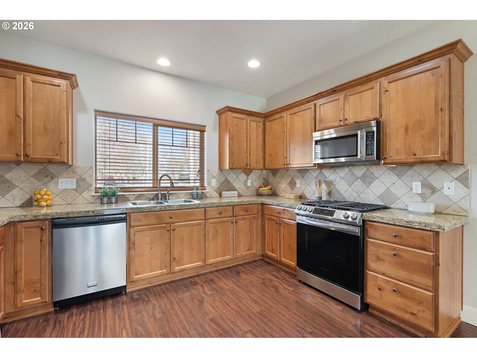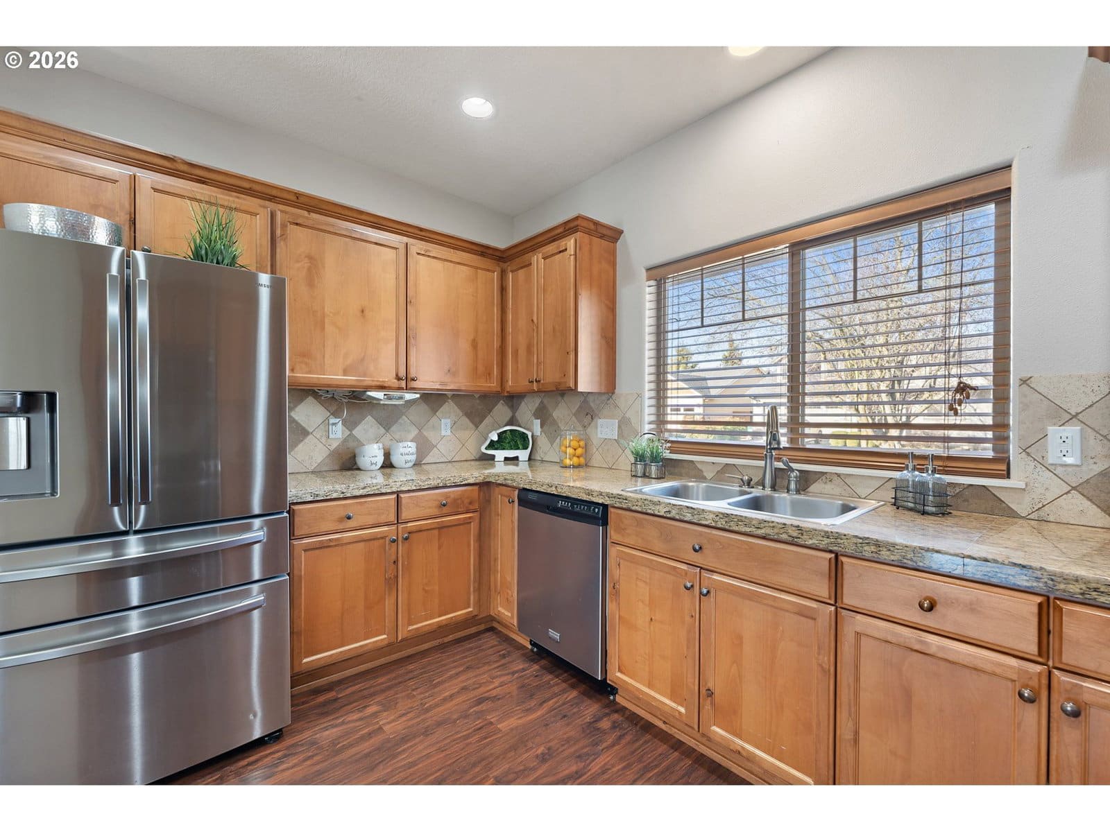 Sharp well maintained 1-level move-in ready and very close distance to Friends Park. Open floor plan, vaulted ceilings, laminate flooring, newer carpet & interior paint( 2021), covered patio & fenced yard. Kitchen includes newer range (2025) & newer Refrigerator (2024) as well as stainless appliances, granite counters & tile backsplash. Vaulted Primary bedroom & bath with soakingtub/shower combo, walk-in closet & sliding glass doors to covered patio. Nice sized utility room. No wasted space in this floor plan.