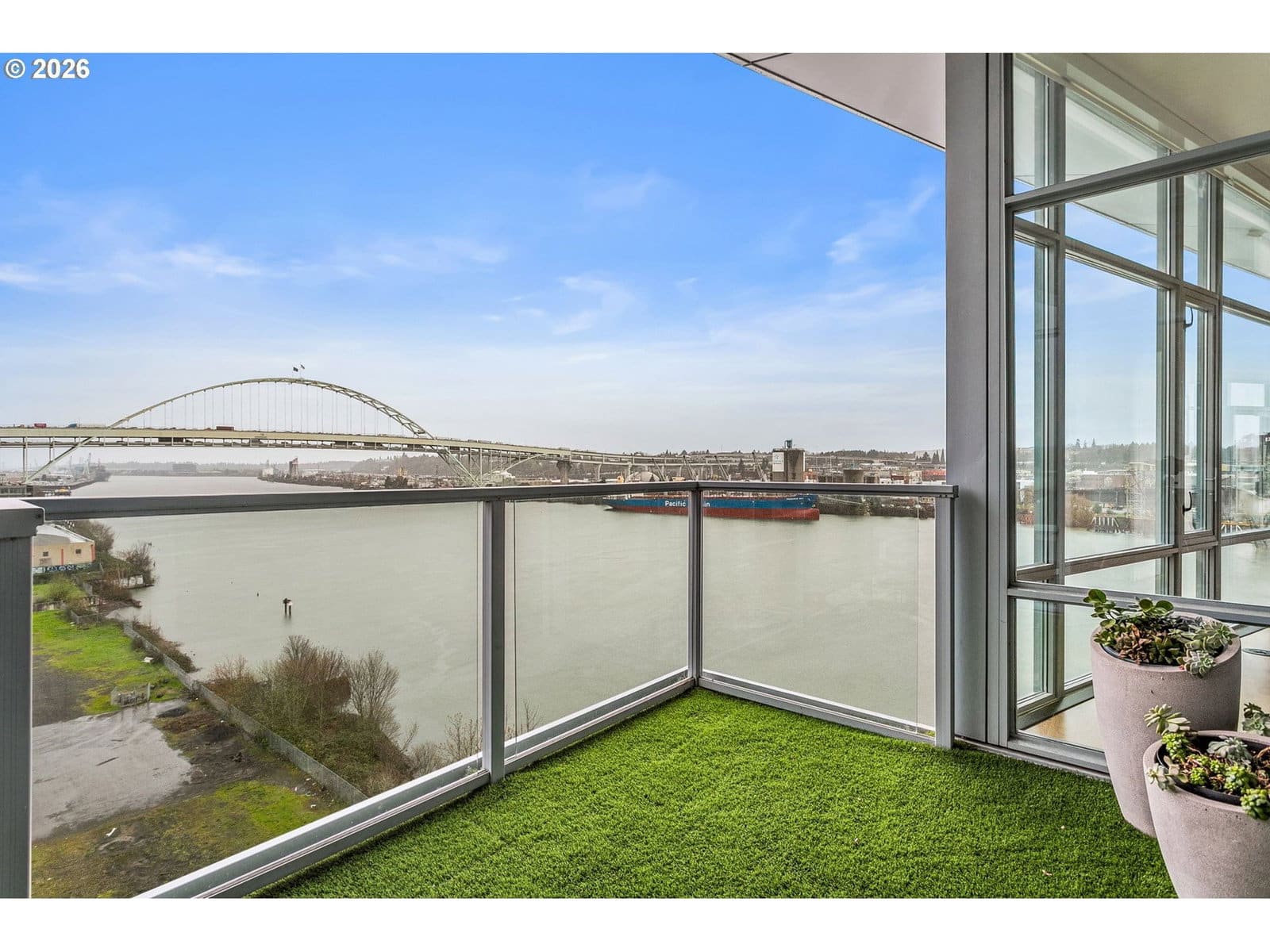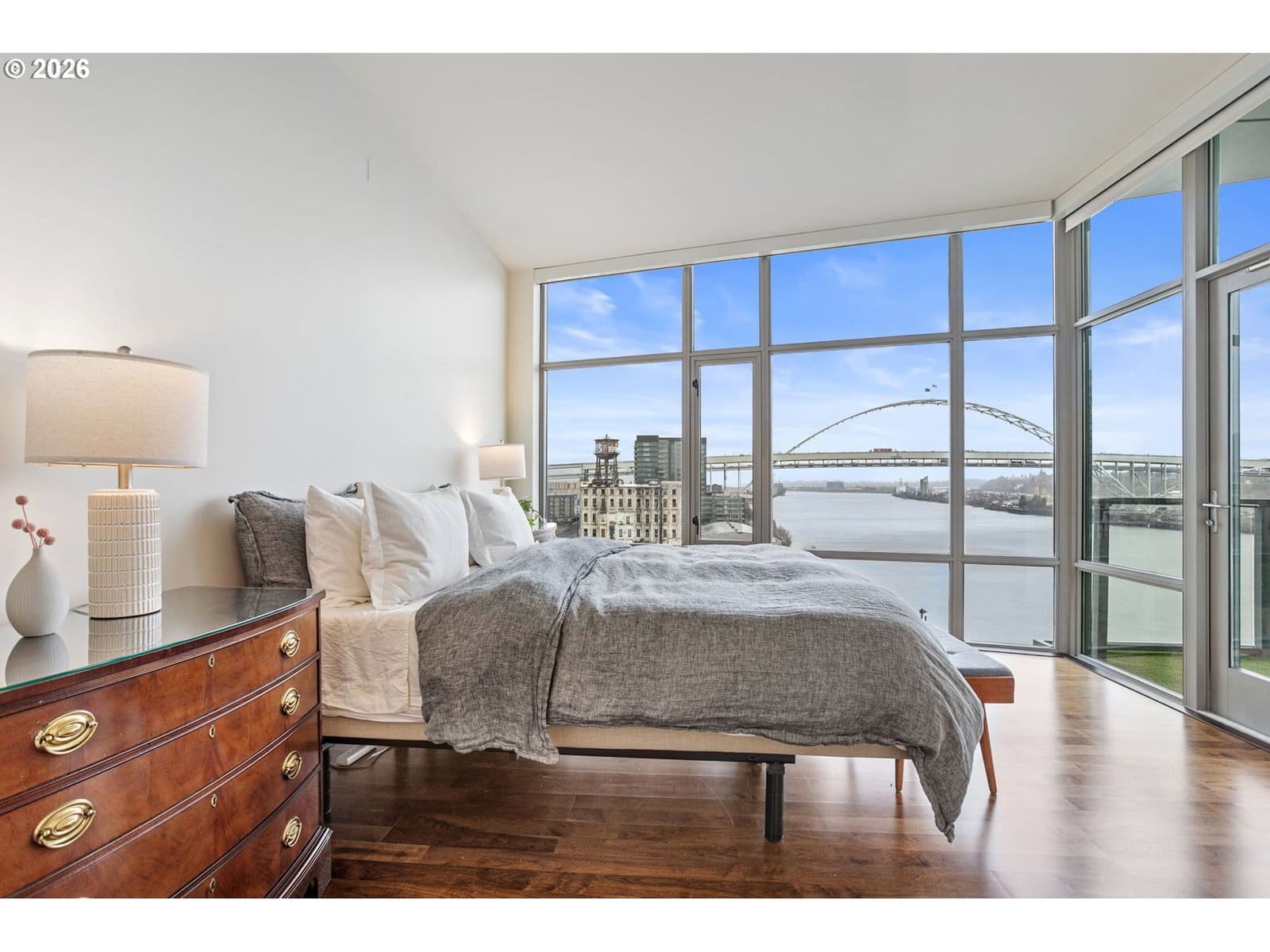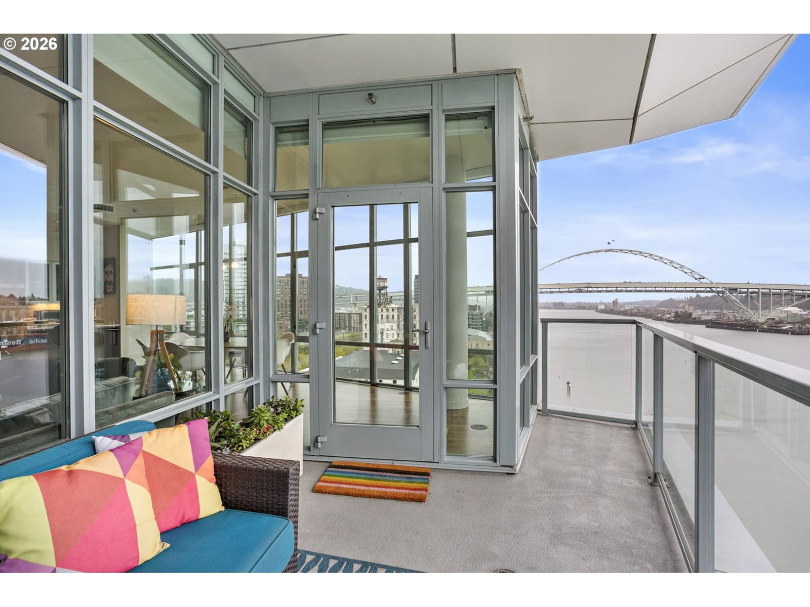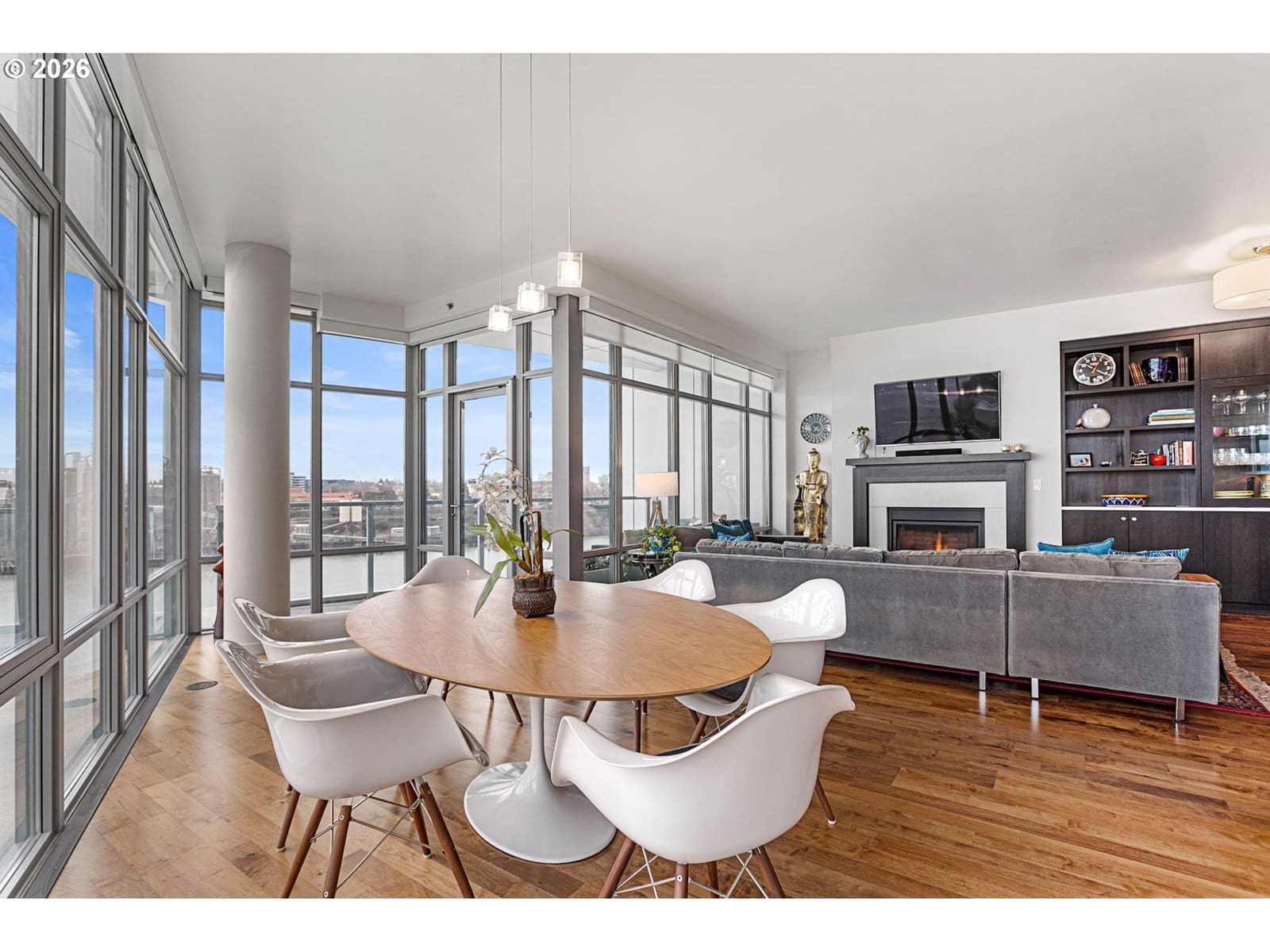 Welcome to an exquisite top-floor penthouse at Waterfront Pearl, offering an unparalleled waterfront living experience. This 1,927-square-foot residence features two bedrooms, two and a half bathrooms, + a versatile den. Enjoy unobstructed north-facing views of the river and city from every room! The spacious living area boasts extra high ceilings and a cozy fireplace, complemented by two private patios perfect for relaxation. The modern kitchen is equipped with premium Viking appliances and a convenient bar area. Custom closets provide ample storage, while power blinds add a touch of luxury. This property includes two parking spaces with EV charging capabilities and additional private storage unit. Building amenities include 24/7 security, a fully equipped gym and sauna. Experience the perfect blend of privacy and connectivity in this prime location, with easy access to the best of Portland!