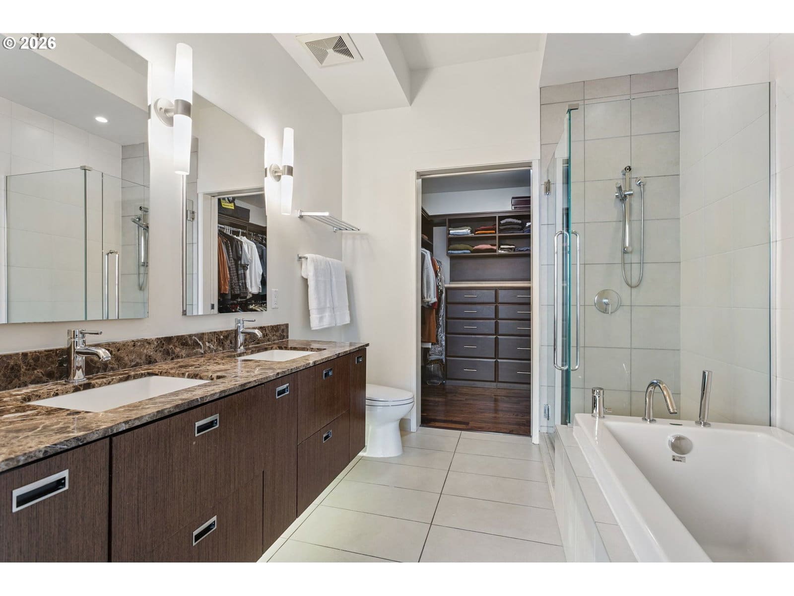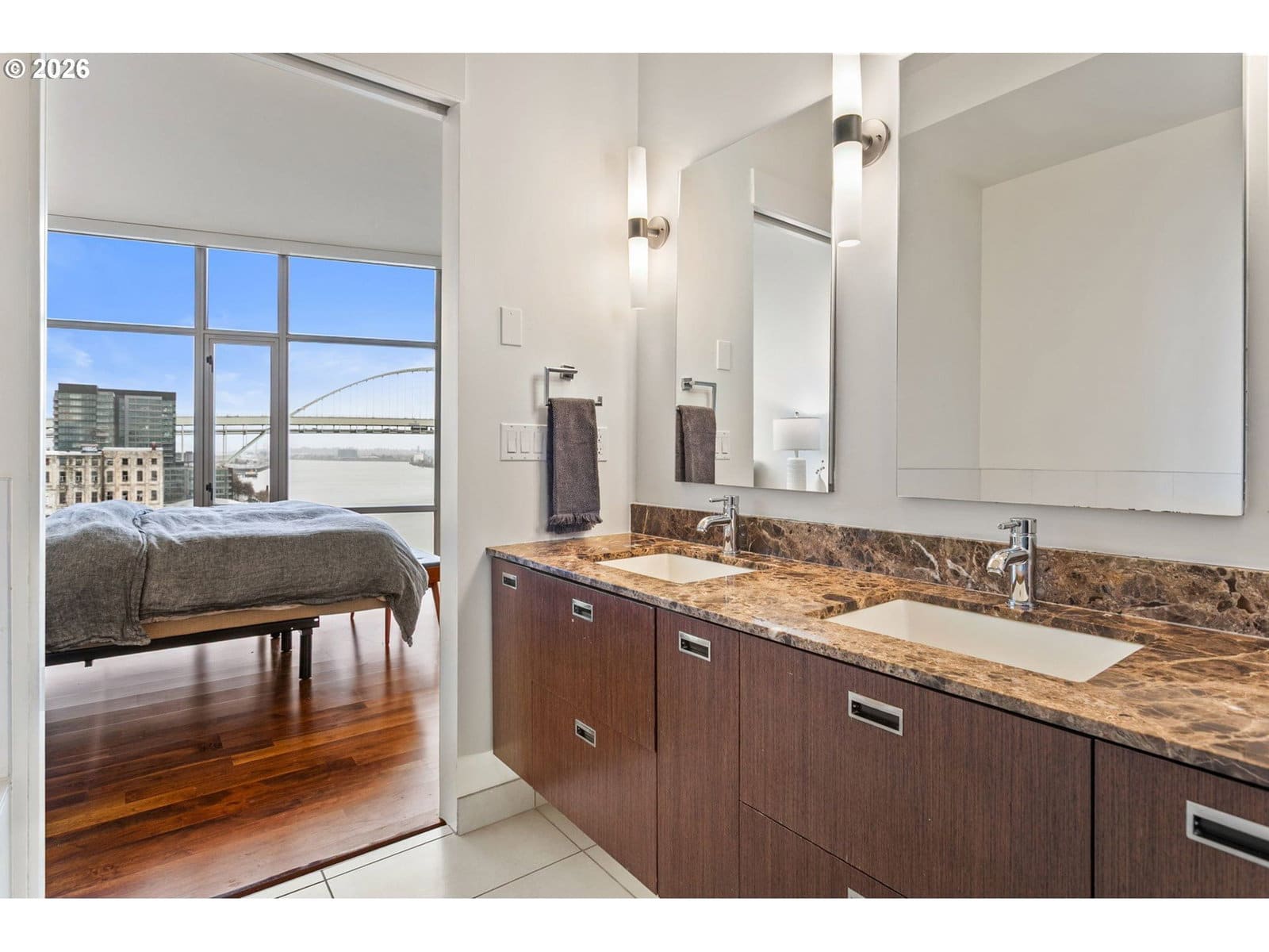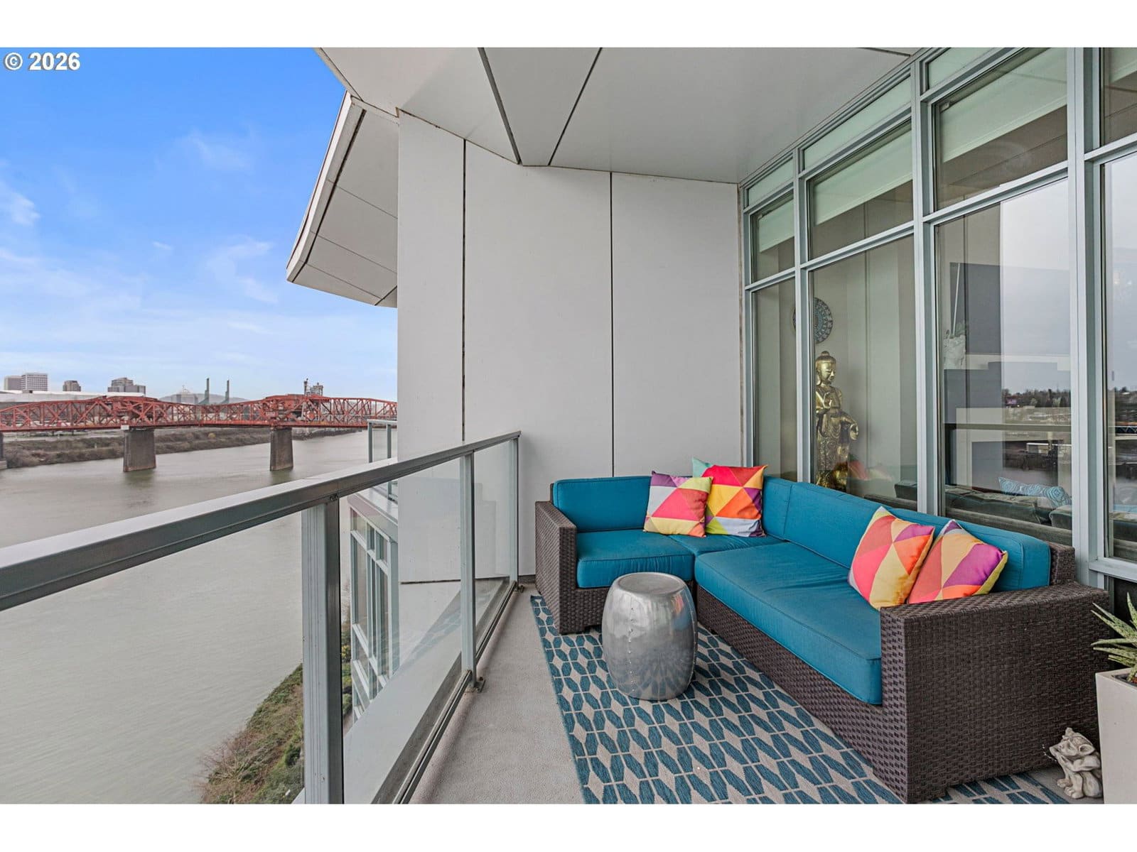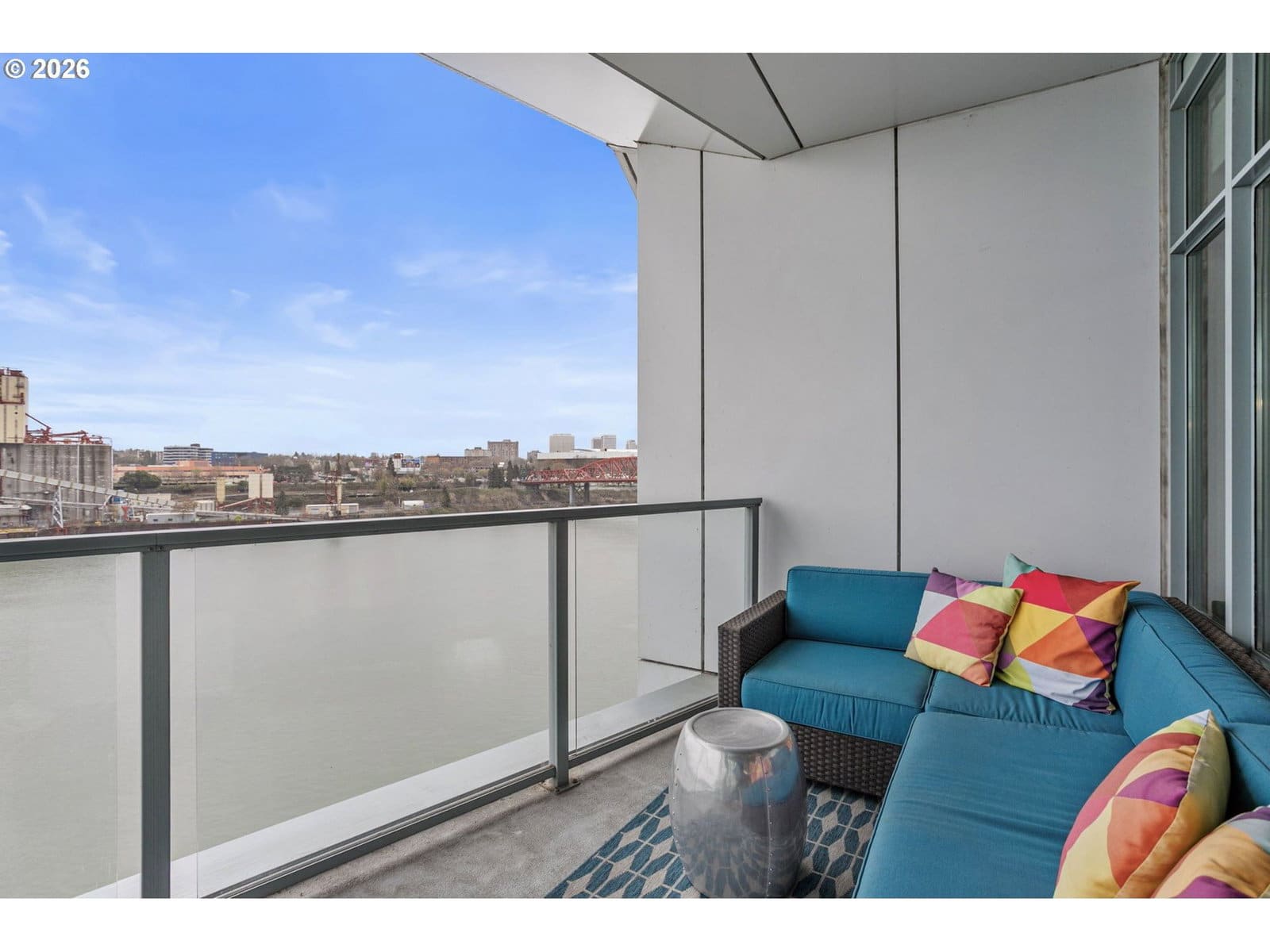 Welcome to an exquisite top-floor penthouse at Waterfront Pearl, offering an unparalleled waterfront living experience. This 1,927-square-foot residence features two bedrooms, two and a half bathrooms, + a versatile den. Enjoy unobstructed north-facing views of the river and city from every room! The spacious living area boasts extra high ceilings and a cozy fireplace, complemented by two private patios perfect for relaxation. The modern kitchen is equipped with premium Viking appliances and a convenient bar area. Custom closets provide ample storage, while power blinds add a touch of luxury. This property includes two parking spaces with EV charging capabilities and additional private storage unit. Building amenities include 24/7 security, a fully equipped gym and sauna. Experience the perfect blend of privacy and connectivity in this prime location, with easy access to the best of Portland!