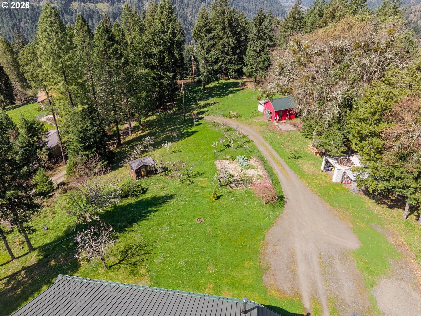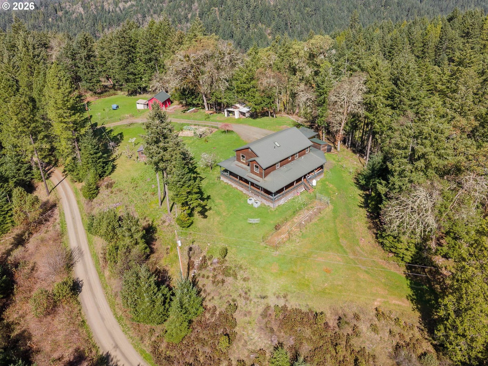 Custom farmhouse style meets elevated rural living in this truly one-of-a-kind property. Wrapped in cedar siding and surrounded by an expansive 1,300 sq ft wraparound deck with tongue-and-groove ceiling, this home is designed to be experienced. Enjoy a built-in hot tub and outdoor shower—perfect for unwinding in total privacy.Inside, you’ll find Brazilian cherry wood floors, tile accents, and soaring 10’ ceilings. Natural light fills the home, with mountain and forest views from every window. The kitchen features granite counters, an island, and space to gather, blending beauty and function.Upstairs offers four large bedrooms plus a versatile bonus area ideal for a family room, library, or media space. A main-level bedroom adds flexibility for guests or multi-generational living.Outside, the property is set up for a true rural lifestyle with multiple fenced garden areas, quality storage buildings, and a concrete-floor shop with 220 power. A small pasture provides room for a horse or a few animals.Peaceful, private, and surrounded by nature, yet just a short drive to town and near Umpqua River recreation, this is a rare opportunity for those seeking space, quality, and a lifestyle that feels worlds away.