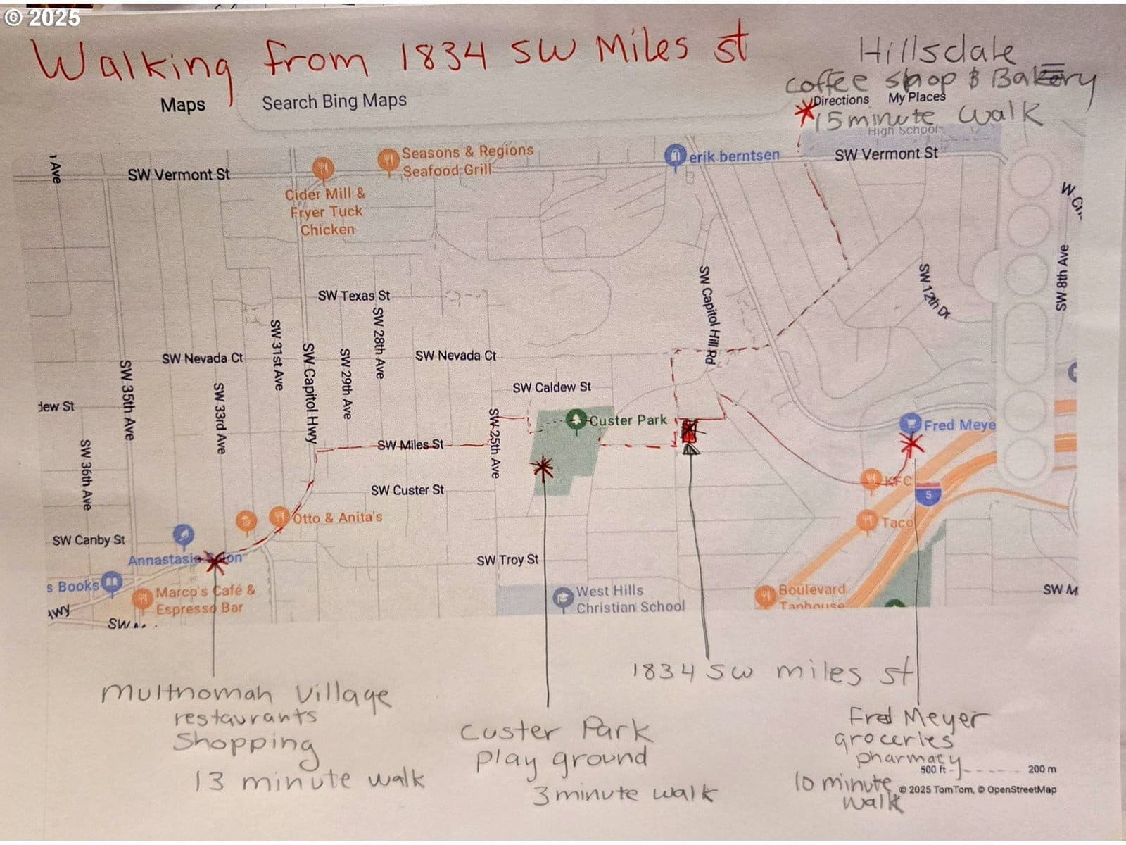 This spacious, light-filled Hillsdale home carries an inviting mid-century vibe and sits on a quiet street directly adjacent to a neighborhood trail and blocks from Multnomah Village, parks, schools, a disc golf range, and major commuter routes.With 5 bedrooms, a den, and 2 bathrooms, there’s room for everyone. Sliding doors from both the living and dining rooms open onto a large rebuilt deck with sunrise and territorial views, creating generous outdoor living space for lounging, dining, and summer BBQs.Two wood-burning fireplaces add warmth and ambiance. The private backyard features mature grapevines and a fire pit, perfect for gathering.The functional kitchen offers bar seating, a stained-glass window, and a newer dishwasher. Recent upgrades include PEX plumbing, new mini blinds, professional interior painting, fresh landscaping, newly repointed chimney and a new tear-off roof—major improvements that will bring peace of mind for years to come.Lovingly maintained and full of potential, this home is ready for your next chapter. [Home Energy Score = 2. HES Report at https://rpt.greenbuildingregistry.com/hes/OR10242290]