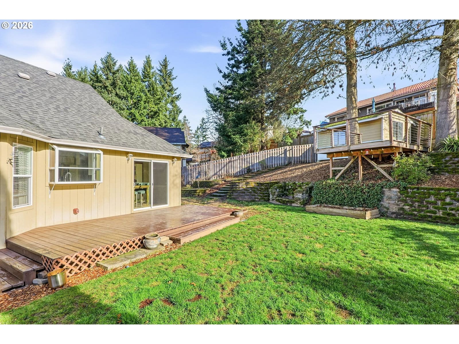 Tucked away on a quiet cul-de-sac, this move-in ready home sits on an exceptionally large lot, nearly a quarter acre, with a backyard that truly sets it apart. Bamboo hardwood floors run throughout the home, complemented by abundant natural light and thoughtful updates. The formal living room features vaulted ceilings with skylights, bay windows, and hardwood floors, creating a bright and welcoming first impression. The dining room offers hardwood flooring and a sliding glass door that opens to the patio, ideal for indoor-outdoor living. The kitchen is inviting with granite countertops, built-in dishwasher and microwave, a freestanding refrigerator, and a cozy nook perfect for casual seating or a breakfast nook. The lower level adds flexible living space with a family room featuring a fireplace, wainscoting, tile floors, high ceilings, and a sliding glass door to a covered patio. A full laundry room with storage and an updated powder bath complete this level. The owner’s suite is a private retreat with double doors, hardwood floors, a sliding glass door to a private balcony, dual sinks with granite countertops, a walk-in closet with custom California Closets organizers, and a fully tiled walk-in shower with a rain shower head. Two additional bedrooms feature hardwood floors, closets, and high ceilings. The fully fenced backyard is truly special, showcasing professionally tiered landscaping, a large deck with an outbuilding (potential for studio space), two patios, pergolas, and garden boxes. Additional highlights include a big garage, extra and RV parking, updated primary bathroom (2020), newer HVAC system, and updated trim. Conveniently located near Powerline Trail, parks, hiking, shopping, dining, and everyday amenities.