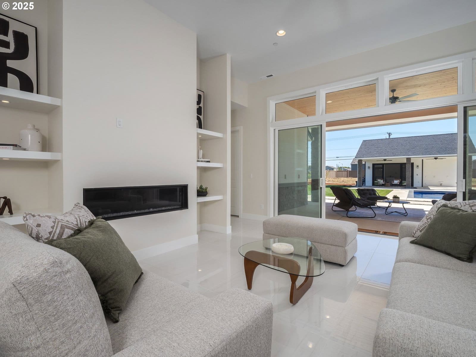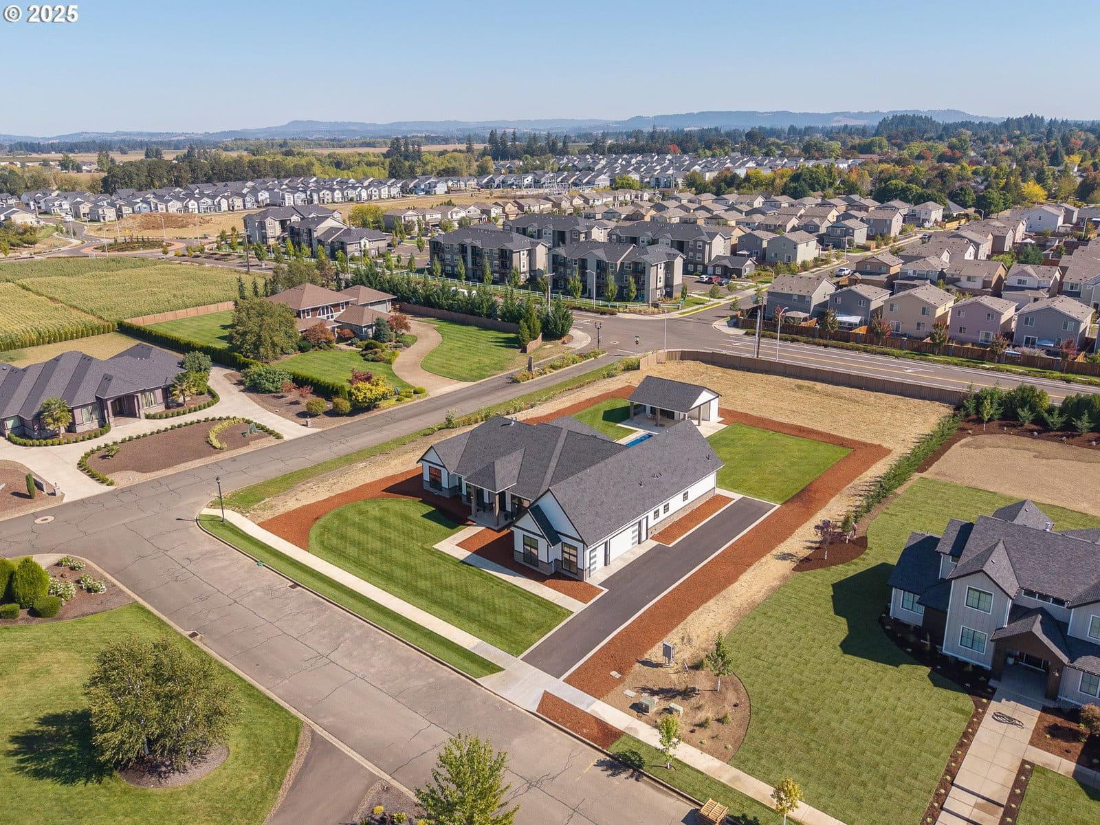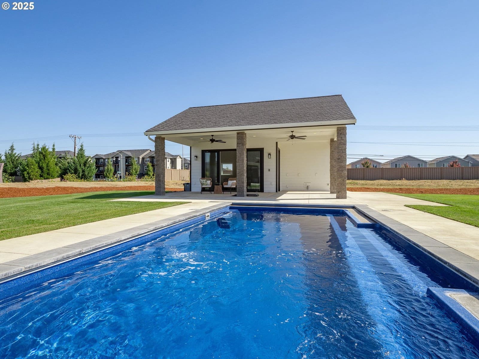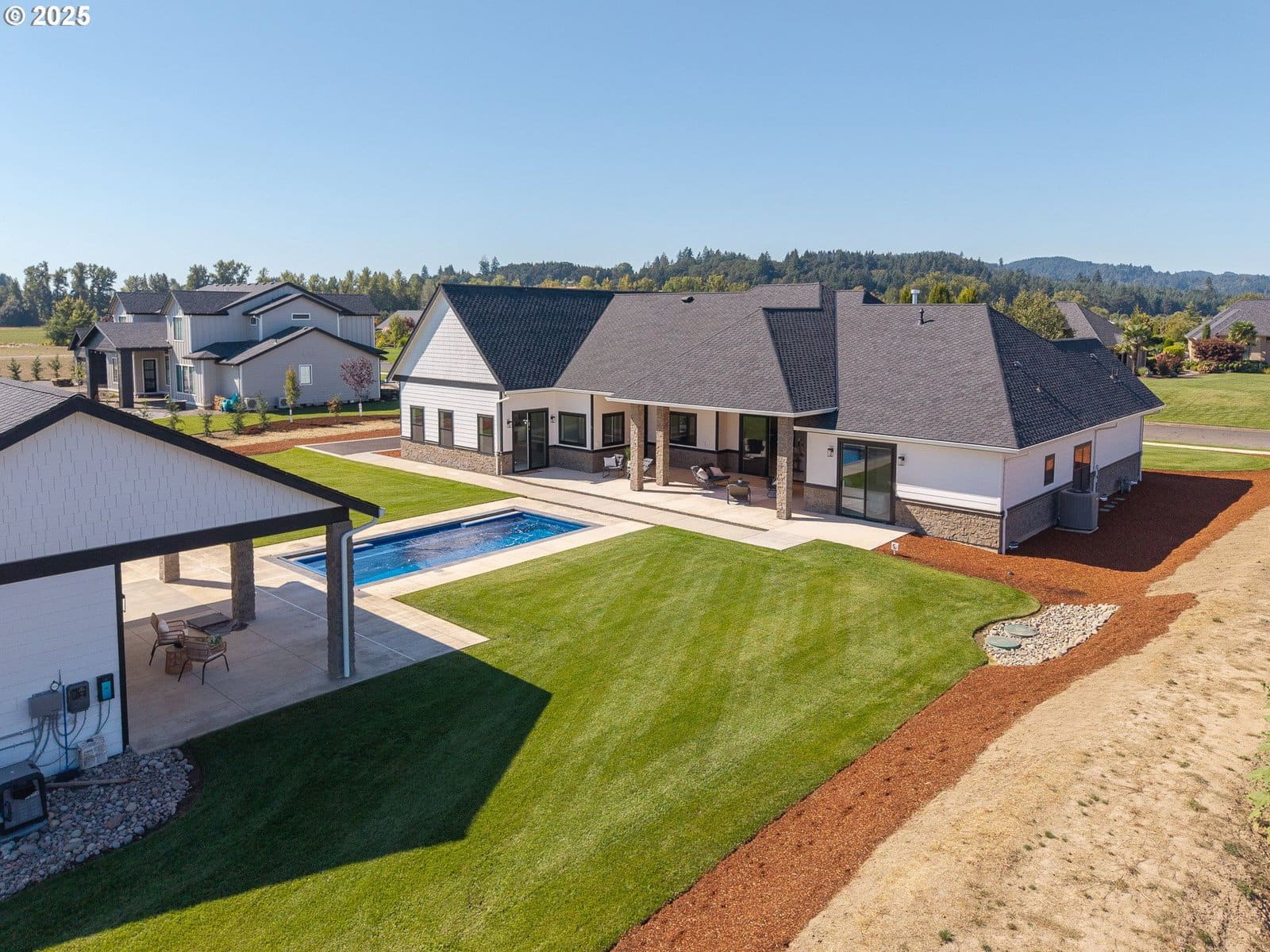 *Furnishings to be included with acceptable offer* Nestled in one of McMinnville’s most upscale neighborhoods, this brand new, custom-built residence offers a lifestyle that feels like a year-round vacation in the heart of Oregon wine country. Set on just over an acre, the home blends contemporary architecture with thoughtful design, creating spaces that are as luxurious as they are livable. Step inside through the dramatic custom pivot door to soaring 10-foot ceilings and an open, light-filled great room that flows seamlessly to the chef’s kitchen and covered outdoor living area. Entertaining is effortless with a 10-foot quartz island, brand new stainless steel appliances, including double ovens, two dishwashers, a warming drawer, an oversized refrigerator, and a huge walk-in pantry with custom built-ins. Every bedroom in this 3,400+ sq. ft. home is its own private suite, complete with a walk-in closet and attached bath. The primary retreat is a sanctuary all its own, featuring a private patio, spa-inspired bath with custom walk-in shower with built-in bench, double sink vanity, a makeup station, and a spacious walk-in closet. A dedicated home office provides flexibility for work or creative pursuits. Resort-style living continues outdoors, where a custom in-ground fiberglass pool with electric cover takes center stage. The beautifully landscaped yard offers both lush green lawn and low-maintenance ease with an in-ground sprinkler system. A dedicated pool house with bathroom and laundry hookups expands the possibilities, whether as a rec room, home gym, or guest space. Additional amenities include a 3-car oversized garage, tankless hot water heater, and custom cabinetry throughout, ensuring style and function at every turn. From the floor plan to the finishes, every element reflects a commitment to comfort, function, and style.