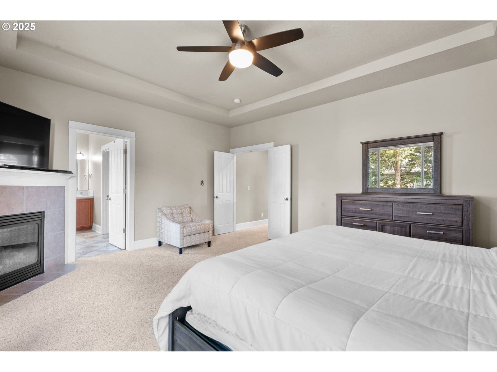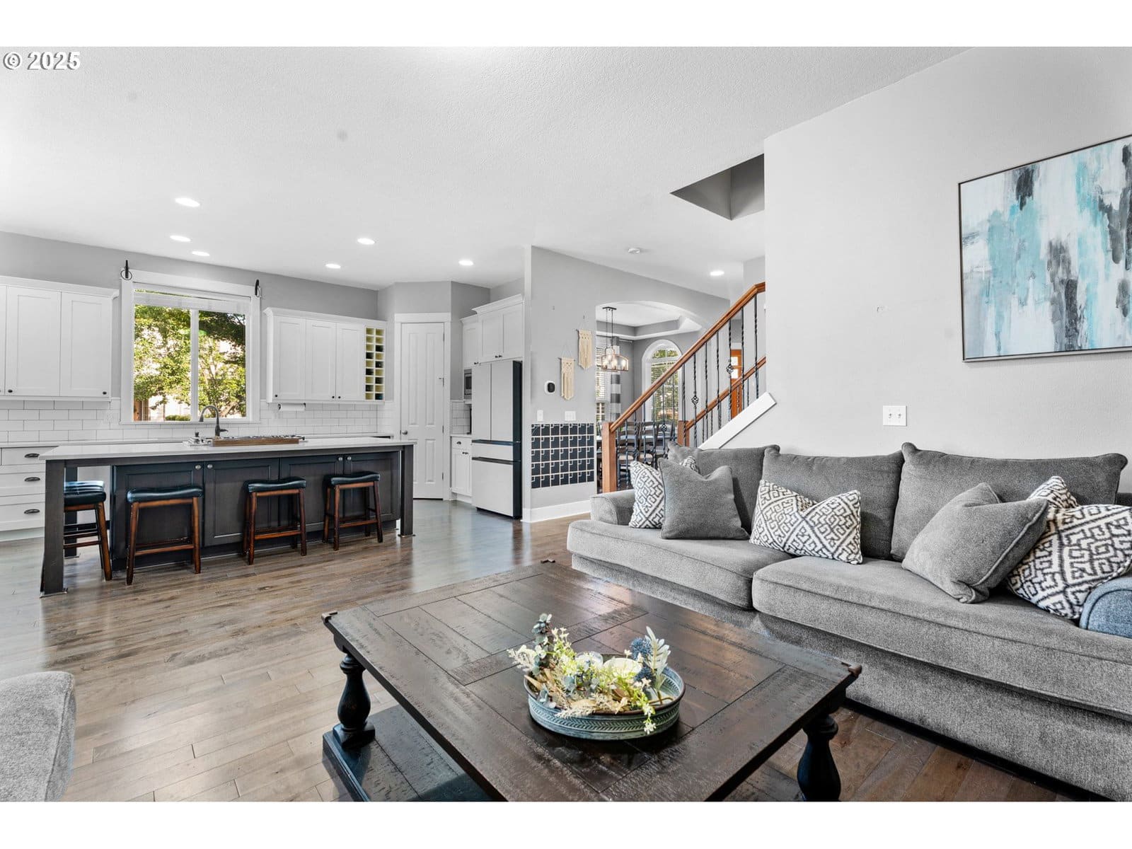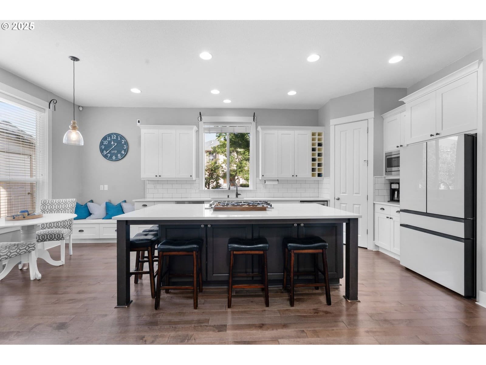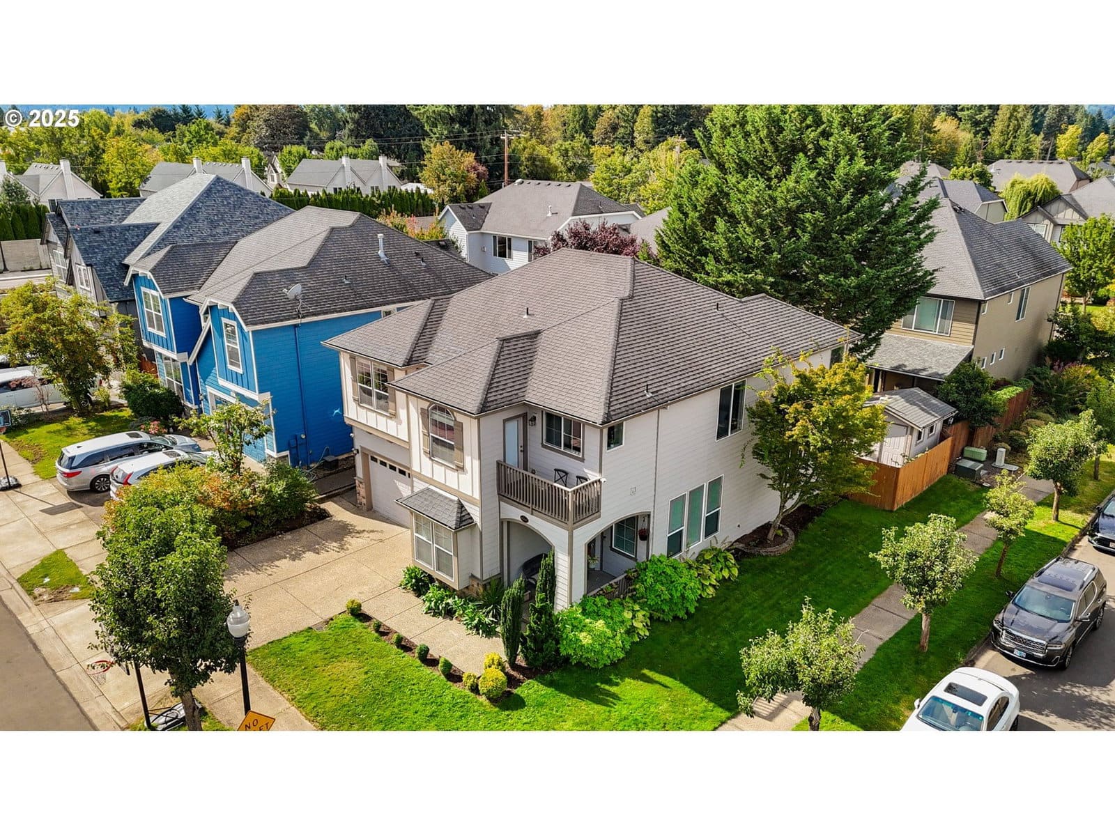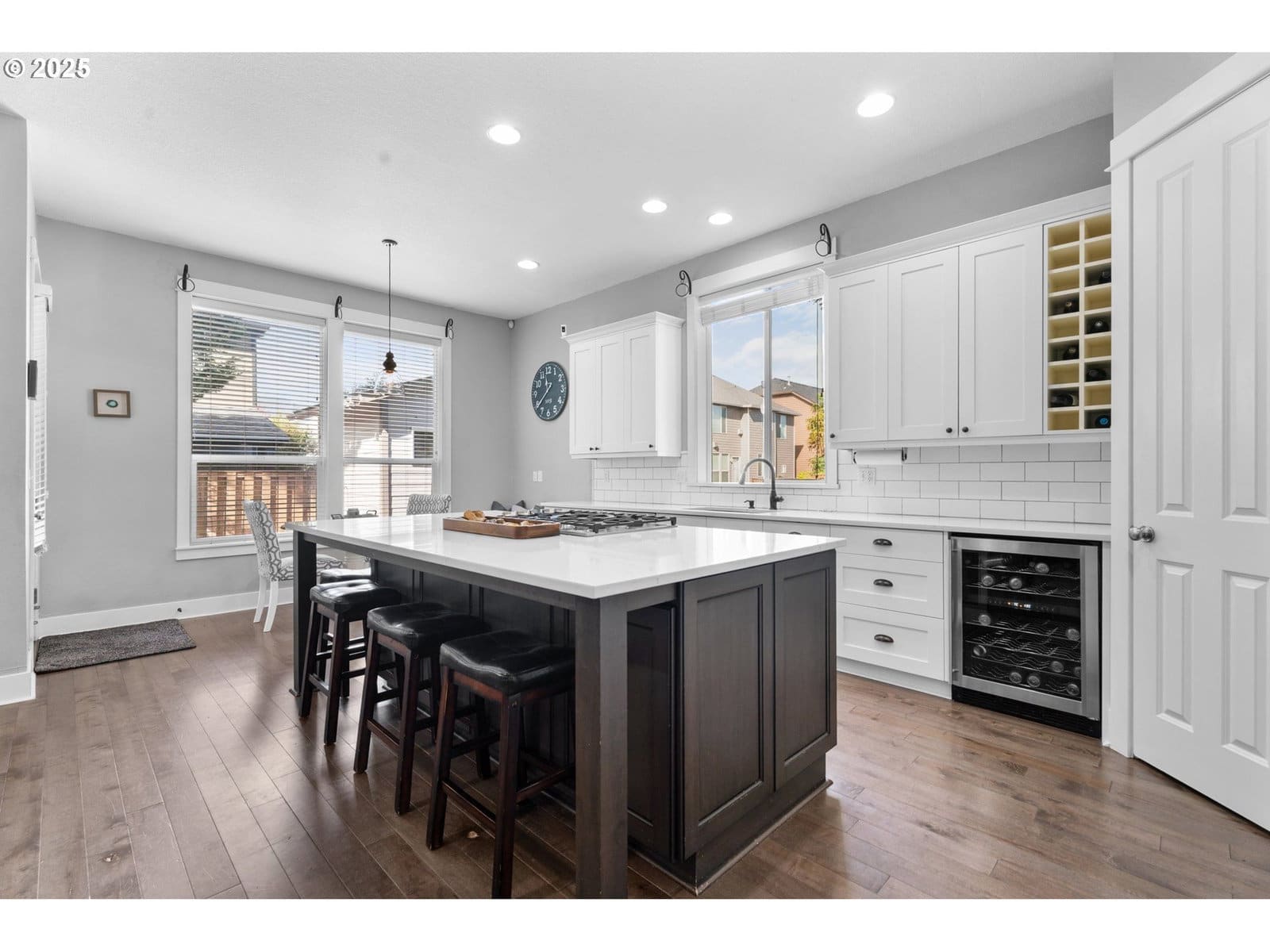 Beautifully remodeled home with quality finishes and thoughtful updates throughout. Main level features 11-foot ceilings, solid maple hardwood floors, and an open-concept kitchen and family room with gas fireplace. The kitchen includes quartz counters, large island, 5-burner gas range with back vent, convection oven, pantry, soft-close cabinets, wine fridge, and new Samsung refrigerator (2023). The Dining area, nook with patio slider, office with French doors, and half bath complete the main floor.Upstairs offers a primary suite with gas fireplace, coffered ceiling, walk-in closet, and bathroom with jetted tub, double sinks, and separate shower. Four additional bedrooms (one with balcony), a loft with built-ins, and a laundry room with tile flooring, butcher block counters, sink, and storage provide comfort and function.Outdoor features include a covered patio, raised garden beds, turf yard, paver walkways, and a shed. Oversized 2-car garage with tandem space, workbench, upper storage, and 1,200 lb. cable/winch. Fiber cement lap siding and solar panels installed 2021. Walking trail and dog station are down the street. Convenient location near shops, restaurants, and parks.