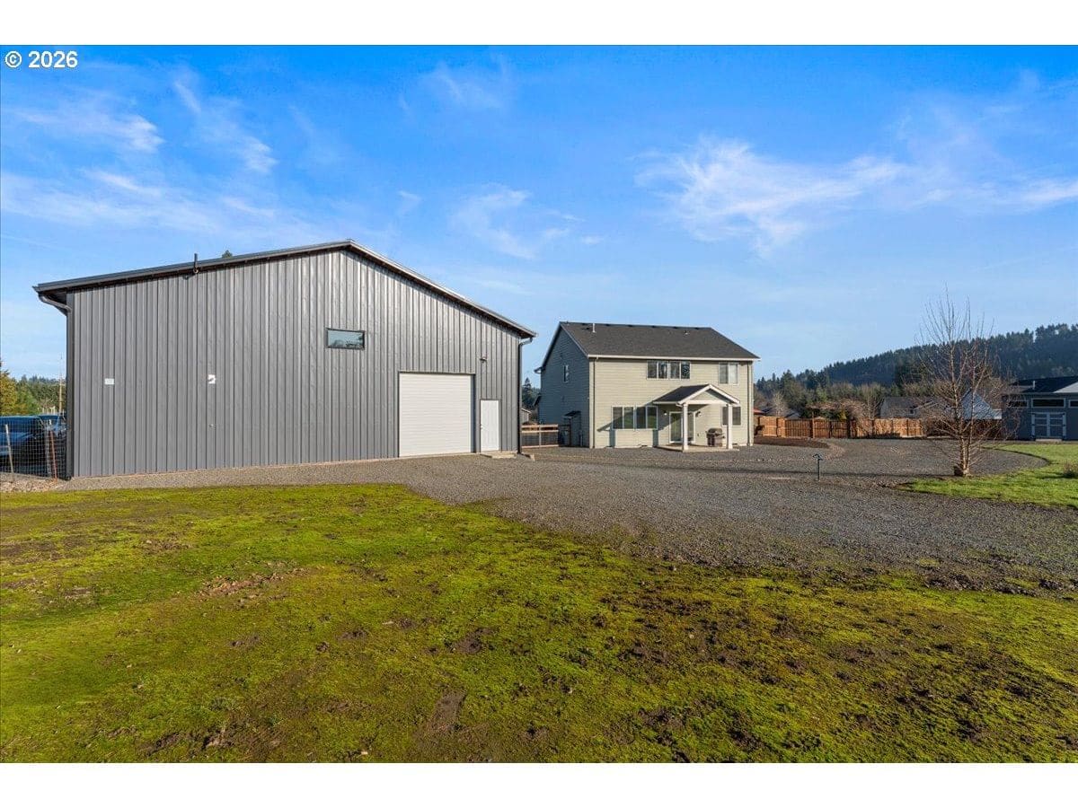 An exceptional property set on a level 2 acres offers a rare combination of a beautiful custom home, expansive grounds & an absolutely incredible shop! Contractors, hobbyists, car collectors, mechanics & entrepreneurs alike will appreciate the massive workshop equipped for serious use. The 45’x54’ shop features 3 roll-up doors, allowing drive-through access. Ideal for RVs, boats, car collections, inventory storage & creative pursuits. The shop includes it’s own bathroom w/tile shower, tankless water heater, utility sink + is prepped for HVAC installation. Sun-drenched & spotless, the house is completely move-in ready! Work from home in style in a bright, private office at the front of the house. Designed for both form & function, the generous kitchen will delight your inner chef, featuring wood cabinetry, sleek quartz countertops, walk-in pantry & modern engineered hardwood floors. The 2023 stainless steel KitchenAid suite includes a 5-burner gas range + built-in electric oven, all surrounding a generous island & eat-in bar. The heart of the home is the expansive, open-concept great room—ideal for hosting lively dinner parties, or curling up on a massive sectional for cozy movie nights. Escape to the primary suite w/high ceilings, generous walk-in closet, f/s tub, shower & 2 single vanities. A flexible 4th bedroom makes an excellent office, playroom, or craft space. Upstairs laundry adds everyday convenience (2023 Samsung washer & dryer included). Storage abounds throughout the home, shop & backyard shed. Set perfectly between Oregon City, Molalla, and Canby, w/access to Hwy 213, shopping, dining & major medical, while maintaining a peaceful small-town feel. Level, securely fenced w/garden & fruit trees & endless possibilities for a pool, sports court or play area. Located on a private cul-de-sac loop with friendly neighbors, colorful sunsets & no through traffic. This is a truly special property offering space, flexibility & exceptional amenities—inside and out!