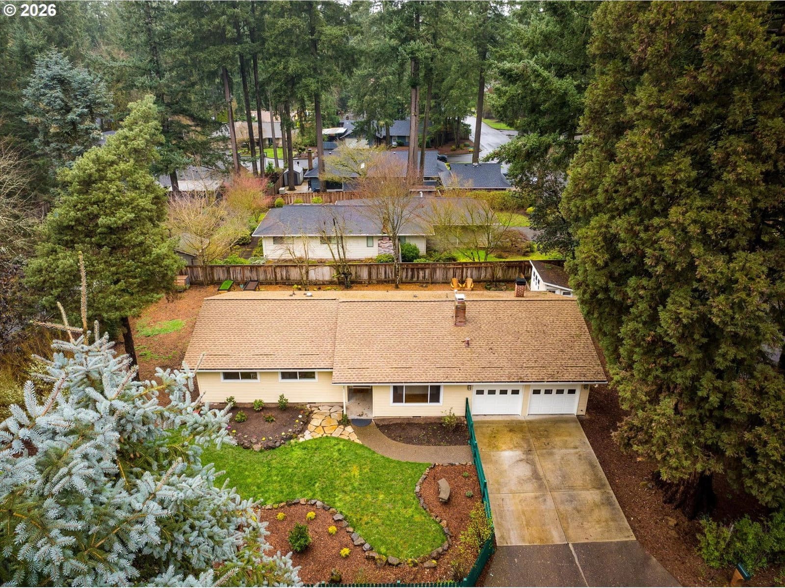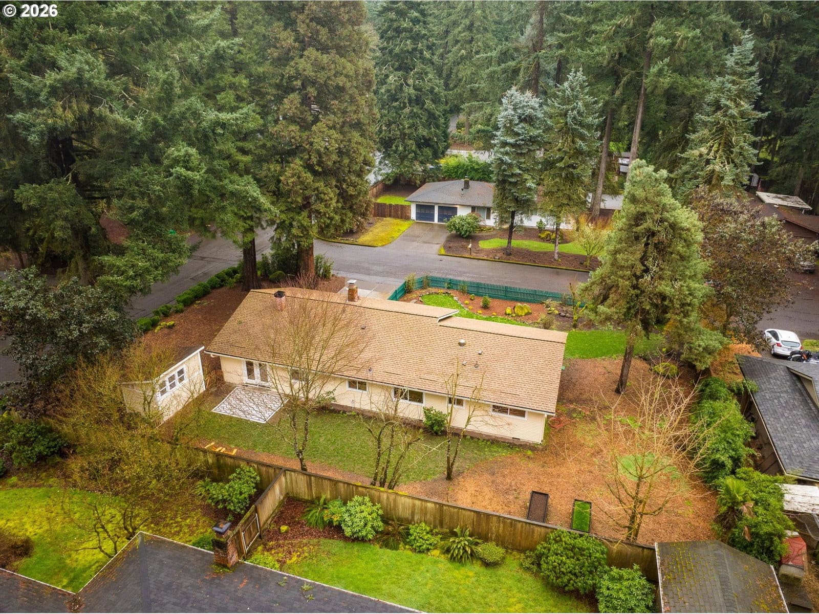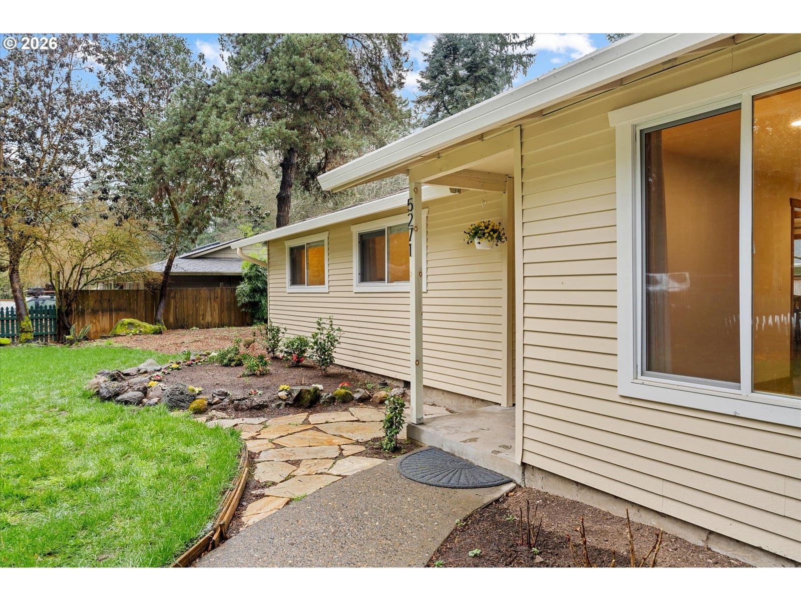 Affordable one level in Lake Oswego & 3 blocks to River Grove Elementary School. On a quiet cul-de-sac with a corner lot and fully fenced yard. Remodeled kitchen is a standout, featuring butcher block countertops, a white farmhouse sink, new cabinetry, stainless steel appliances, eat at bar, and updated lighting and hardware. Family and Living Rooms with wood burning fireplaces and laminate flooring. Furnace and AC replaced in 2025, updated lighting in 2026, newer roof, vinyl windows, WiFi enabled garage door opener & repoured driveway. Situated on almost a quarter acre, the fully fenced yard offers room to play, garden, or entertain. The 11 x 7 outbuilding with windows, is prepped and ready for electrical. It is ideal for a home office, creative studio, or flexible bonus space