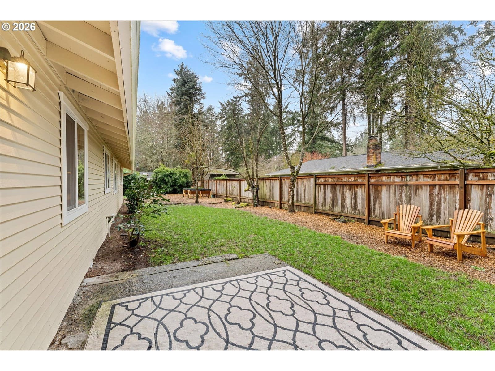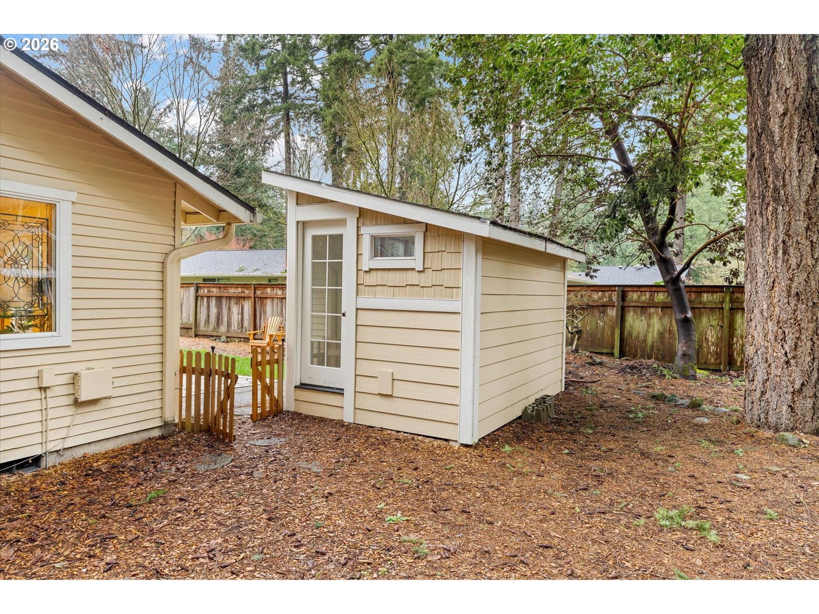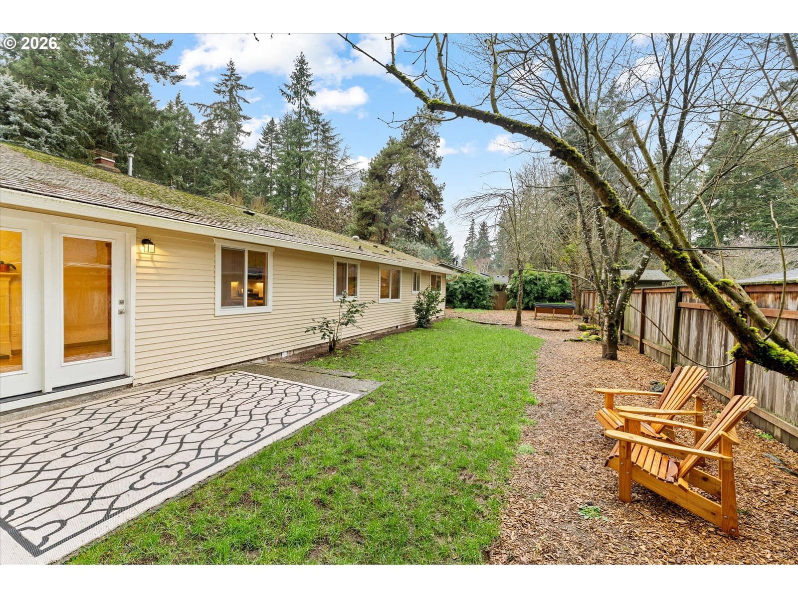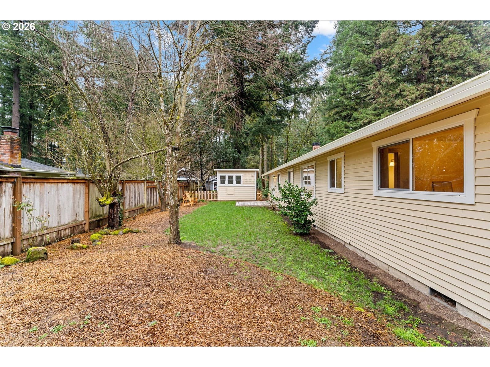 Affordable one level in Lake Oswego & 3 blocks to River Grove Elementary School. On a quiet cul-de-sac with a corner lot and fully fenced yard. Remodeled kitchen is a standout, featuring butcher block countertops, a white farmhouse sink, new cabinetry, stainless steel appliances, eat at bar, and updated lighting and hardware. Family and Living Rooms with wood burning fireplaces and laminate flooring. Furnace and AC replaced in 2025, updated lighting in 2026, newer roof, vinyl windows, WiFi enabled garage door opener & repoured driveway. Situated on almost a quarter acre, the fully fenced yard offers room to play, garden, or entertain. The 11 x 7 outbuilding with windows, is prepped and ready for electrical. It is ideal for a home office, creative studio, or flexible bonus space