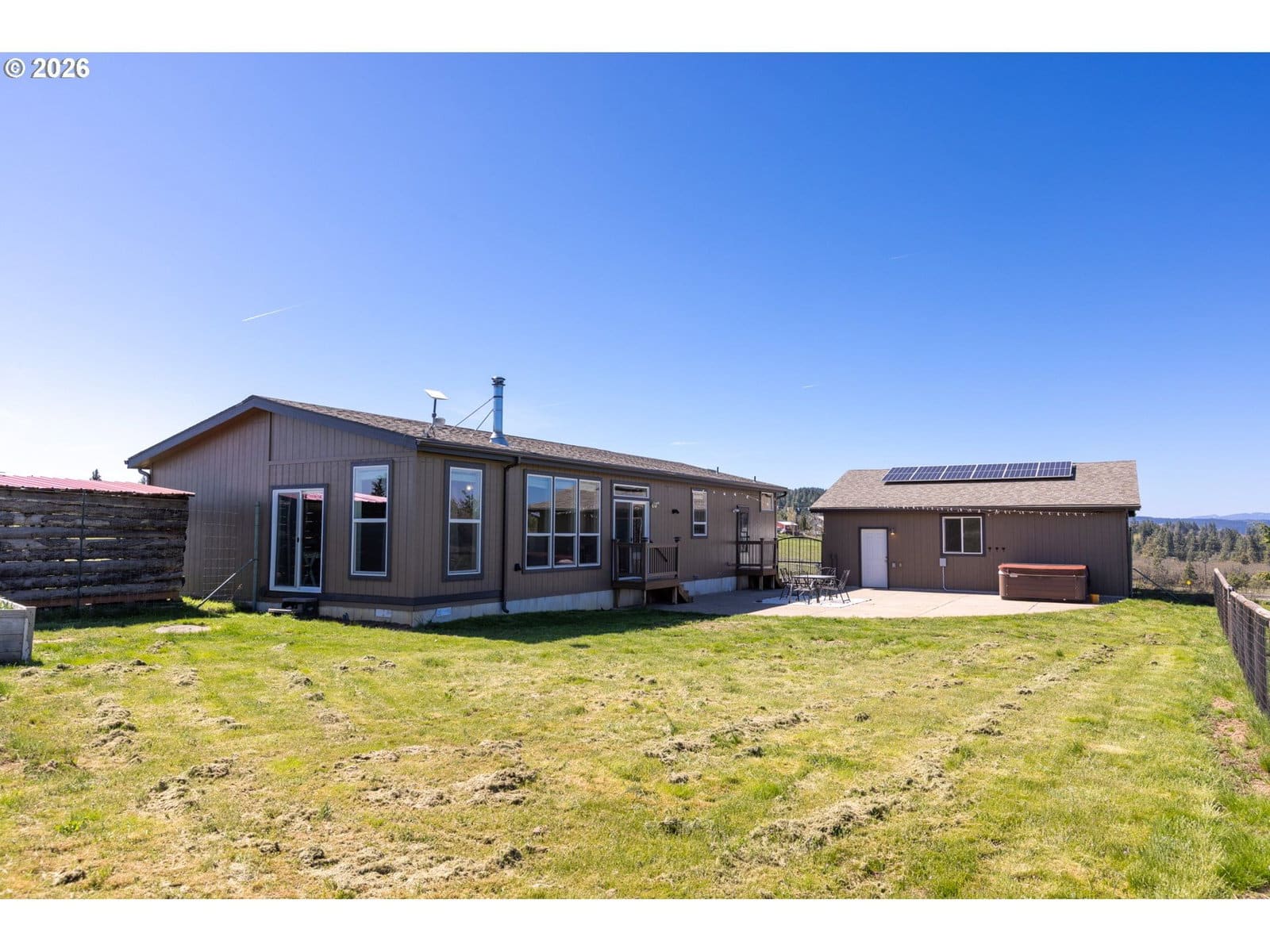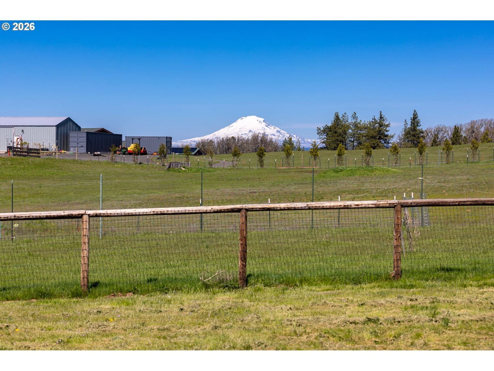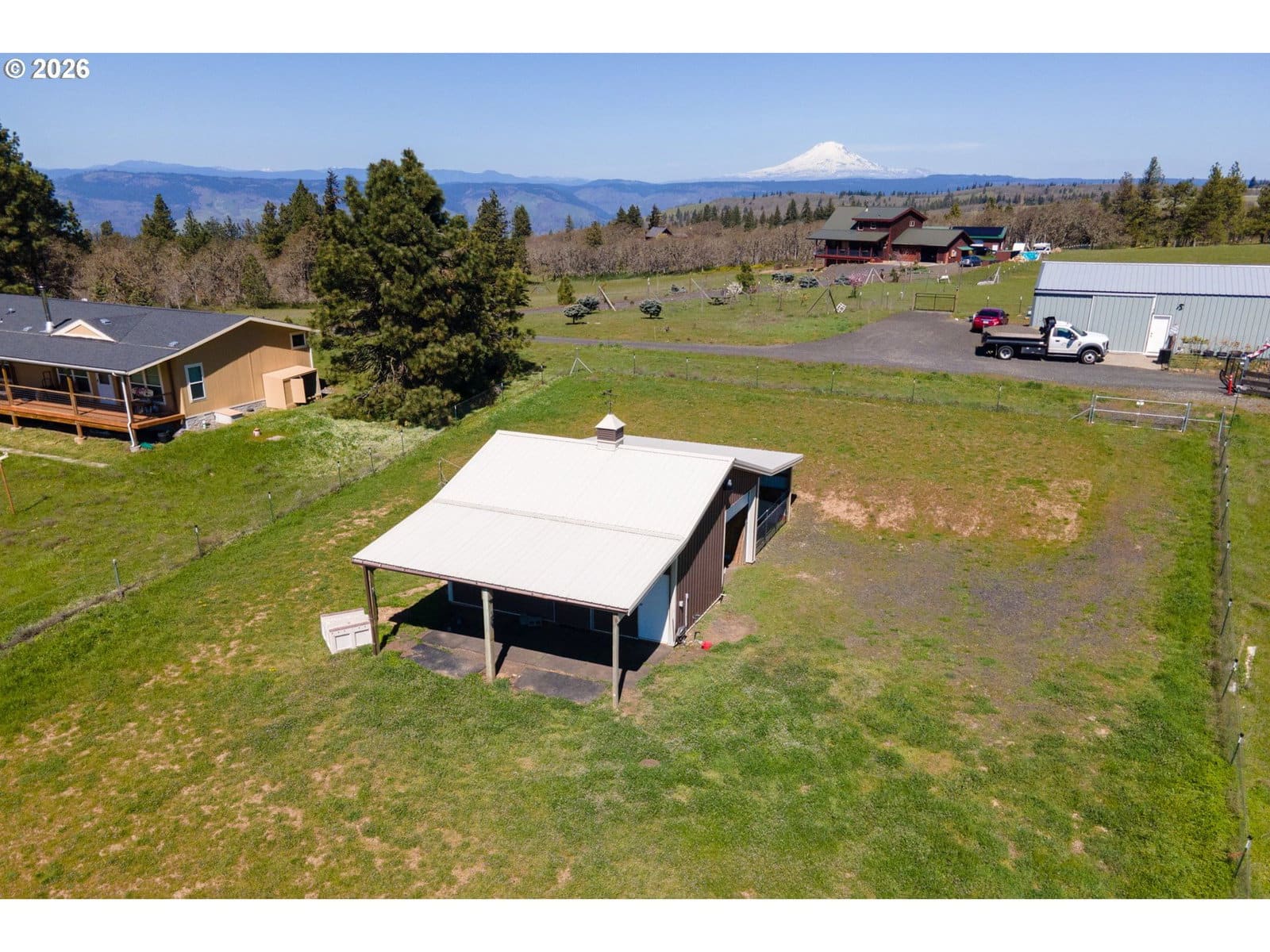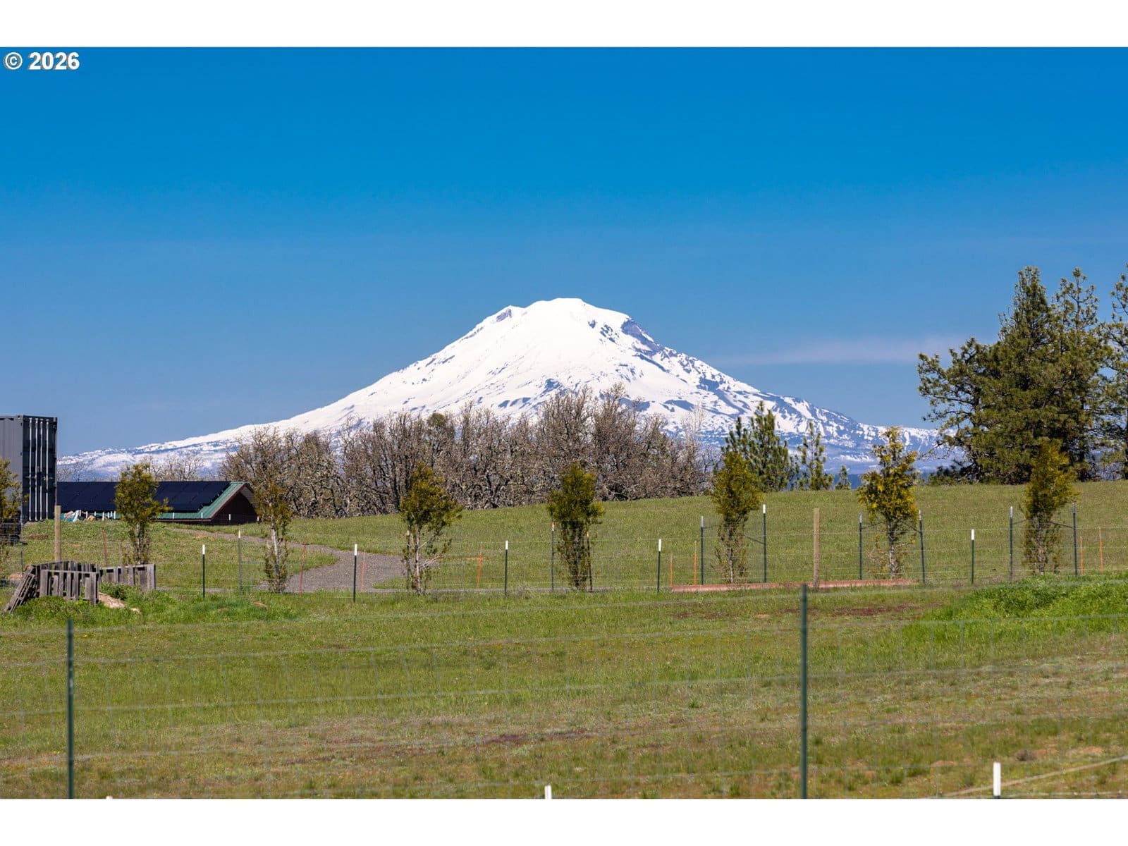 Perched atop a hill on almost 6 acres, this beautifully maintained 2015 manufactured home offers sweeping views of Mt. Adams and the perfect blend of comfort and country living. Ideally situated on the dividing line between The Dalles and Mosier, you'll enjoy quick access to both The Dalles and Hood River while savoring your own private retreat. Inside, soaring 10-foot ceilings and an open floor plan fill the home with natural light. The cook's kitchen features a stainless farm sink and large island, while the living area centers around a cozy wood-burning stove. The large primary suite is joined by two additional bedrooms, a full bath, and a laundry room with direct deck access. A heat pump provides efficient year-round comfort, and a connected Starlink system ensures lightning speed internet access. Outside, a deck, hot tub patio, fenced yard, and dog run make outdoor living easy. Wildlife — birds, deer, and wild turkeys — roam freely around the property. A 16 ft electric steel gate and 4 ft man-gate provide privacy and security. This equestrian-ready property includes a 24x24 metal barn with water and separate power, a 14x24 hay extension (approx. 10 tons capacity), and a 12x12 Noble Horse Shelter. Roughly 3 acres are divided into three areas with 4 ft no-climb electrified fence and cross-fencing. A seasonal pond and a large graveled turnaround — with space for horse trailers and RVs — complement the detached oversized garage and 10x20 shed.Recent upgrades include new flooring and baseboards, fresh exterior paint (2024), a converted sunroom/office, and a 10 kW solar system with battery storage for energy efficiency and grid resilience. The home is built on the Cornerstone Foundation System, exceeding requirements for tie-downs, and is also wired for a portable generator for backup power. EFU tax deferral adds further value.A rare opportunity for peaceful country living with modern amenities, room for animals, and easy access to town.