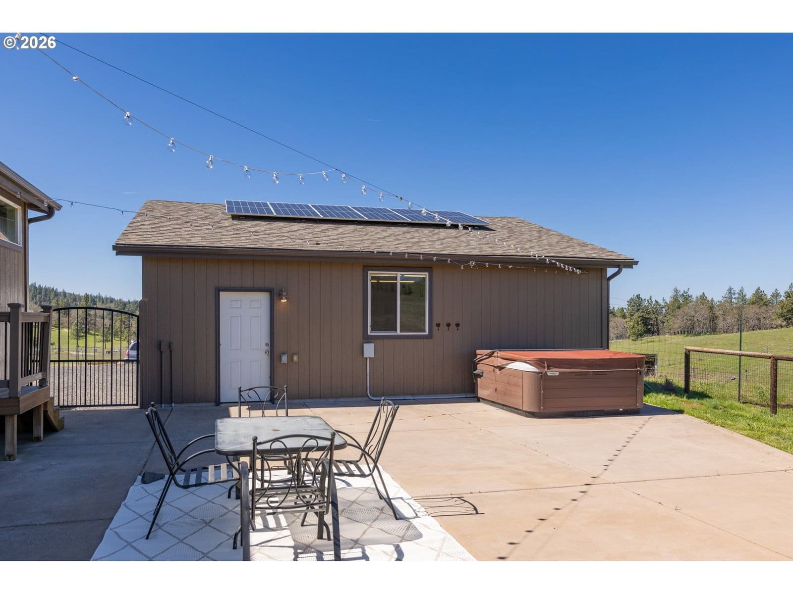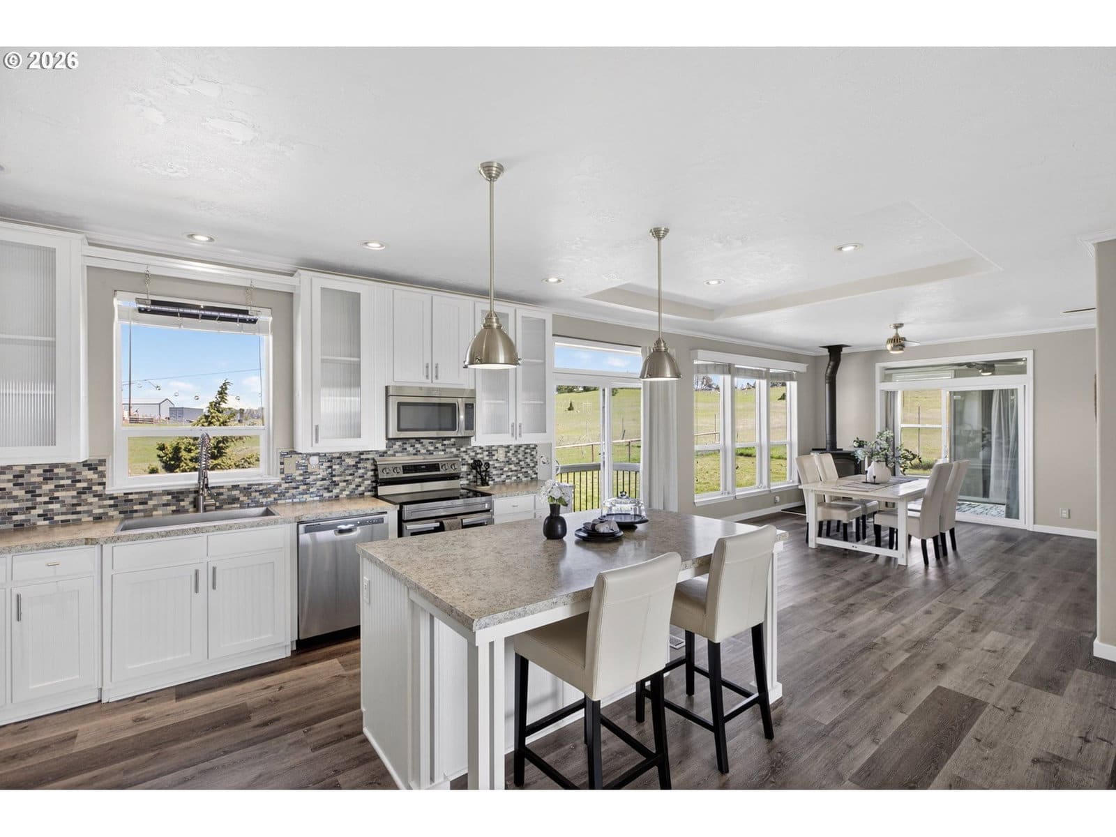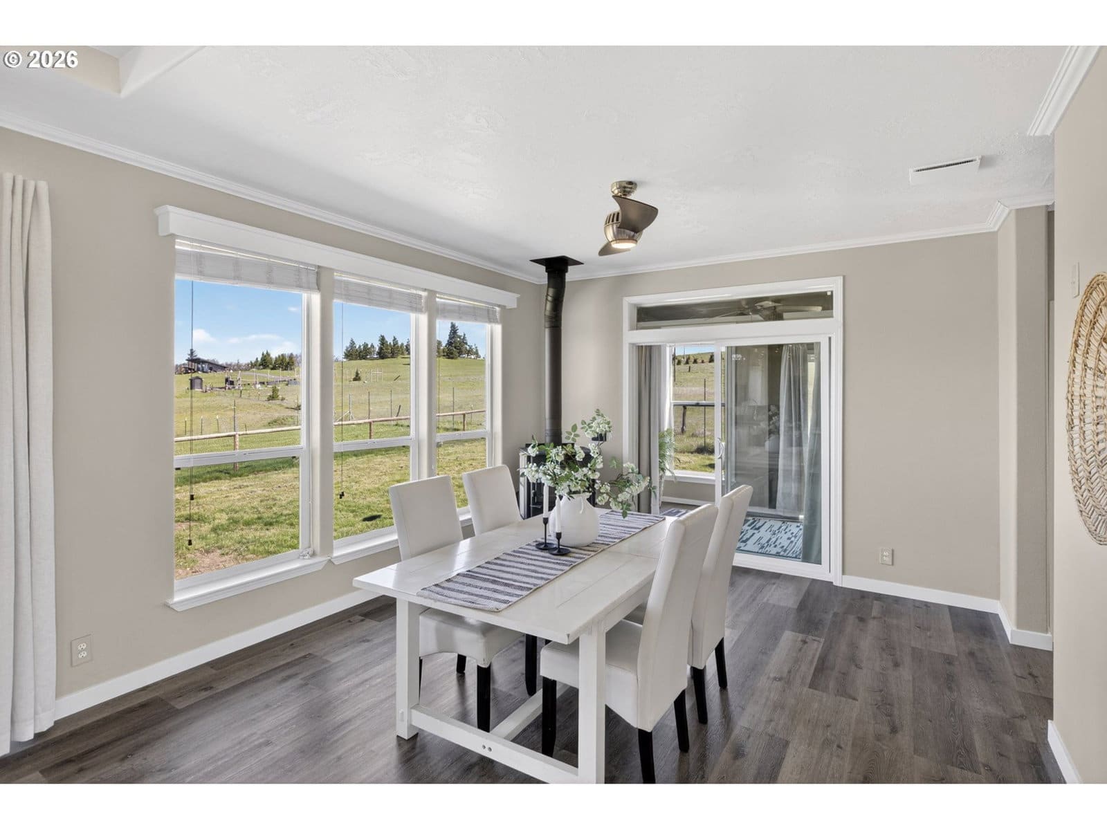Perched atop a hill on almost 6 acres, this beautifully maintained 2015 manufactured home offers sweeping views of Mt. Adams and the perfect blend of comfort and country living. Ideally situated on the dividing line between The Dalles and Mosier, you'll enjoy quick access to both The Dalles and Hood River while savoring your own private retreat. Inside, soaring 10-foot ceilings and an open floor plan fill the home with natural light. The cook's kitchen features a stainless farm sink and large island, while the living area centers around a cozy wood-burning stove. The large primary suite is joined by two additional bedrooms, a full bath, and a laundry room with direct deck access. A heat pump provides efficient year-round comfort, and a connected Starlink system ensures lightning speed internet access. Outside, a deck, hot tub patio, fenced yard, and dog run make outdoor living easy. Wildlife — birds, deer, and wild turkeys — roam freely around the property. A 16 ft electric steel gate and 4 ft man-gate provide privacy and security. This equestrian-ready property includes a 24x24 metal barn with water and separate power, a 14x24 hay extension (approx. 10 tons capacity), and a 12x12 Noble Horse Shelter. Roughly 3 acres are divided into three areas with 4 ft no-climb electrified fence and cross-fencing. A seasonal pond and a large graveled turnaround — with space for horse trailers and RVs — complement the detached oversized garage and 10x20 shed.Recent upgrades include new flooring and baseboards, fresh exterior paint (2024), a converted sunroom/office, and a 10 kW solar system with battery storage for energy efficiency and grid resilience. The home is built on the Cornerstone Foundation System, exceeding requirements for tie-downs, and is also wired for a portable generator for backup power. EFU tax deferral adds further value.A rare opportunity for peaceful country living with modern amenities, room for animals, and easy access to town.