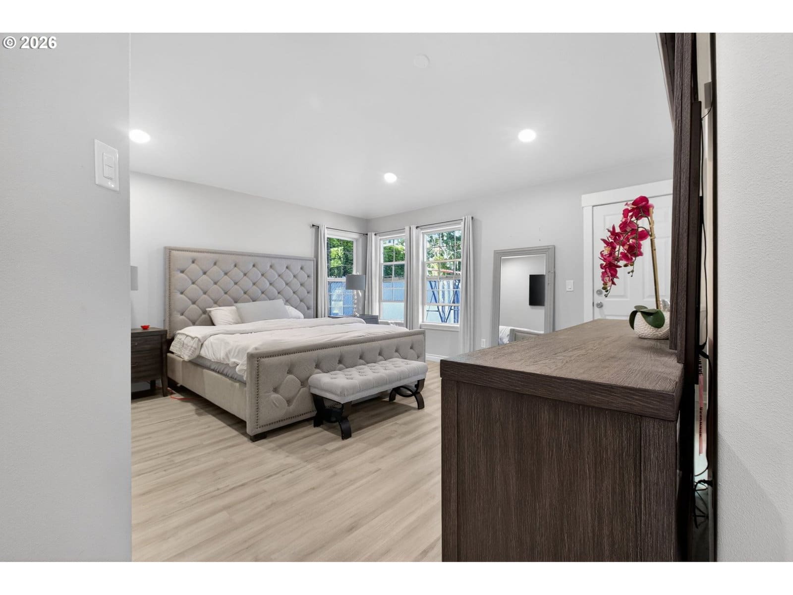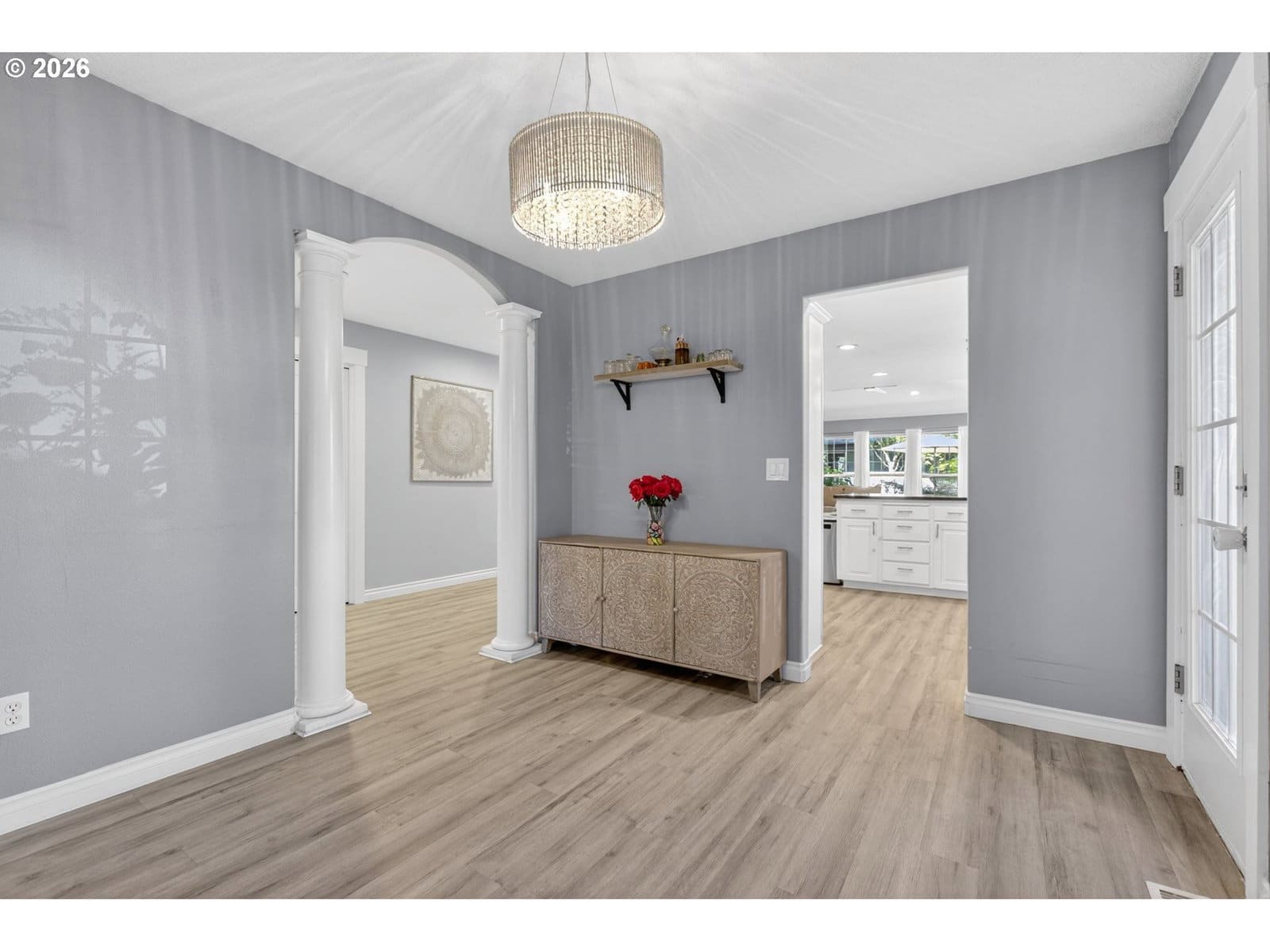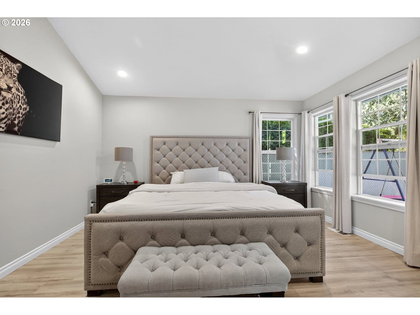 Beautiful single-level home tucked away on a private flag lot, offering comfort, convenience, and an open, light-filled design. Vaulted ceilings in both the living room and primary bedroom enhance the spacious feel, while large windows bring in abundant natural light. The spacious, great-room style, living area features soaring ceilings and a gas fireplace, perfect for year-round enjoyment. The kitchen is both stylish and functional, showcasing granite countertops, stainless steel appliances, and generous storage. New luxury vinyl plank flooring adds durability and a modern touch, complemented by classic oak floors in select areas. The primary suite offers a relaxing retreat with a large soaking tub, a door to the back patio, and ample space. Additional features include air conditioning and ceiling fans for year-round comfort. Enjoy outdoor living with a welcoming covered front porch and a low-maintenance back patio—ideal for relaxing or entertaining without the upkeep. The easy-care yard includes simple landscaping, a storage shed, and a small dog run. Finished with durable, low-maintenance vinyl siding, this home is designed for easy living inside and out.