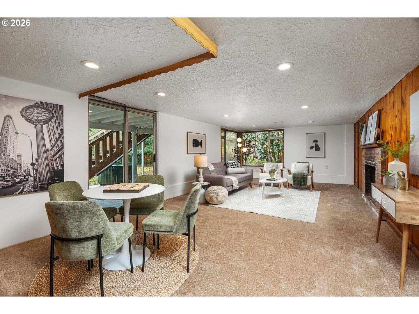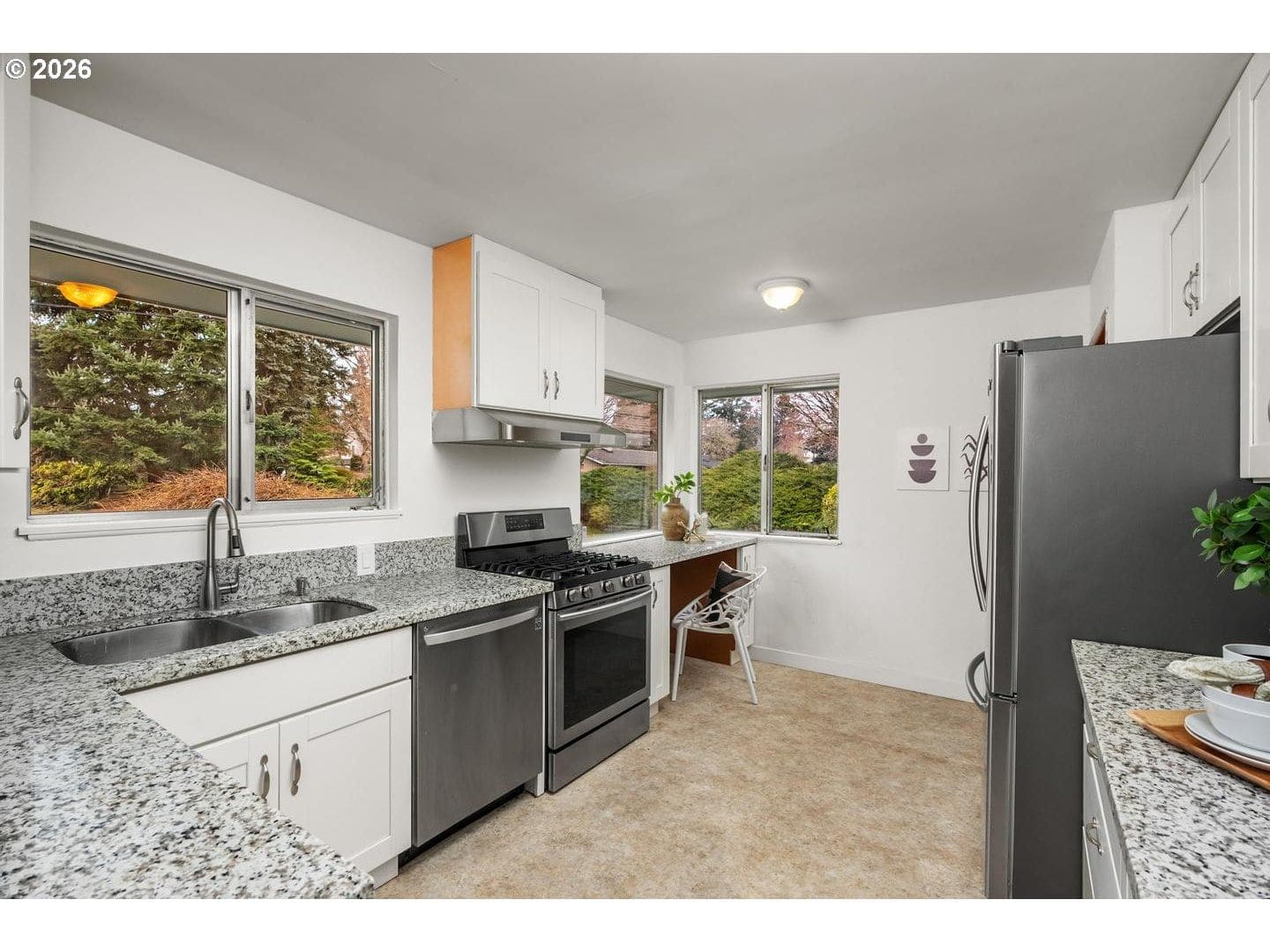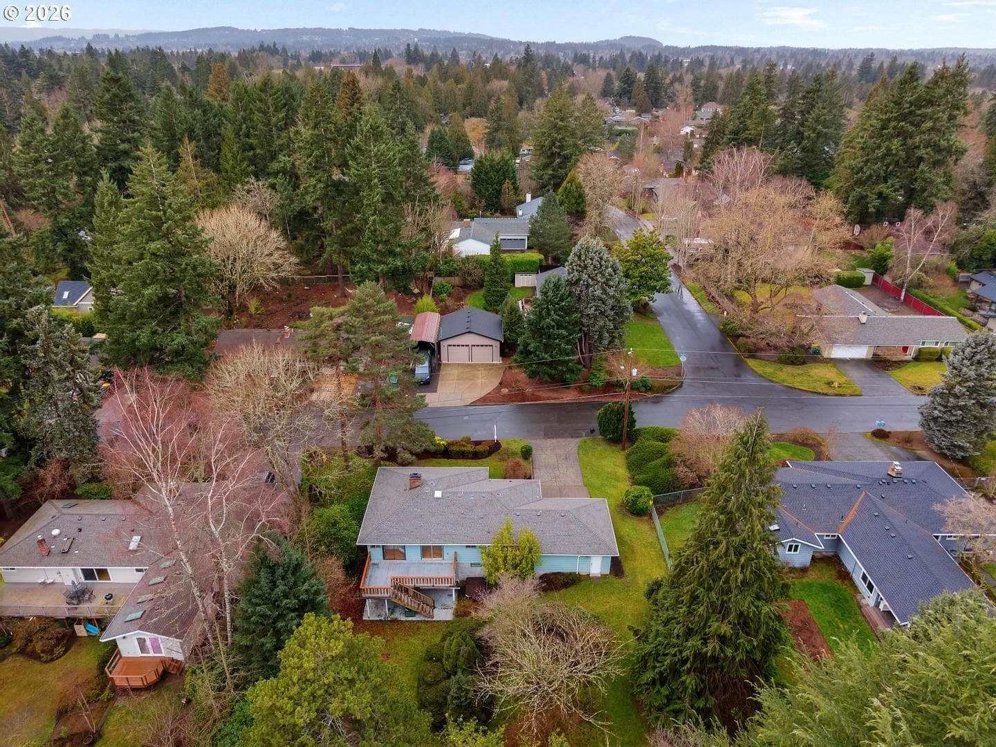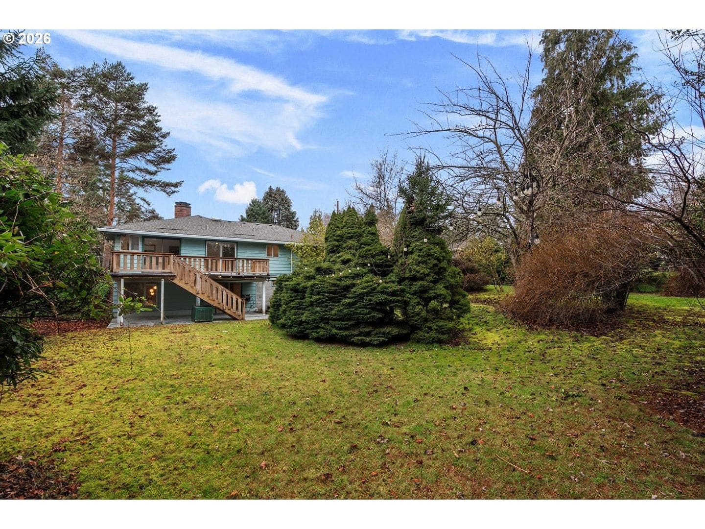 Remodeled, midcentury dayranch with huge, private yard in desirable Garden Home. Updated kitchen features soft-close cabinets, slab granite counters and stainless gas appliances. Remodeled main bathroom has updated two-sink vanity, tile floor and tile shower. Lower bath updated with stacked stone shower and pedestal sink. Spacious living room with big picture window and original midcentury bookcases. Extensive original hardwoods throughout living, dining, hallway and all bedrooms. New interior paint and family room carpet. Fantastic yard with deck, patio and expansive lawn. New architectural roof and gutters, December 2025.