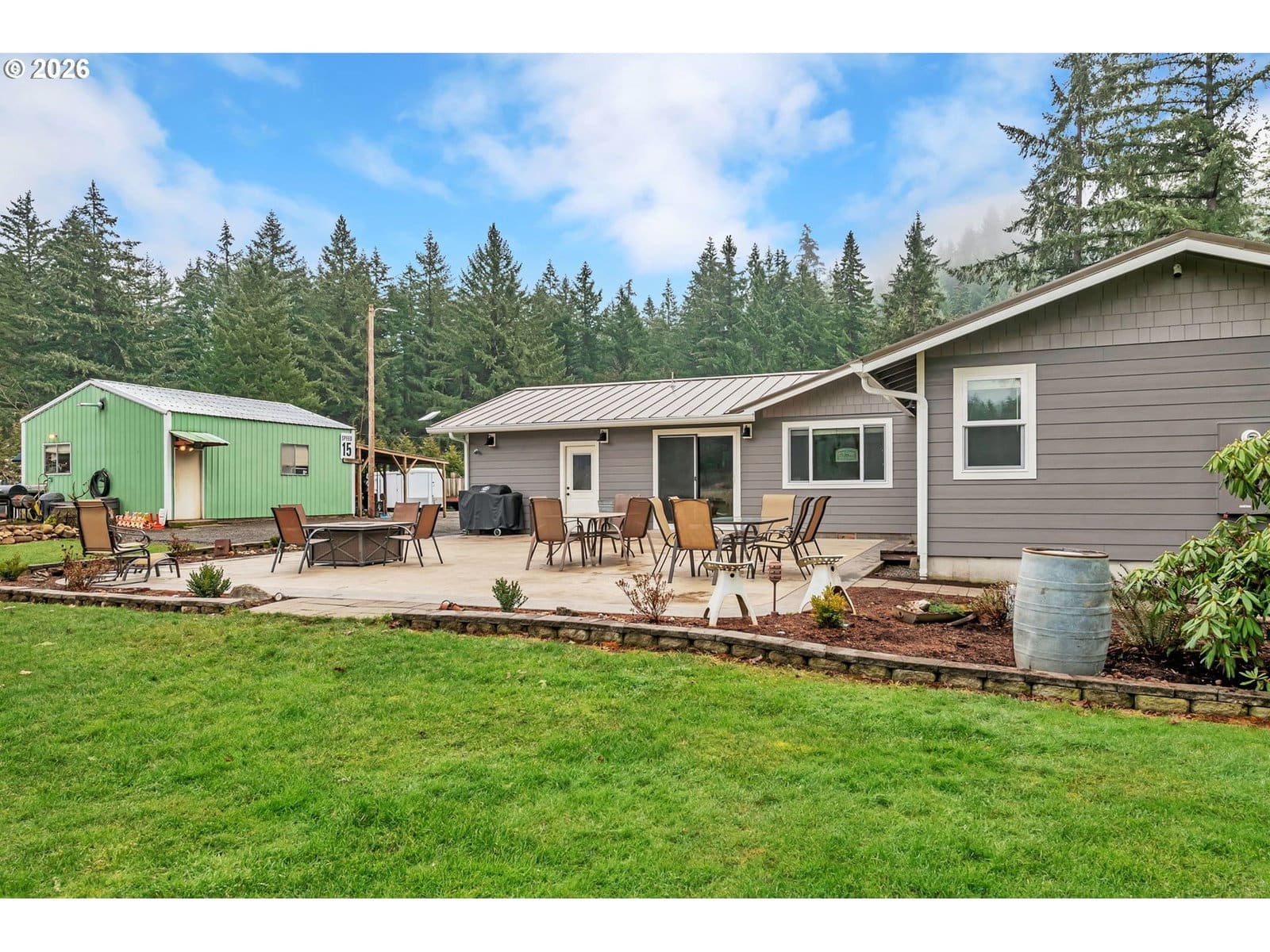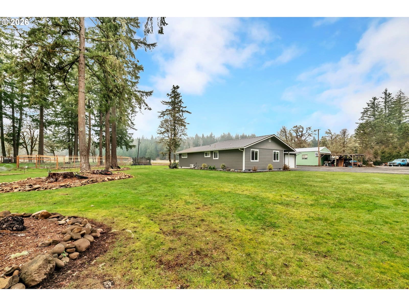 Beautifully remodeled 1,435 sq ft home situated on 1.87 acres of flat, usable land with views. Featuring 3 Bedrooms, 2 Bathrooms a newly added primary suite with vaulted ceilings. The primary bathroom includes radiant floor heating, walk in closet, dual headed shower and deep soaking tub. Outside, the park-like setting is designed for low maintenance and usability, complete with in-ground sprinklers, a detached 20X24 workshop, covered 20'X41' RV/trailer storage with hookups, and an electric gated entry for added privacy and convenience. Large Gravel parking. This property offers a rare combination of privacy, functionality, and move-in-ready condition. Home is outside of the flood zone and does not require flood insurance. Large shop plans may be provided to buyer upon request. Ask your agent for the flyer!