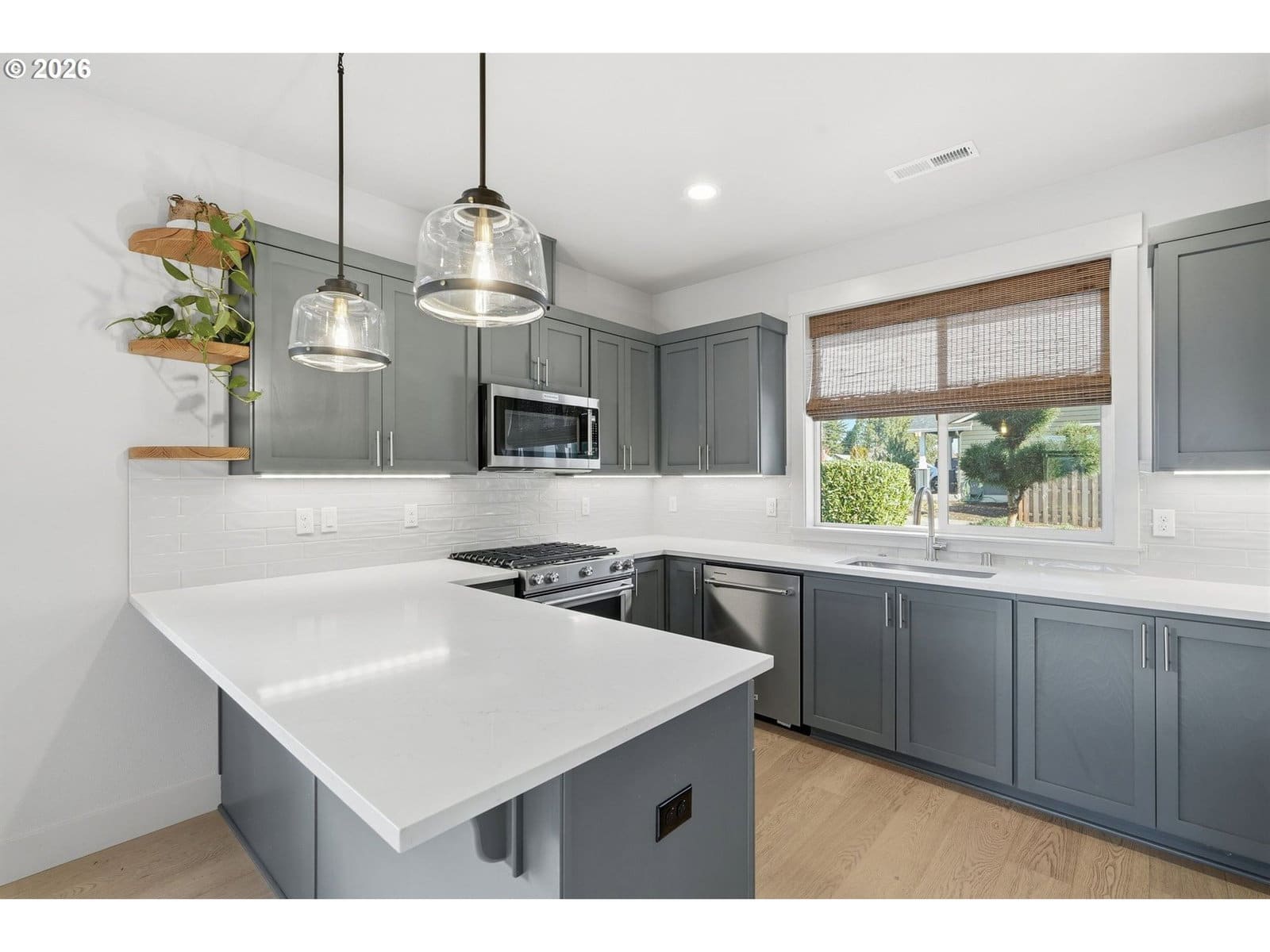 Thoughtfully designed single-level ranch built in 2020 with beautiful finishes throughout. No HOA, and tucked into a small, established neighborhood with no through traffic! The open-concept living space is bright and refined, featuring wide-plank flooring, custom built-ins, and a sleek gas fireplace that anchors the room without overpowering it. The kitchen is both stylish and functional with quartz countertops, stainless appliances, a gas range, and ample counter space with peninsula seating for everyday use. The primary suite is spacious and privately positioned, offering direct access to the covered patio through a separate exterior door, along with an ensuite bath and walk-in closet. Outdoor living shines with a covered patio and beautifully finished stone gas fireplace, creating a seamless extension of the interior living space. An added concrete pad beyond the covered patio provides extra room for entertaining and outdoor gatherings. Beyond the patio, a permanent landscaped greenbelt / water retention area provides lasting privacy and an open, natural backdrop—no rear neighbors, just space and calm. Modern construction, single-level convenience, refined finishes, and a rare private setting combine to make this home a standout! Conveniently located near everyday shopping, major highways, and Portland Airport for easy commuting and travel.