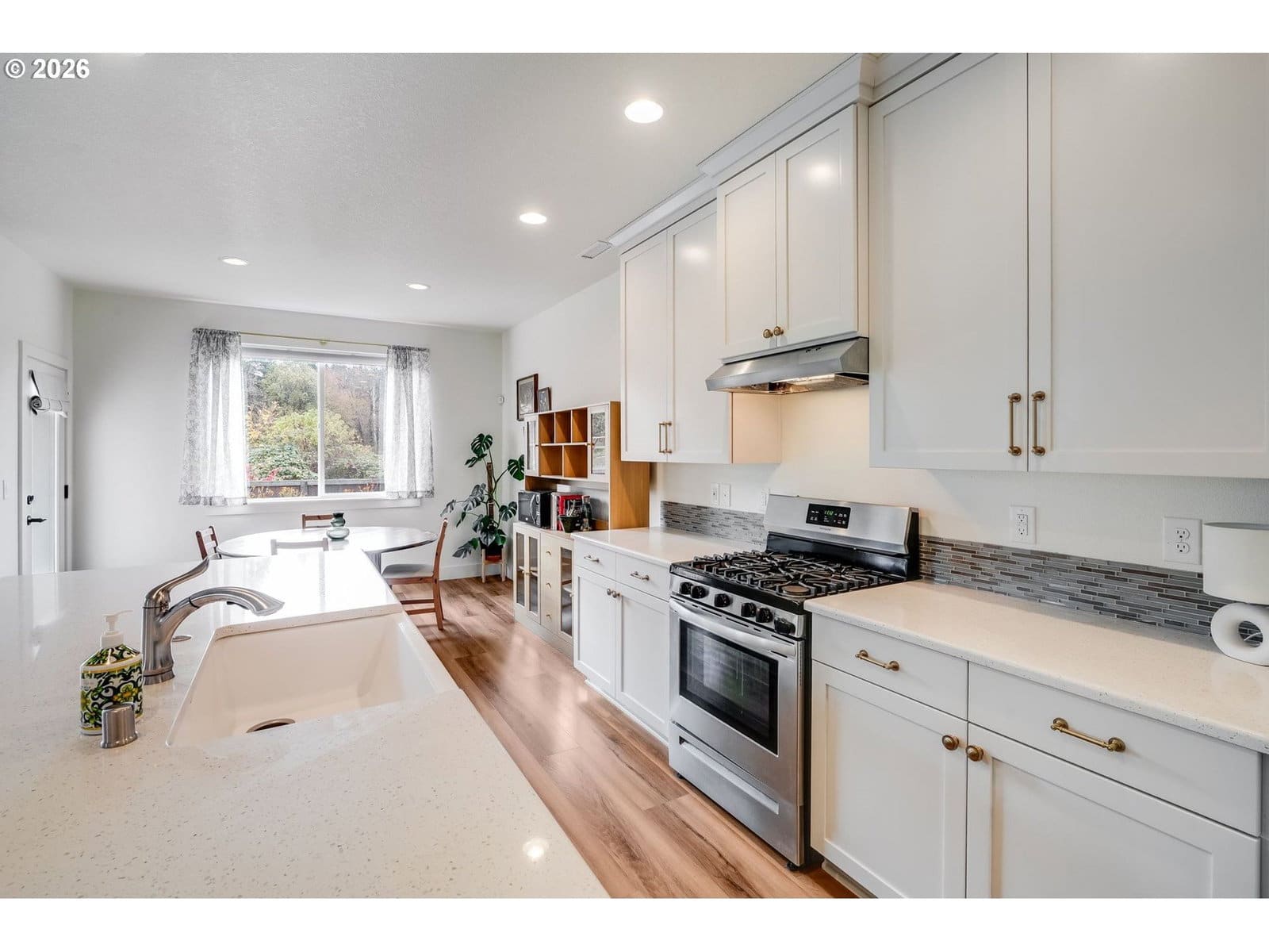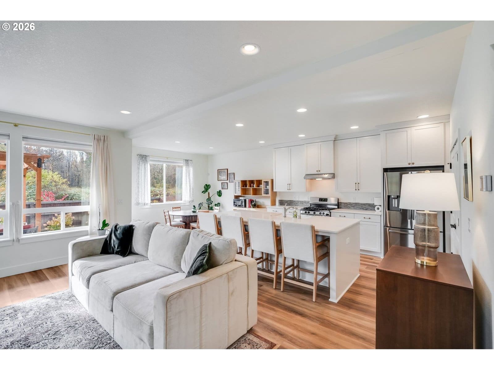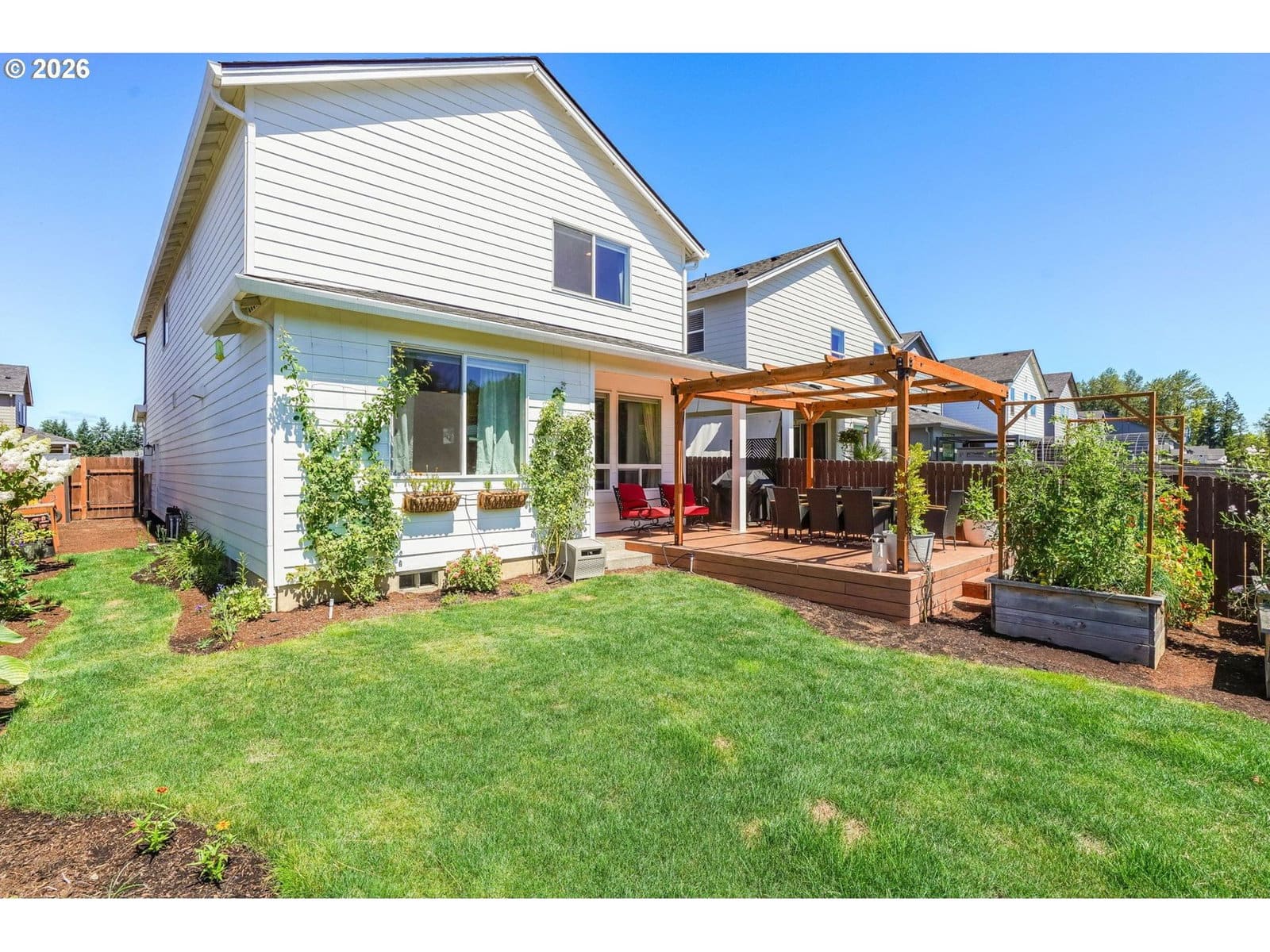 This thoughtfully designed home features an open-concept layout with 9-foot ceilings, a dedicated office on the first floor, and a stunning upgraded kitchen with freshly painted cabinets. The kitchen is a true standout with stainless steel appliances, quartz countertops, full-height cabinetry, custom paint, a large island with seating, and a oversized walk-in pantry. The inviting living area includes a modern electric fireplace and built-in storage, while the upstairs loft provides a versatile bonus space ideal for a media room, playroom, or second office. The private primary suite offers double sinks, a soaking tub, and a generous walk-in closet. Step outside to a backyard retreat designed for relaxation and gardening enthusiasts. A covered Trex deck overlooks beautifully maintained garden beds filled with roses, flowers, tomatoes, and more, along with mature trees that enhance the privacy of the no-rear-neighbor setting. Additional highlights include extra cabinetry throughout, a convenient upstairs laundry room with a deep sink, and included washer, dryer, and refrigerator — making this home truly move-in ready!