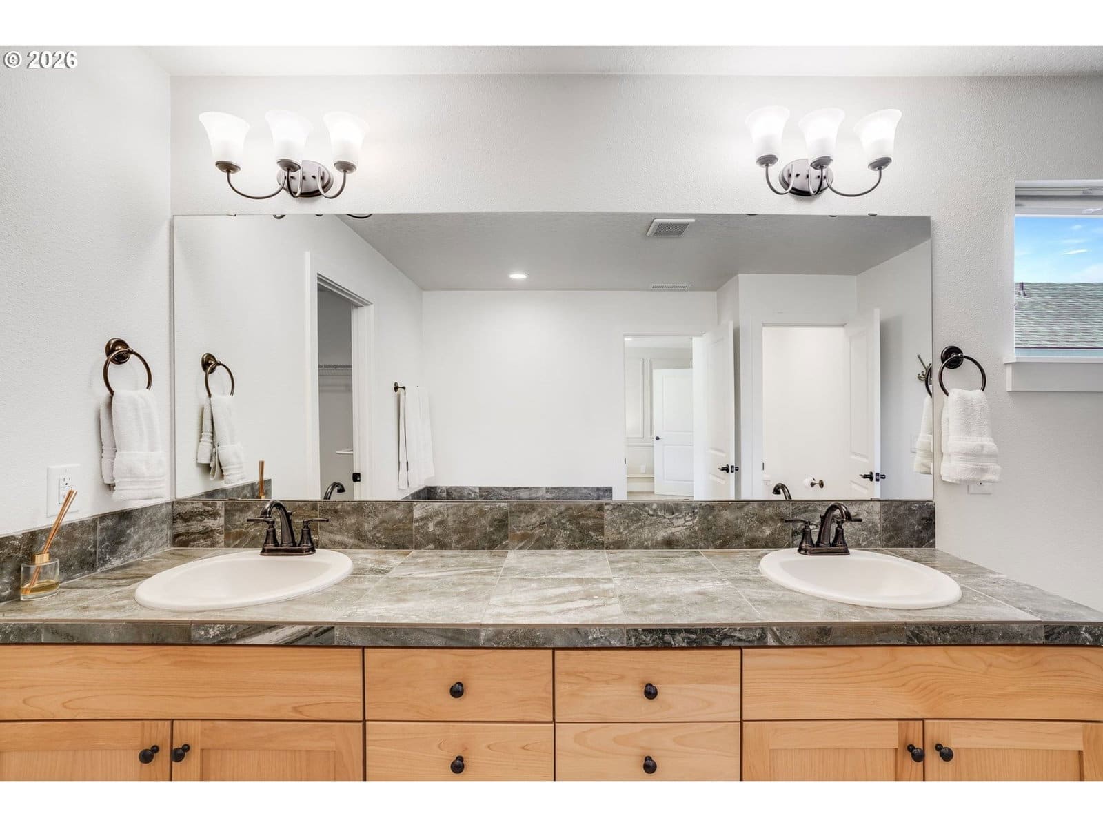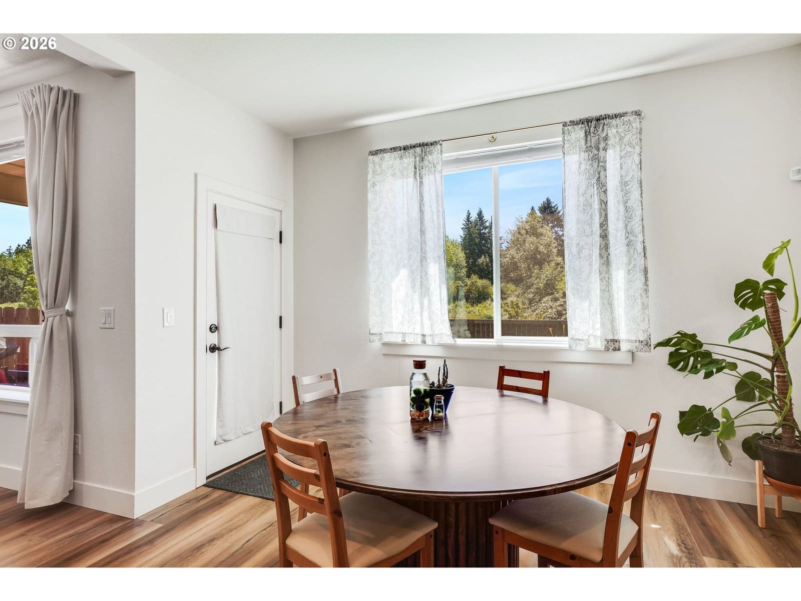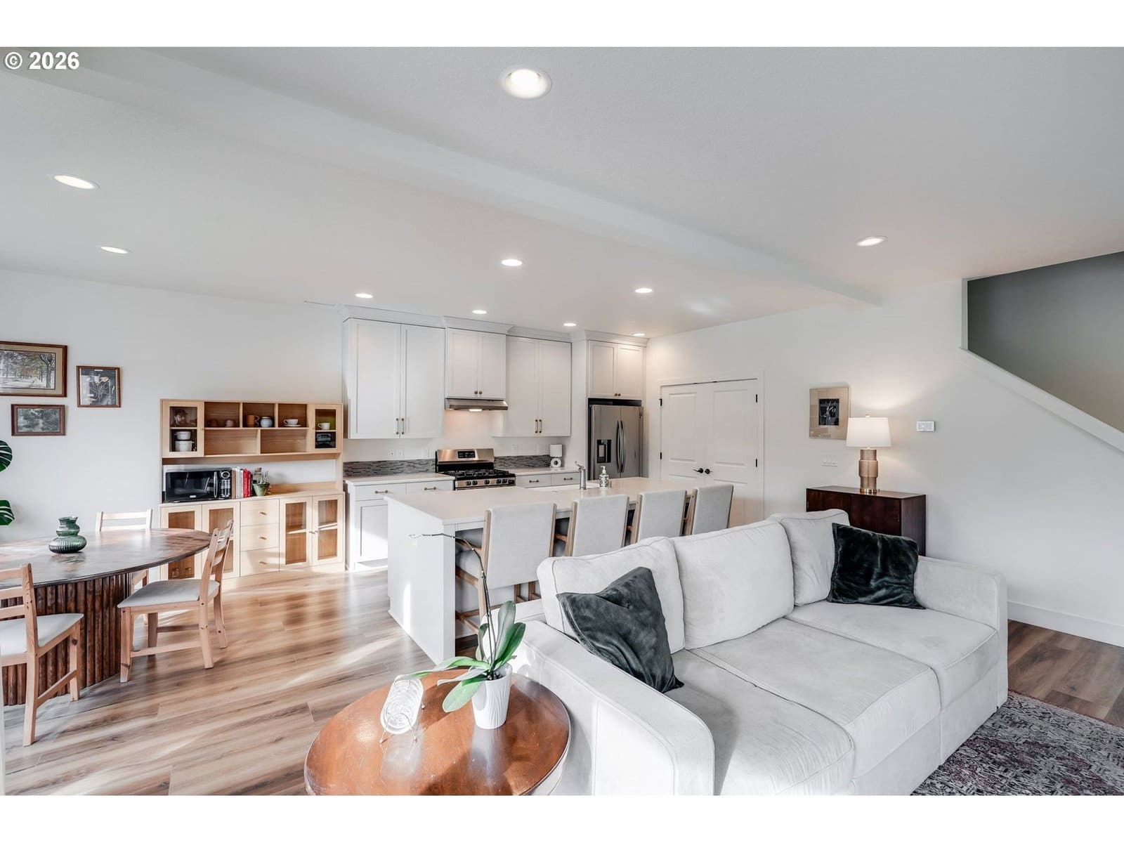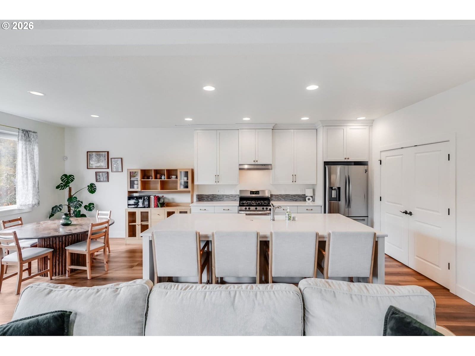 This thoughtfully designed home features an open-concept layout with 9-foot ceilings, a dedicated office on the first floor, and a stunning upgraded kitchen with freshly painted cabinets. The kitchen is a true standout with stainless steel appliances, quartz countertops, full-height cabinetry, custom paint, a large island with seating, and a oversized walk-in pantry. The inviting living area includes a modern electric fireplace and built-in storage, while the upstairs loft provides a versatile bonus space ideal for a media room, playroom, or second office. The private primary suite offers double sinks, a soaking tub, and a generous walk-in closet. Step outside to a backyard retreat designed for relaxation and gardening enthusiasts. A covered Trex deck overlooks beautifully maintained garden beds filled with roses, flowers, tomatoes, and more, along with mature trees that enhance the privacy of the no-rear-neighbor setting. Additional highlights include extra cabinetry throughout, a convenient upstairs laundry room with a deep sink, and included washer, dryer, and refrigerator — making this home truly move-in ready!