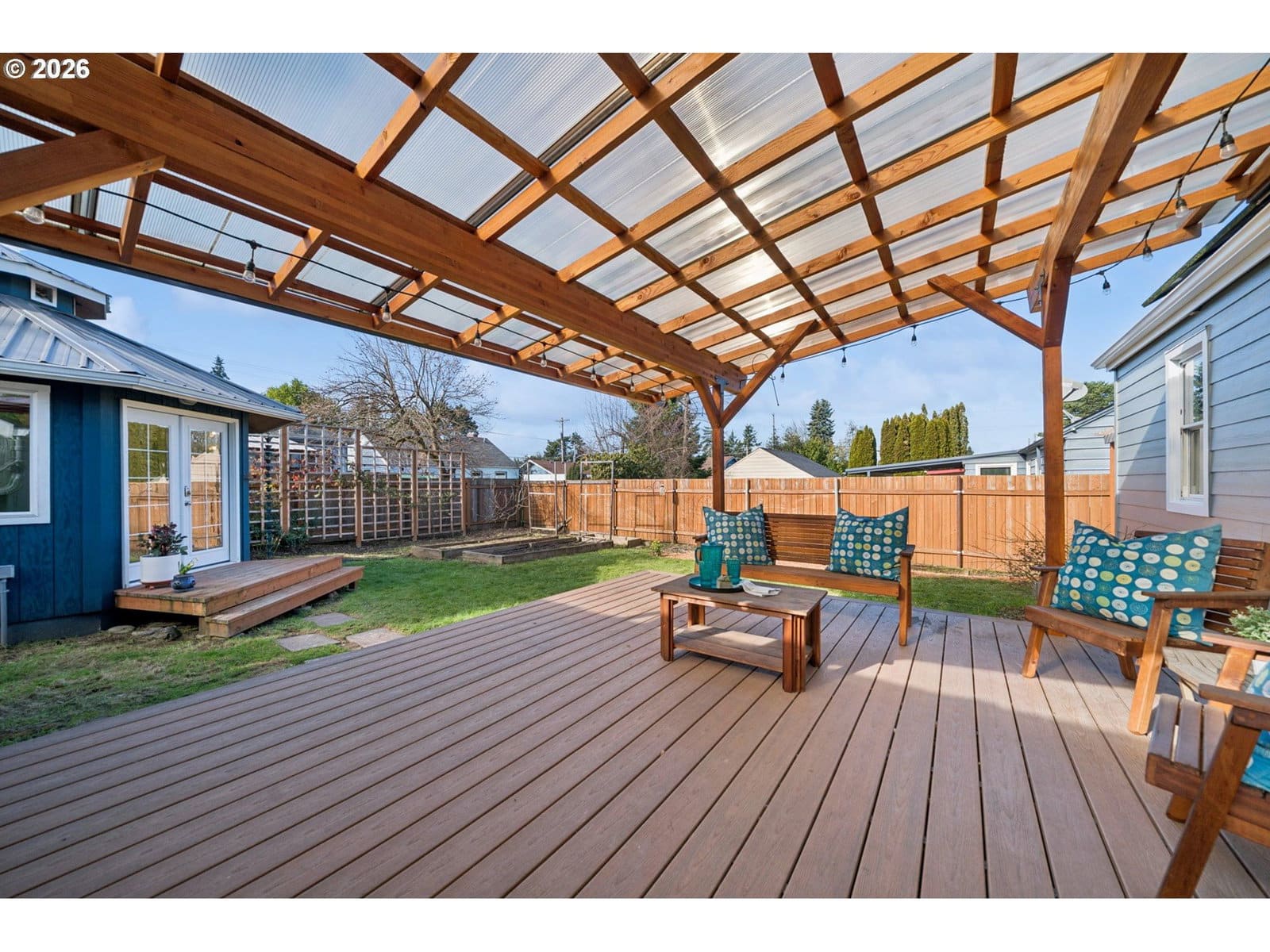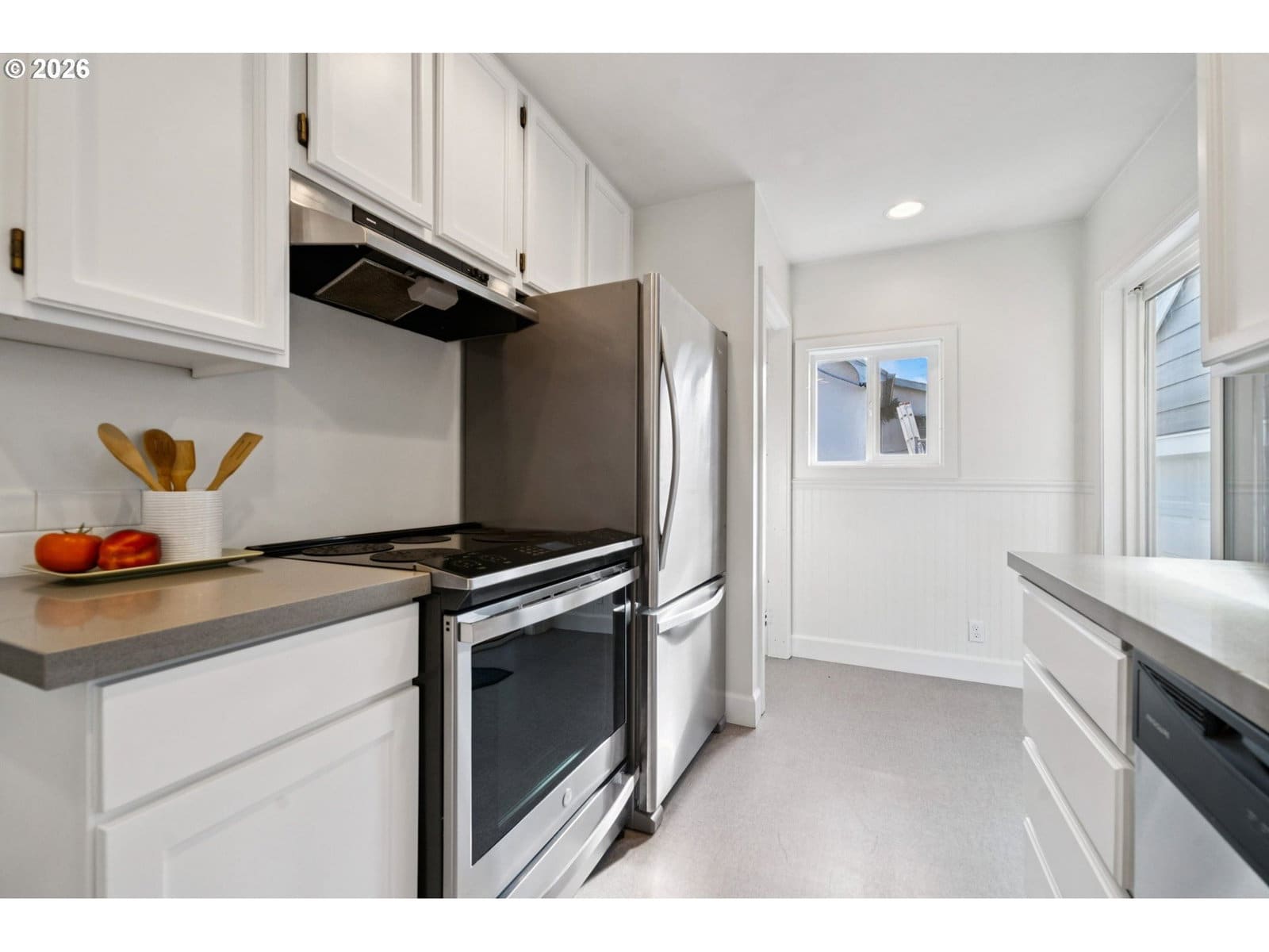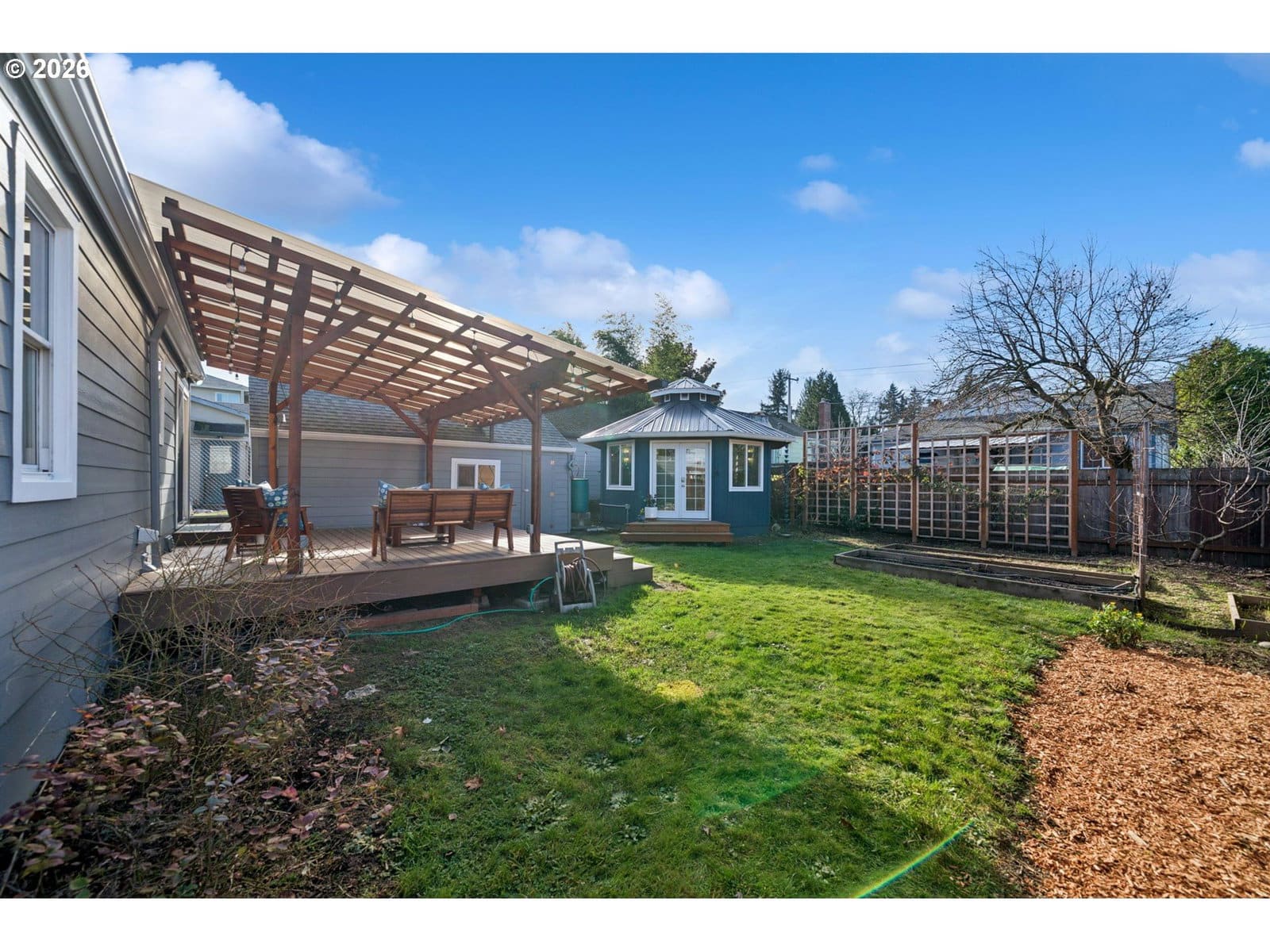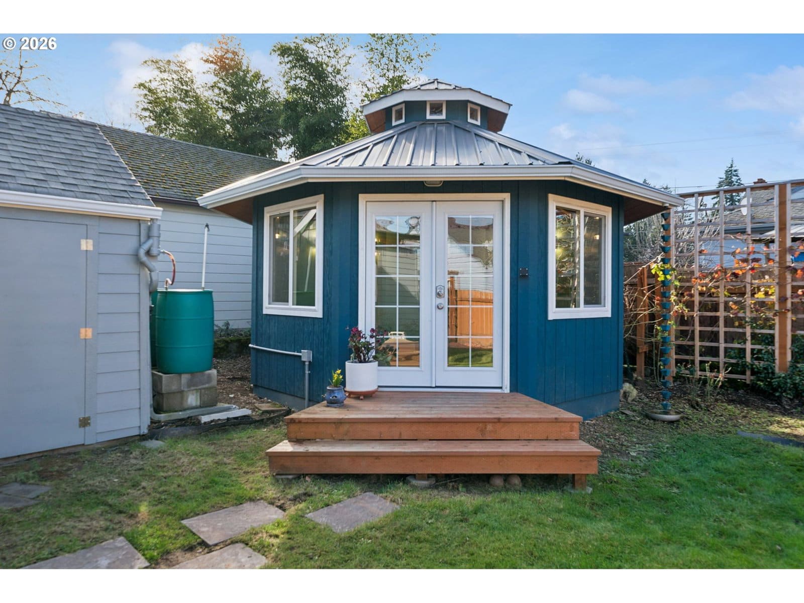 Welcome home! This cozy, well-maintained and updated 3-bed, 2-bath bungalow with a fully finished basement offers all you could dream of in flexible living space and modern upgrades. The inviting main living area features hardwood floors, a gas fireplace, and a built-in eating nook, while dual heating systems (forced air plus heat pump added in 2024) provide year-round comfort. Energy efficiency shines with fully owned solar panels installed in 2019. Natural light flows throughout the home and includes a solar tube added in the main floor bath. The kitchen showcases quartz countertops, a brand-new fridge, and induction oven with air fryer. Glass sliding doors open seamlessly to the backyard where the low-maintenance composite deck connects to a stunning covered arbor built in 2023, perfect for relaxing or entertaining. Outside, the fully fenced yard is just starting to show touches of spring but will soon feature blossoming star jasmine and passionflower. Multiple raised beds are primed for planting while still leaving plenty of room to play in the grass. A standout feature is the 199-sq-ft detached studio built in 2023, fully insulated and with a metal roof and minisplit heating/cooling. This extraordinary space is ideal for an office, creative space, yoga/art studio or even the occasional guest. At the front of the home, a professionally maintained maple tree and fresh exterior paint enhances the home’s curb appeal while the detached garage provides additional storage. Additional exterior improvements include a new driveway (2020), added front retaining wall, and radon mitigation. Situated on a quiet street with excellent access to Portland International Airport and close to outdoor recreation at Rocky Butte, this home blends comfort, efficiency, and versatility in a convenient Portland location. OPEN HOUSE: Sat. Feb. 14, 1-3pm [Home Energy Score = 7. HES Report at https://rpt.greenbuildingregistry.com/hes/OR10243129] Mini split heating and cooling