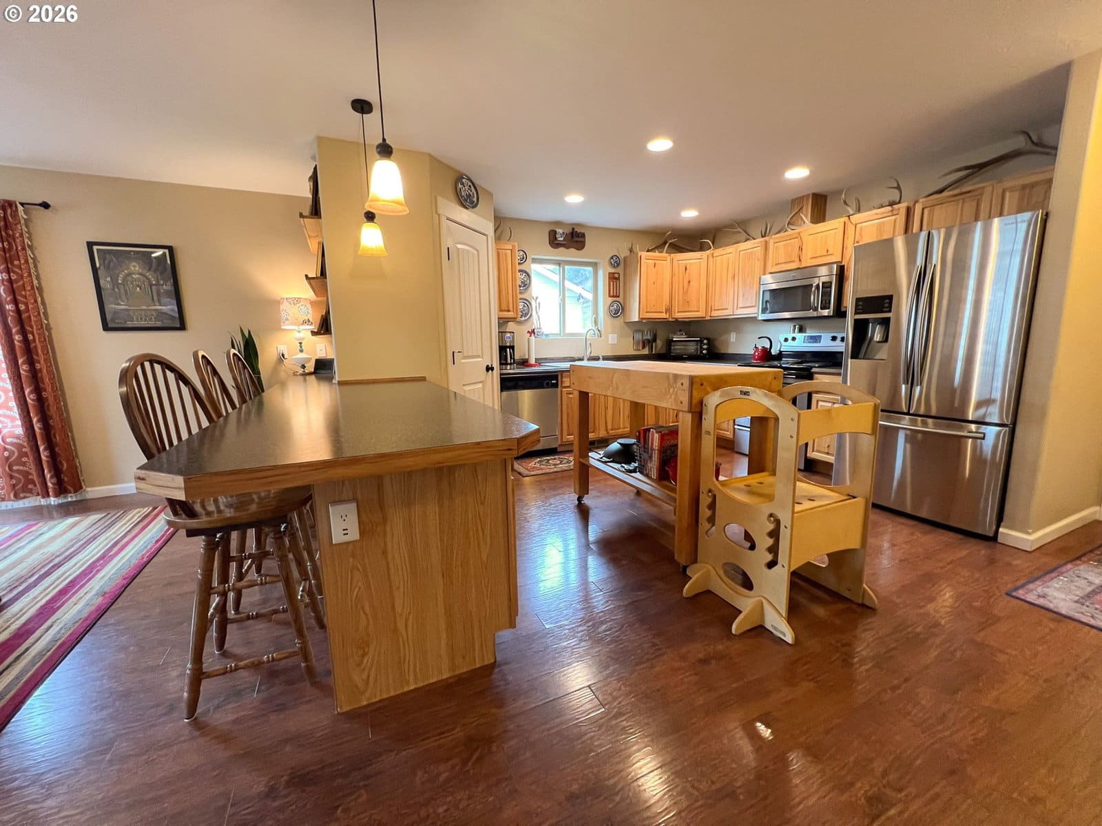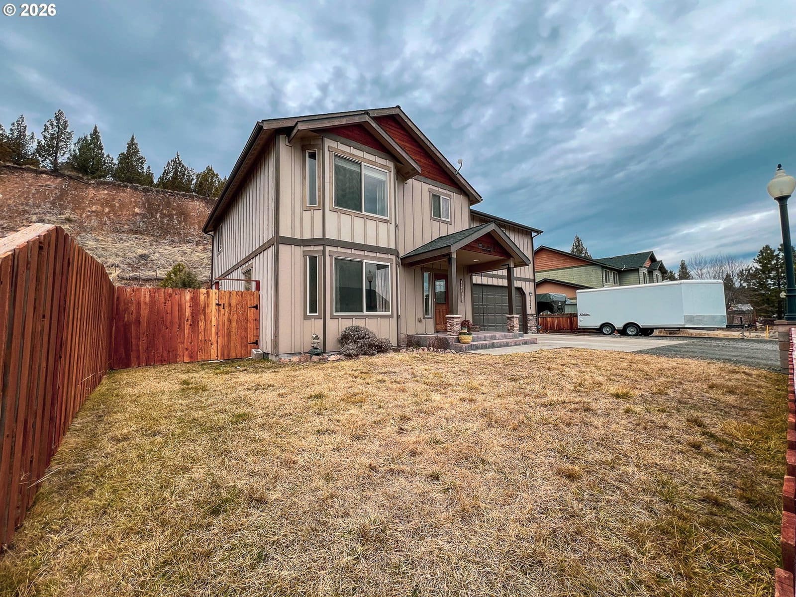 Move-in-ready, well-maintained home with spacious and functional living areas. This 2011 stick-built home features an open-concept main floor with a large living and dining area, laminate flooring, and a kitchen designed for everyday living and entertaining. The kitchen offers bar stool seating, Formica countertops, a pantry, hickory cabinets, and appliances are included. A convenient laundry room and half bath are also located on the main level.Upstairs, you will find a second generous living space, three bedrooms, and two full bathrooms. The primary suite includes wood flooring, a walk-in closet, a granite countertop vanity, and a walk-in shower.The home is equipped with a 2018 ducted heat pump for efficient heating and cooling throughout. An attached 484 sq ft garage provides additional storage and convenience.Outside, enjoy a deck with pergola, a fully fenced backyard with garden shed, and fresh sod installed in 2025. The covered front deck features a stamped concrete entry, adding to the home’s curb appeal.