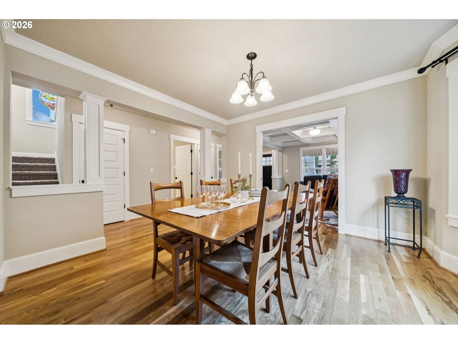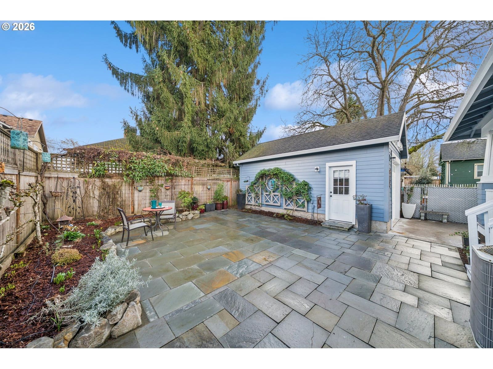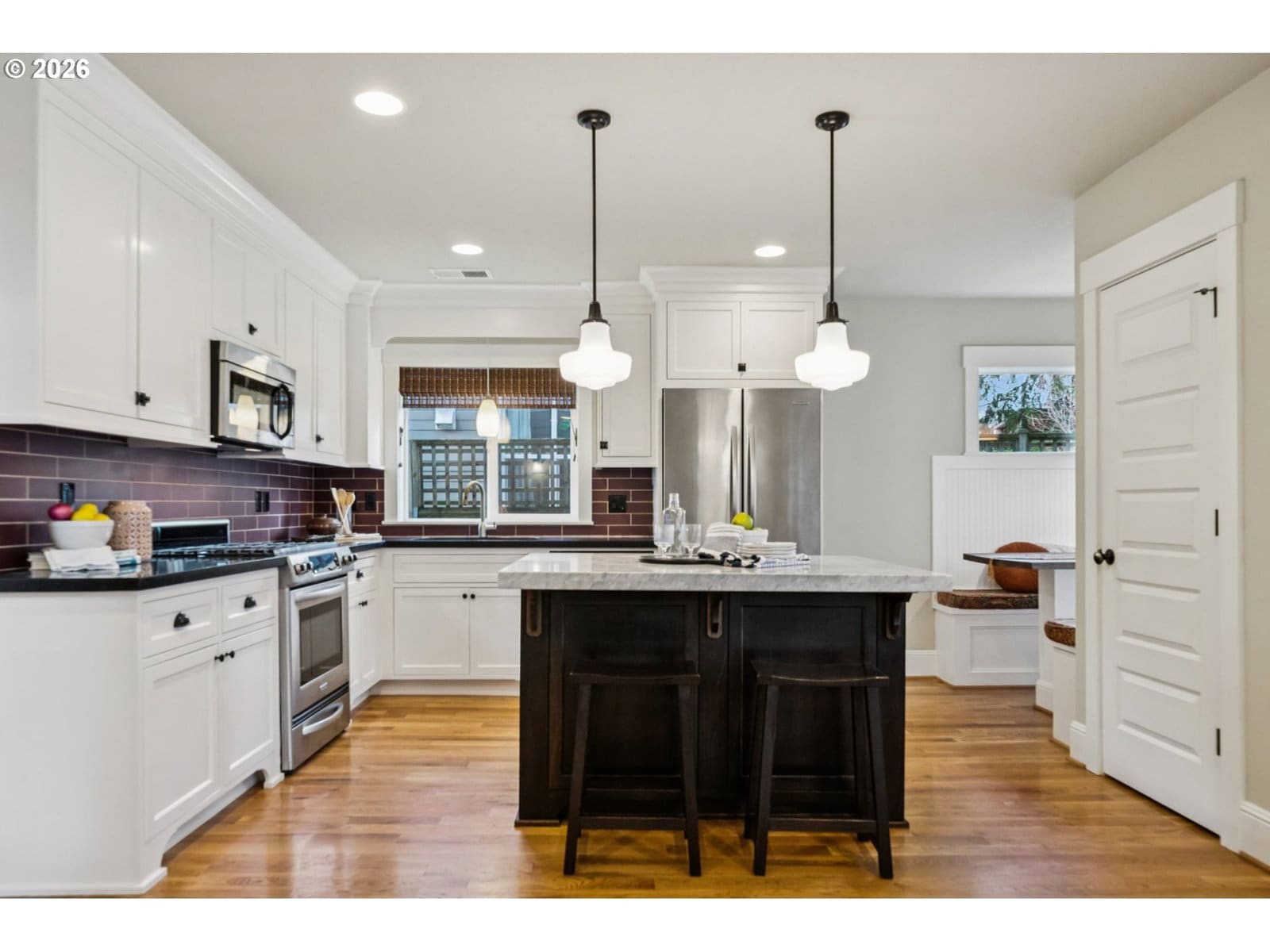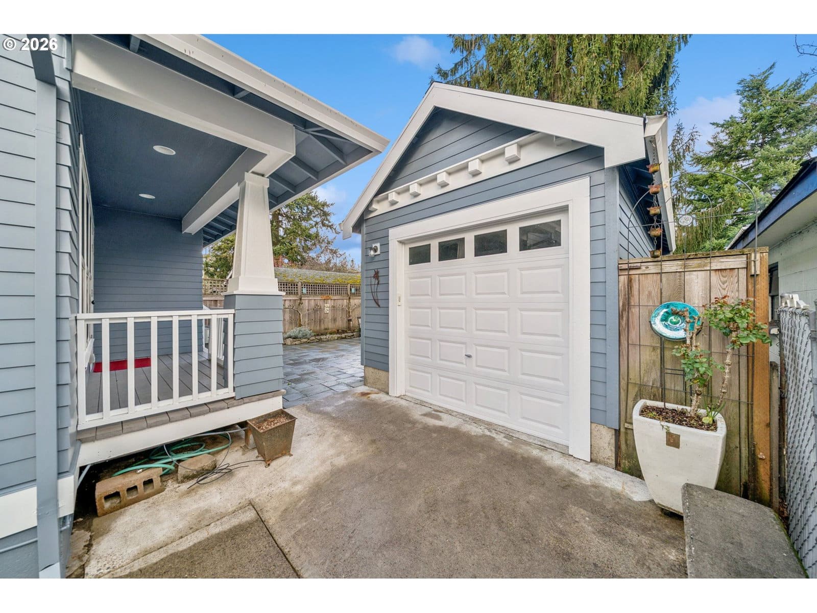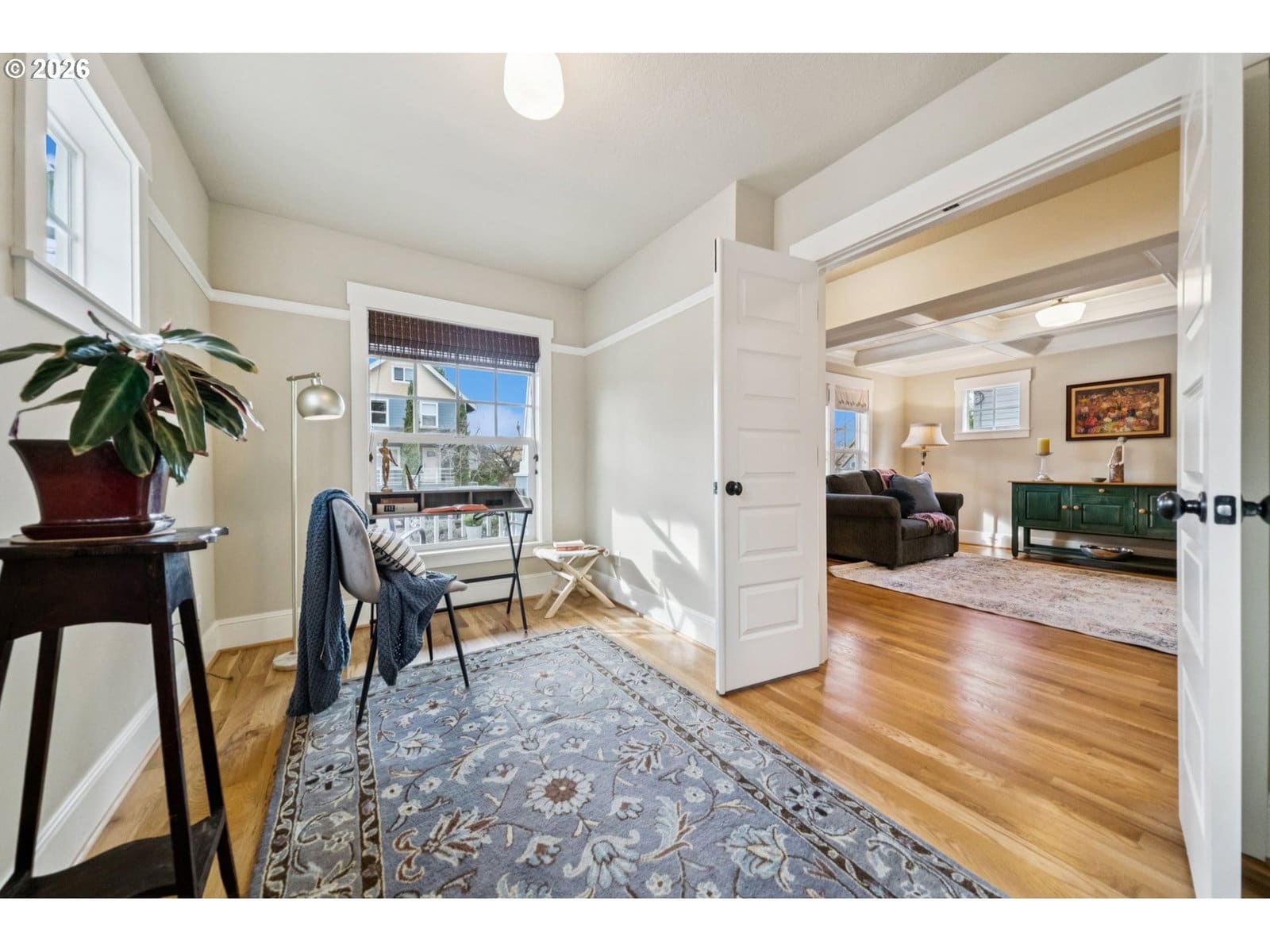 Located in the vibrant Alberta Arts District, this 2013 Craftsman home with 3-bedrooms, main floor office, and 2.5-baths, blends classic charm with modern comfort and fantastic location. Step up to the large, covered front porch and into the spacious living room with hardwood floors and coffered ceilings. Pocket doors open to the formal dining room with bay window while French doors frame the main floor office providing flexible work-from-home or dedicated creative space. At the back of the home, the open kitchen and family room flood with natural light. Centered around a beautiful marble island, the kitchen features a built-in eating nook, generous kitchen pantry, and cozy family room anchored by a gas fireplace with blower. The main floor guest bath includes a utility room while under-the-stairs closet space offers additional room for storage. Upstairs, the spacious primary suite features recessed ceiling lighting, a generous walk-in closet and an ensuite bath with marble counters, tile surrounds, a soaking tub, and walk-in shower. Daily life is a breeze with two additional upper-level bedrooms, upper-level laundry, an additional full bath, plus a central vacuum system and AC throughout the home. Back downstairs, step easily from the family room onto the back porch and out to the low-maintenance and beautifully hardscaped Pennsylvania Bluestone patio. Outdoor living shines with this courtyard style space perfect for entertaining. Espalier pear trees, vines, and shrubs line the private yard and are just beginning to wake up from their winter sleep. With a long driveway and detached garage, the home offers plenty of parking and additional storage. Ideally situated in one of the most pedestrian and bicycle-friendly neighborhoods in Portland with easy access to Alberta shops & restaurants, the North Williams Avenue bike corridor, convenient access to I-5 and downtown Portland, this home offers excellent connectivity for commuting, recreation, and everyday amenities. [Home Energy Score = 6. HES Report at https://rpt.greenbuildingregistry.com/hes/OR10243760]
