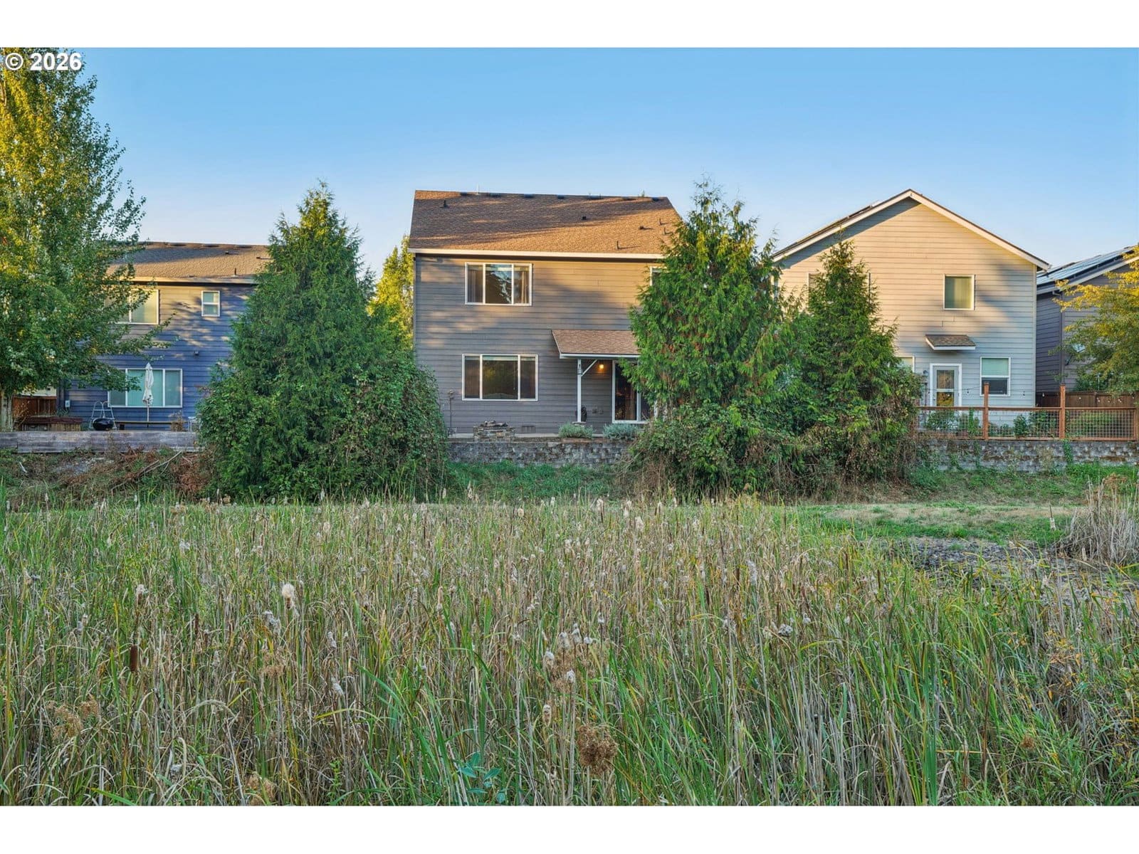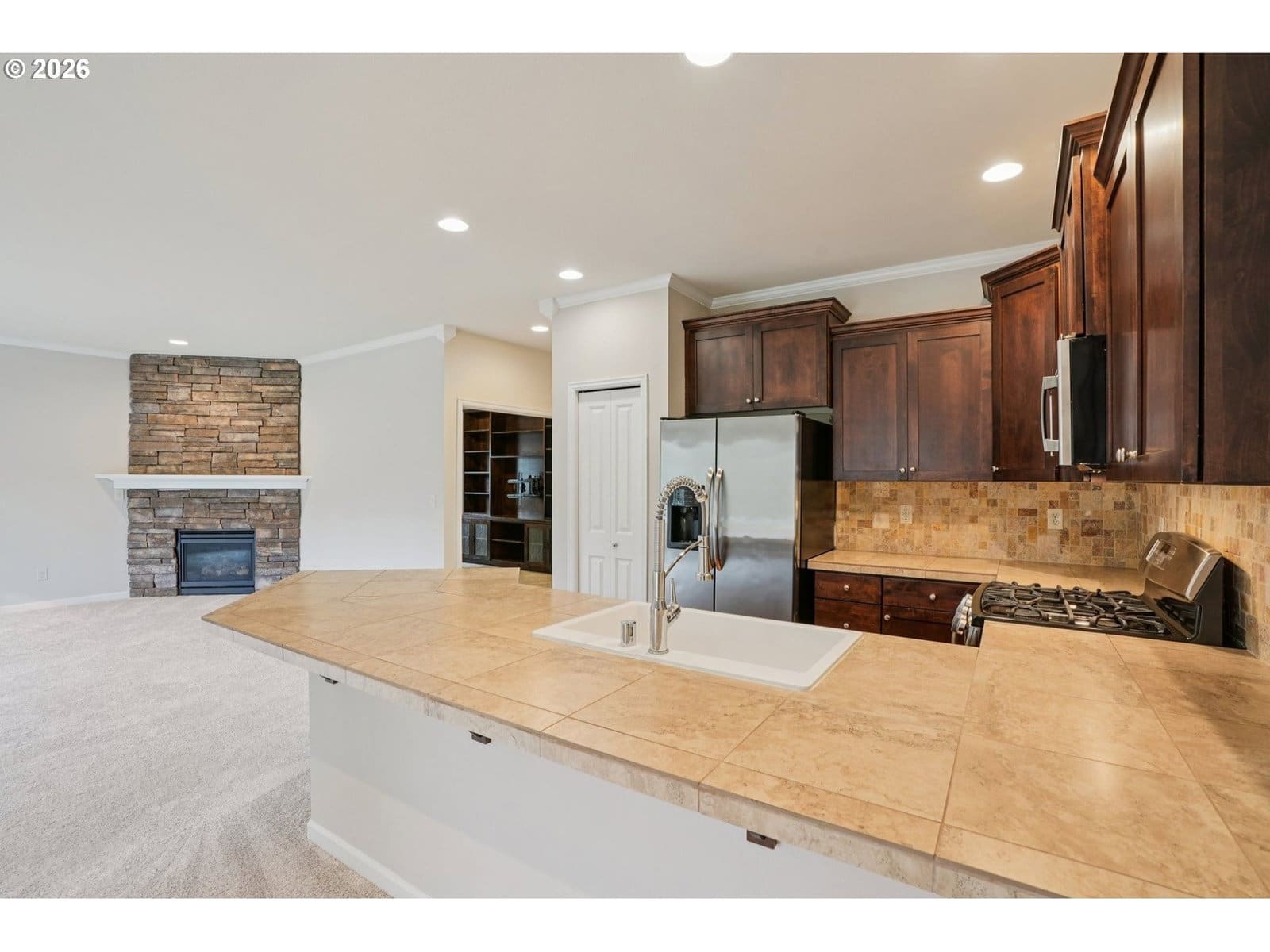 Tucked within a quiet community featuring private trails and pathways, this home backs to four acres of Belmont NW HOA green space, offering privacy and a natural backdrop of mature trees and hillside views. The backyard is designed for gathering, with stone pavers and a custom gas firepit overlooking the open space beyond. Recent updates include fresh interior paint and new carpet throughout. The main level offers 9-foot ceilings, a dedicated office or den with French doors and custom built-ins, and an open-concept kitchen with an eat-up peninsula that flows seamlessly into the dining area and family room with a stone fireplace. Upstairs, the spacious primary suite features a remodeled ensuite bath with a soaking tub and walk-in shower. Three additional bedrooms, a full bathroom, and a dedicated laundry room complete the second floor. A large covered front porch enhances the home’s curb appeal, while the garage includes built-in storage and a worktable area that will remain with the property. This well-maintained home offers thoughtful updates, functional spaces, and a setting that feels connected to nature.