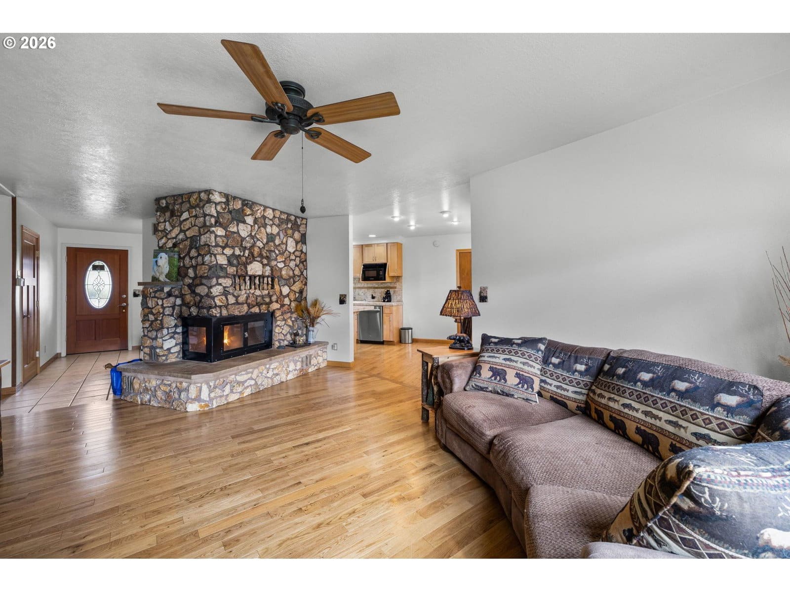 This charming three-bedroom, two-bathroom home spans 1,435 square feet and is situated on a generous 1.18-acre lot. The interior has been updated and features a propane fireplace, an oil furnace, and a forced air air conditioning unit. The property boasts a stamped concrete patio, is fully fenced, and is landscaped with block retaining walls and flowerbeds. Additionally, there is a shop available for storage or personal hobbies, along with ample space for an RV, ATVs or extra vehicles.Located in a sought-after area, this home offers stunning mountain views and large lots that provide ample personal space, all within minutes of public land.