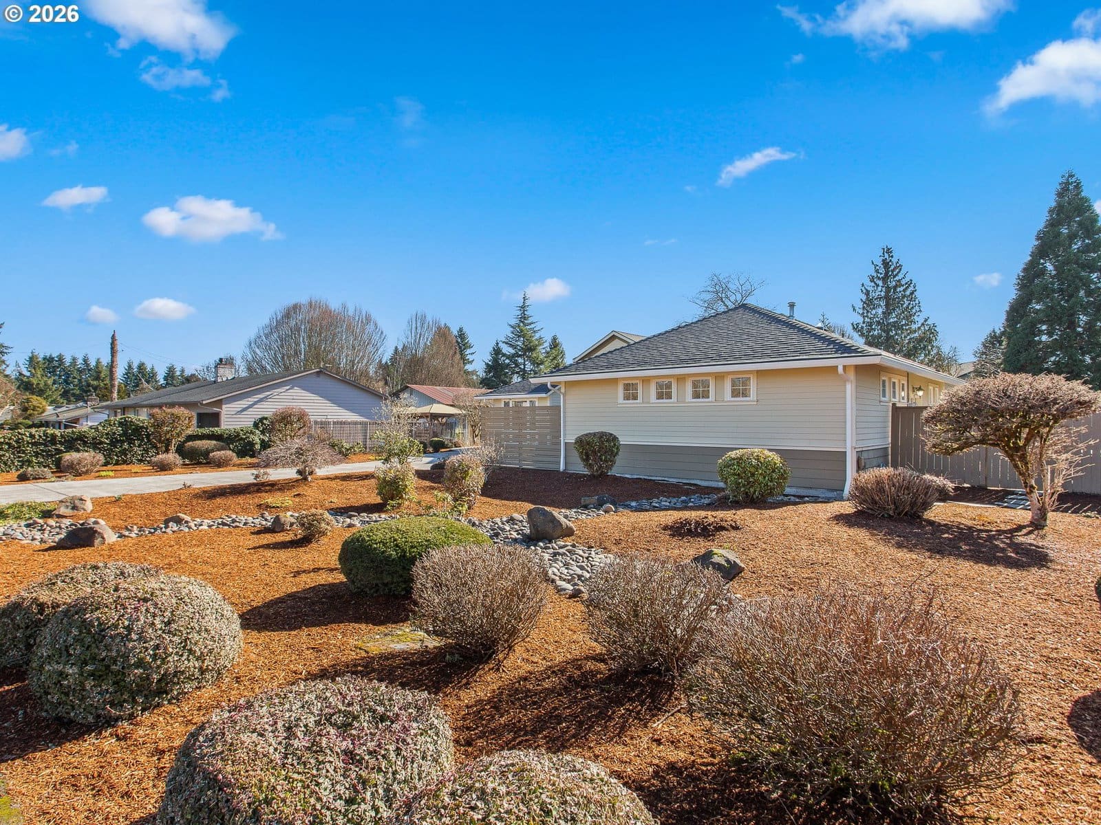 Quality abounds in this exceptional single-level home offering 4 BRs & 3.5 BAs on a professionally landscaped .39-acre lot. Blending Northwest Craftsman style with a thoughtfully designed floorplan, this home delivers space, privacy, upgraded finishes, and effortless one-level living. A grand entry opens to the vaulted great room anchored by a high-end gas FP with custom built-ins. Skylights and a wall of windows flood the space with natural light. A centrally located dining area connects seamlessly to the great room and kitchen. New carpet in the great room and dining room complements the hardwood floors, while wide hallways and doors enhance comfort and livability. The kitchen offers ideal separation while remaining connected to main living spaces. Extensive cabinetry, granite countertops, and premium stainless built-in appliances—including a Viking range, built-in refrigerator, and microwave—elevate the space. A window-wrapped nook provides the perfect spot for casual dining. The bedroom layout is both unique and flexible, featuring two spacious primary suites on opposite sides of the home—ideal for guests or multi-generational living. Both include sitting areas, walk-in closets, patio access, and baths with granite counters and great storage. A third bedroom includes its own ensuite bath, while a fourth bedroom—complete with floor-to-ceiling bookcases and windows—makes an ideal office, library, or guest retreat. Enjoy seamless indoor-outdoor living with a covered patio that opens to a stone terrace and professionally landscaped backyard featuring winding paths and a decorative bridge over dry river beds. A large concrete driveway provides ample parking, and the deep two-car garage offers storage, natural light, and workspace. Extensive built-ins and a laundry room with utility sink add everyday functionality. Rarely does a home combine single-level living, flexible suites, craftsmanship, and nearly .4 acres of landscaped grounds. A truly special opportunity.