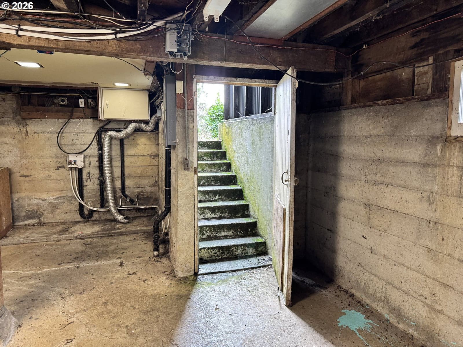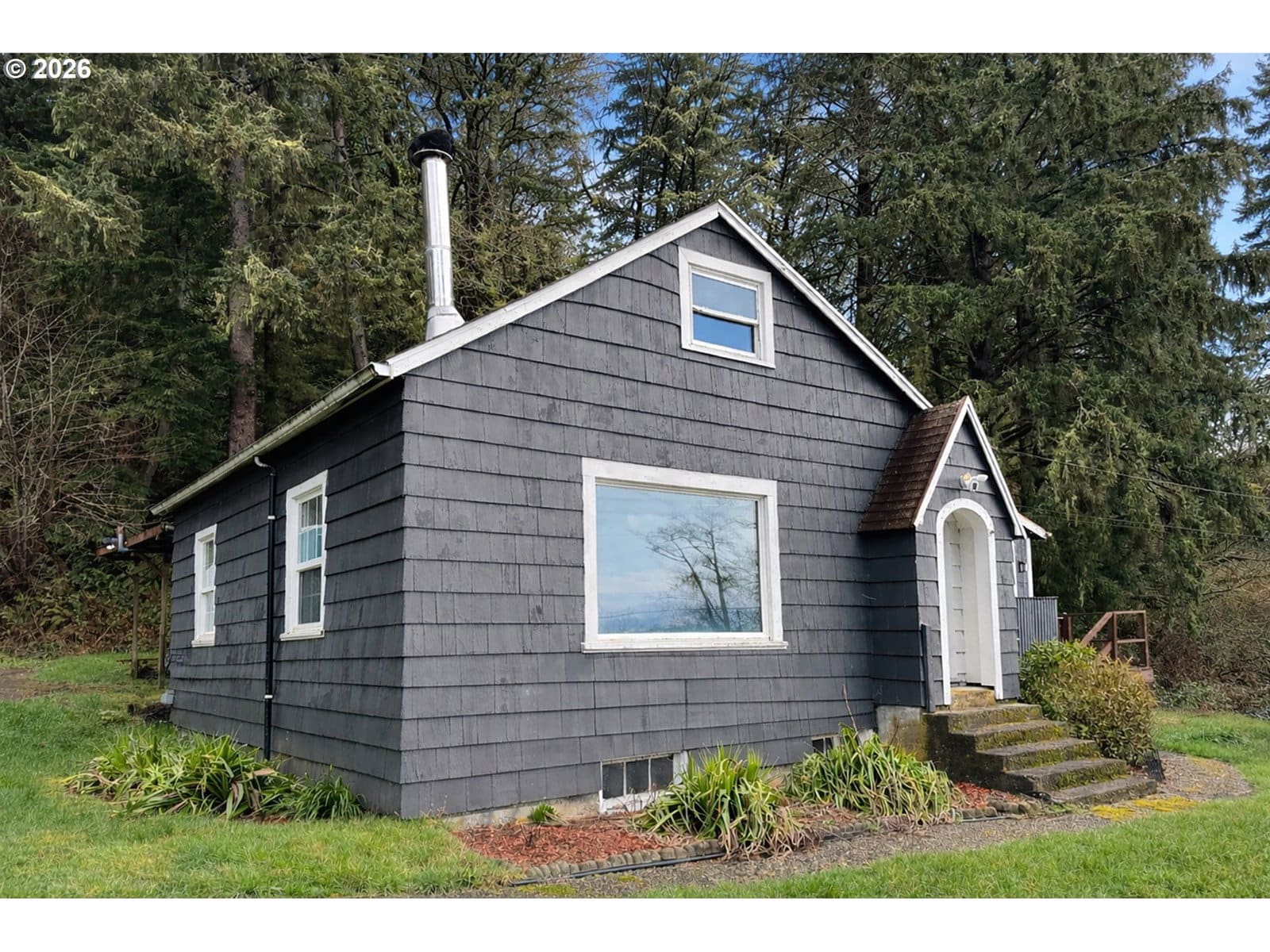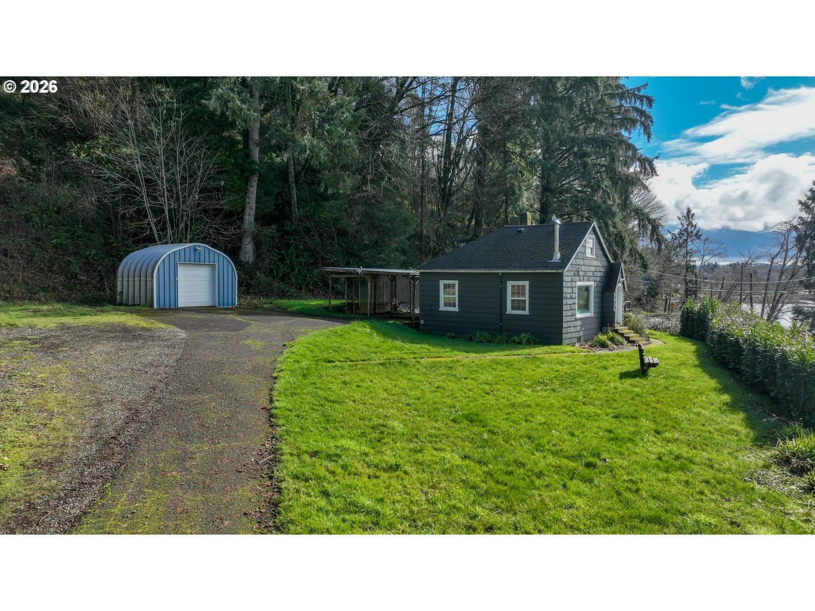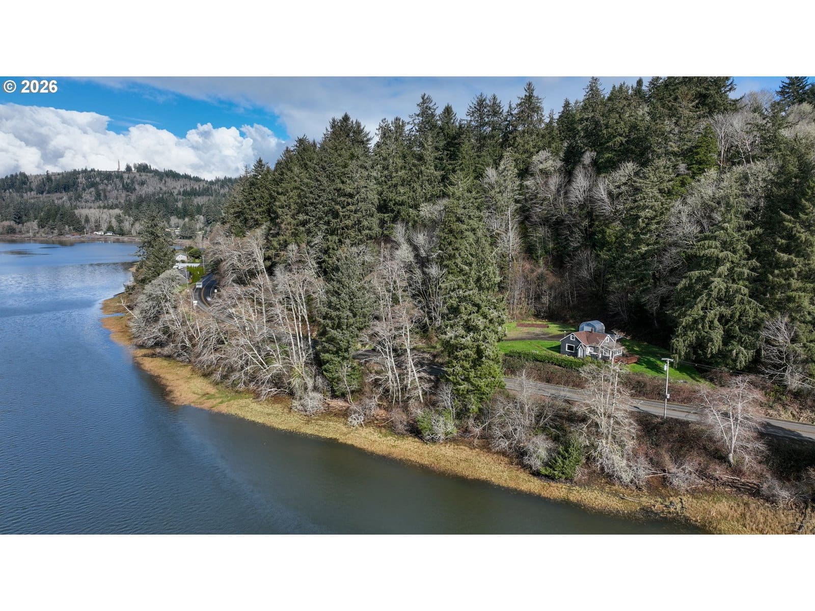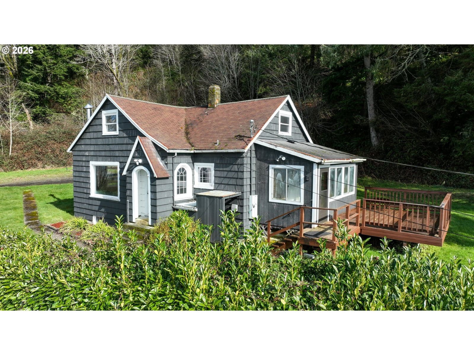 Set on high ground with views of the Youngs River, this character rich cottage feels as though it was pulled from the pages of a storybook. Original solid wood floors in the living room, original wood interior doors, arched doorways, and a cozy wood-burning stove create a warm, timeless atmosphere that immediately feels inviting and familiar. Tucked just off the beaten path, the property offers privacy, space to spread out, and true river frontage with the property extending across the highway to Youngs River.The home features two bedrooms, an attached unfinished sunroom, and a full unfinished basement with laundry hookups and ample room for storage or a workshop. Pull down stairs provide access to the finished attic is a nice bonus and ideal for a studio, office, or creative hideaway. Outside, a deck overlooks the river and surrounding landscape, framed by a mature laurel hedge that enhances the feeling of seclusion. A two-space carport and detached steel arched garage provide covered parking and utility space, while generous flat areas allow room for a boat, RV, or recreational gear. Bordered by land owned by the North Coast Land Conservancy on one side and the Oregon State Board of Forestry on the other. Call your favorite real estate agent to schedule a showing.