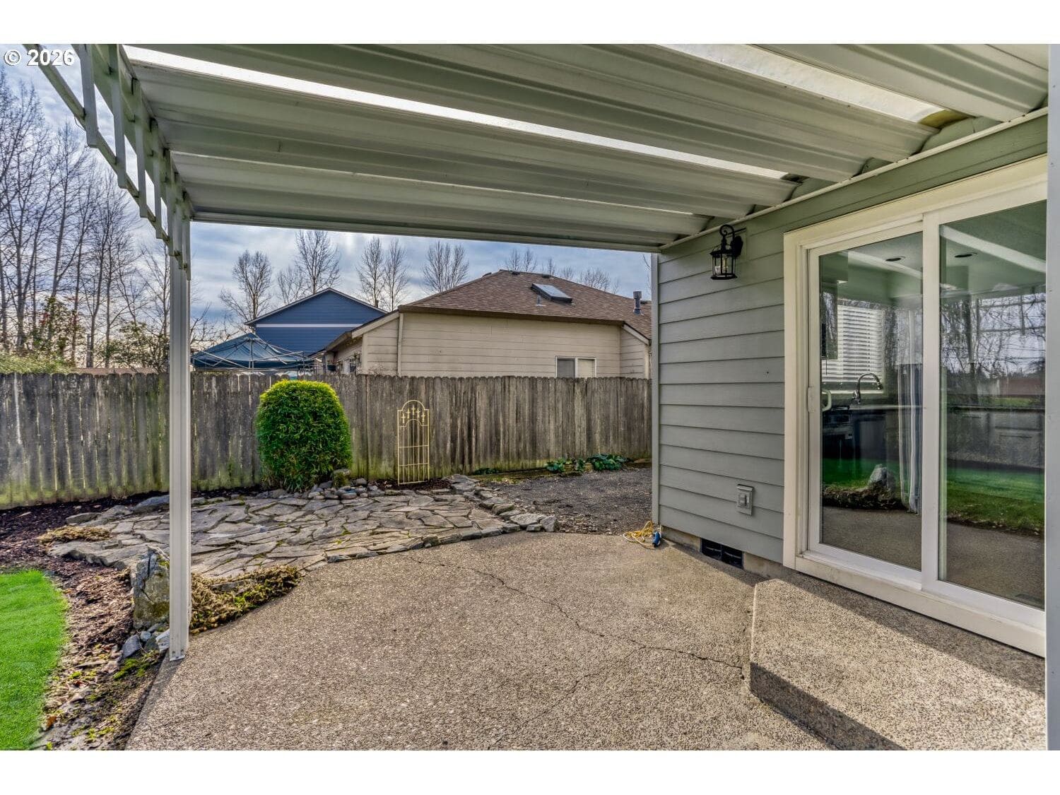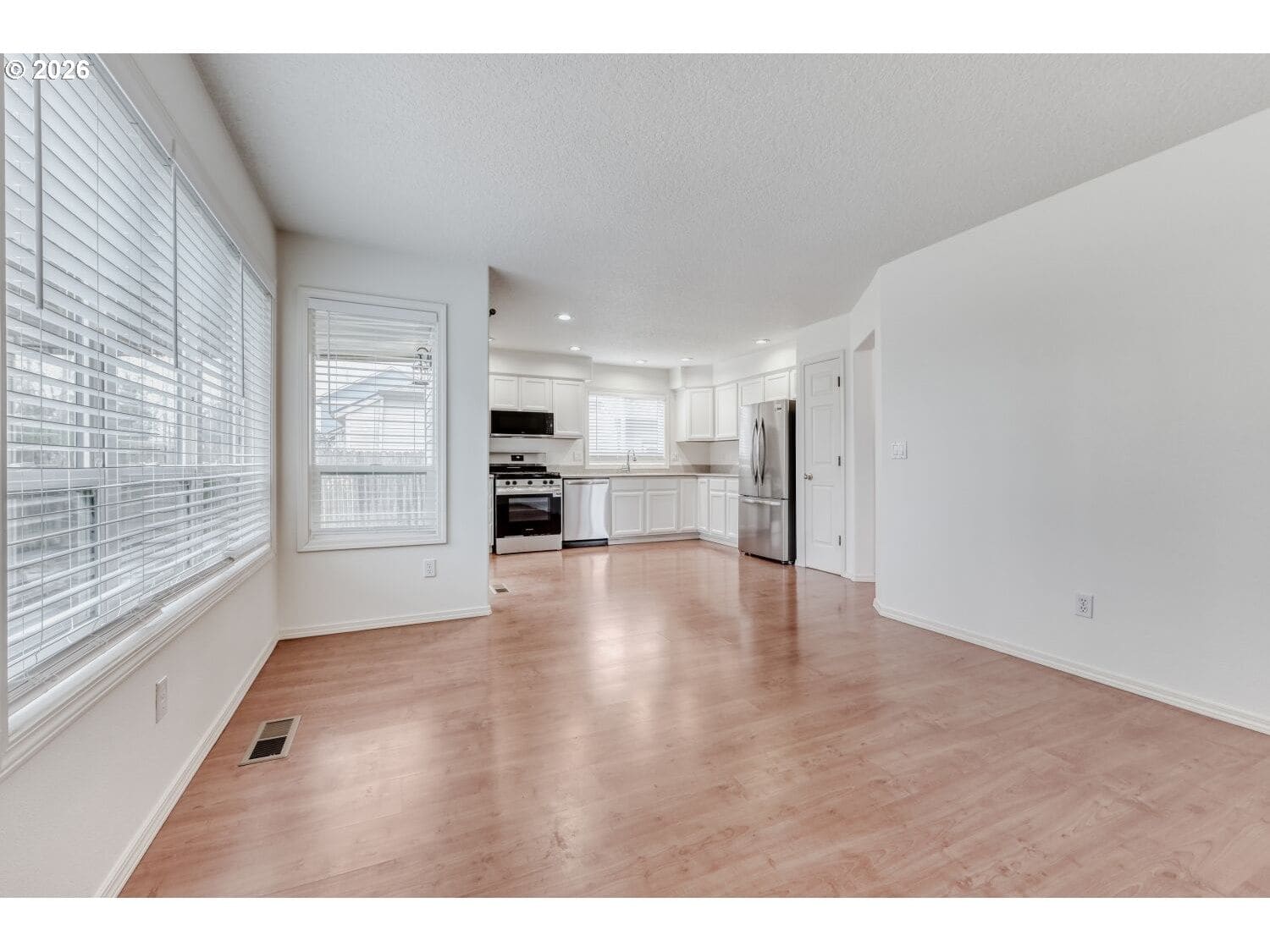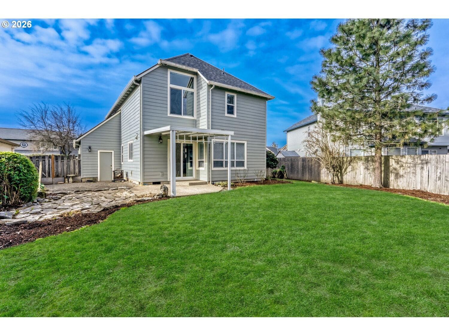 Turn-key Rock Creek traditional backing to greenspace! Situated on a large, private lot on a quiet street, this home has been meticulously maintained and fully updated with a brand-new roof, recent fiber cement siding, all-new interior paint, new carpet, and more. A two-story entry introduces a spacious living room with laminate flooring and soaring ceilings and numerous windows for excellent natural light. A freshly updated, open-concept kitchen features just-painted cabinetry, solid surface countertops, brand-new stainless steel appliances, and pantry. The upper level boasts three spacious bedrooms, including a deluxe primary suite with vaulted ceilings, french doors, and attached bathroom with new LVT flooring, double sinks, walk-in shower, and oversized walk-in closet. High-quality construction with large room sizes, high ceilings, white doors and millwork, abundant storage space, and more. Fully fenced backyard with covered patio, mature landscaping, and outstanding privacy. Sought-after Rock Creek location, close to THPRD trails and parks, Rock Creek Country Club, and great schools!