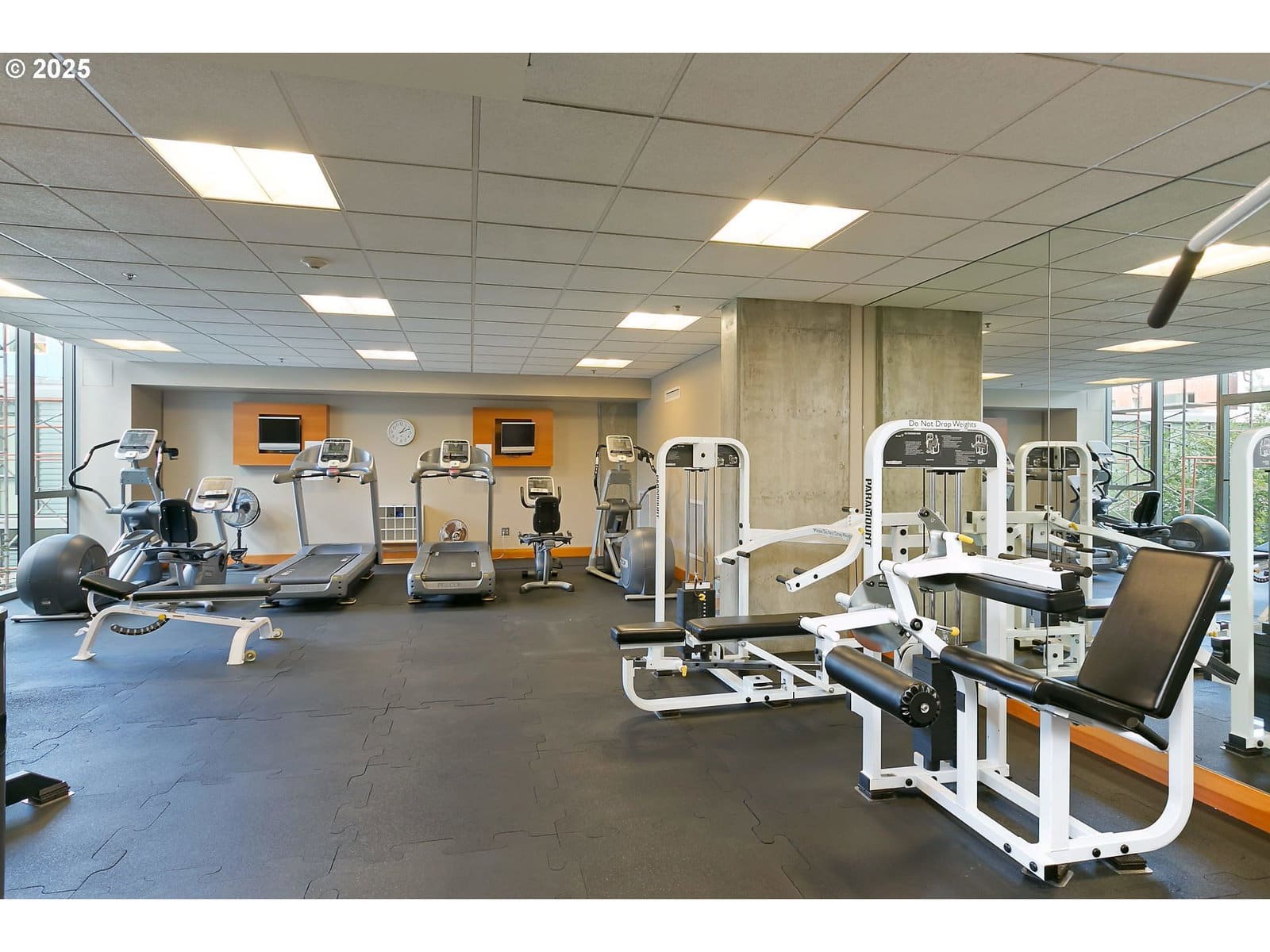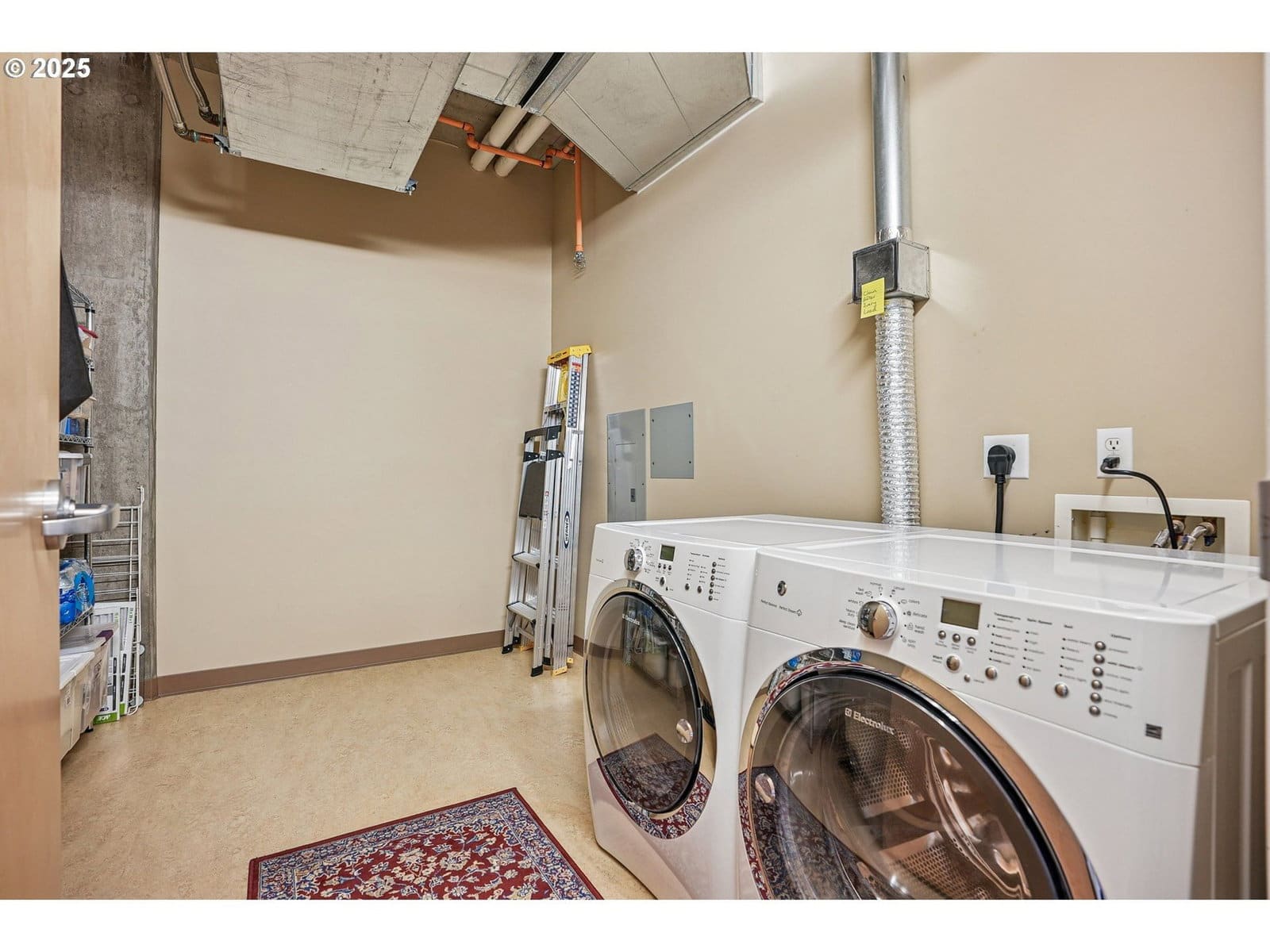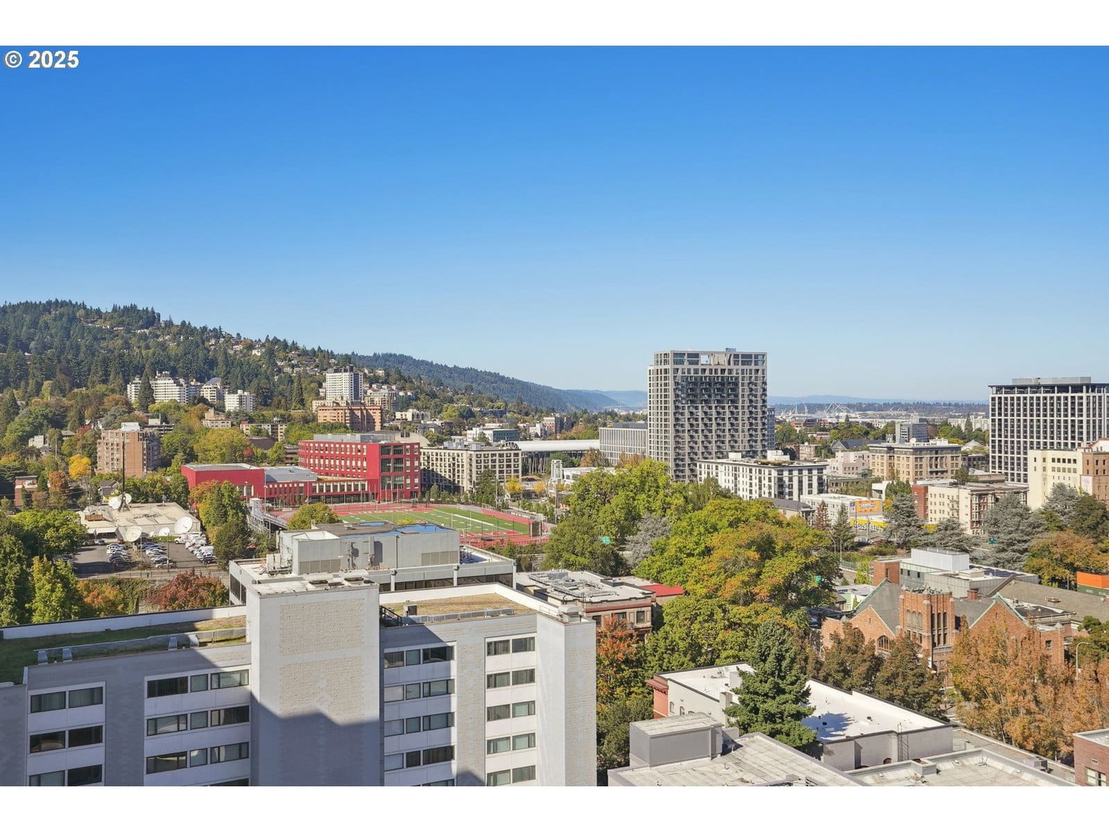 Enjoy a turnkey lifestyle & a breath of fresh air in this light and bright condo on the highest floor possible before the penthouse levels. Mid-century vibes & modern style with an open living area flooded with light from the floor to ceiling windows with two layers of mesh solar shades to control all the natural light you like. Enjoy watching the sunsets & grilling on the balcony spanning over 26'. Clean lines in the kitchen with European-style cabinets, granite counters, a custom full-height backsplash and stainless appliances, including the wine cooler in the eating island. The primary suite is private off the living room with custom wood & glass sliders, custom closets & an en suite bathroom featuring a marble vanity and large soaking tub/shower combination. Matching custom wood & glass sliders enclose the 2nd bedroom for working or hosting guests with the adjacent 2nd bath. The large entry leads to a big laundry room with generous storage space, washer & dryer. Separately deeded & secure parking space is within the building, and includes a private storage room adjacent to the parking space. The building has power for EV charging & each owner can contract to bring the power and install charging stations at each parking space at their own cost. The building has many wonderful amenities: fitness room & library on the 2nd floor, meeting room & common terrace with kitchen & bath on the 3rd floor, plus 24/7 concierge service. Strong HOA & very well managed building. Frequent the new Mark Rothko Pavilion at the Portland Art Museum across the street, events at the Schnitz, Oregon Historical Society, Farmers Markets, classes at PSU, downtown shopping & dining.
