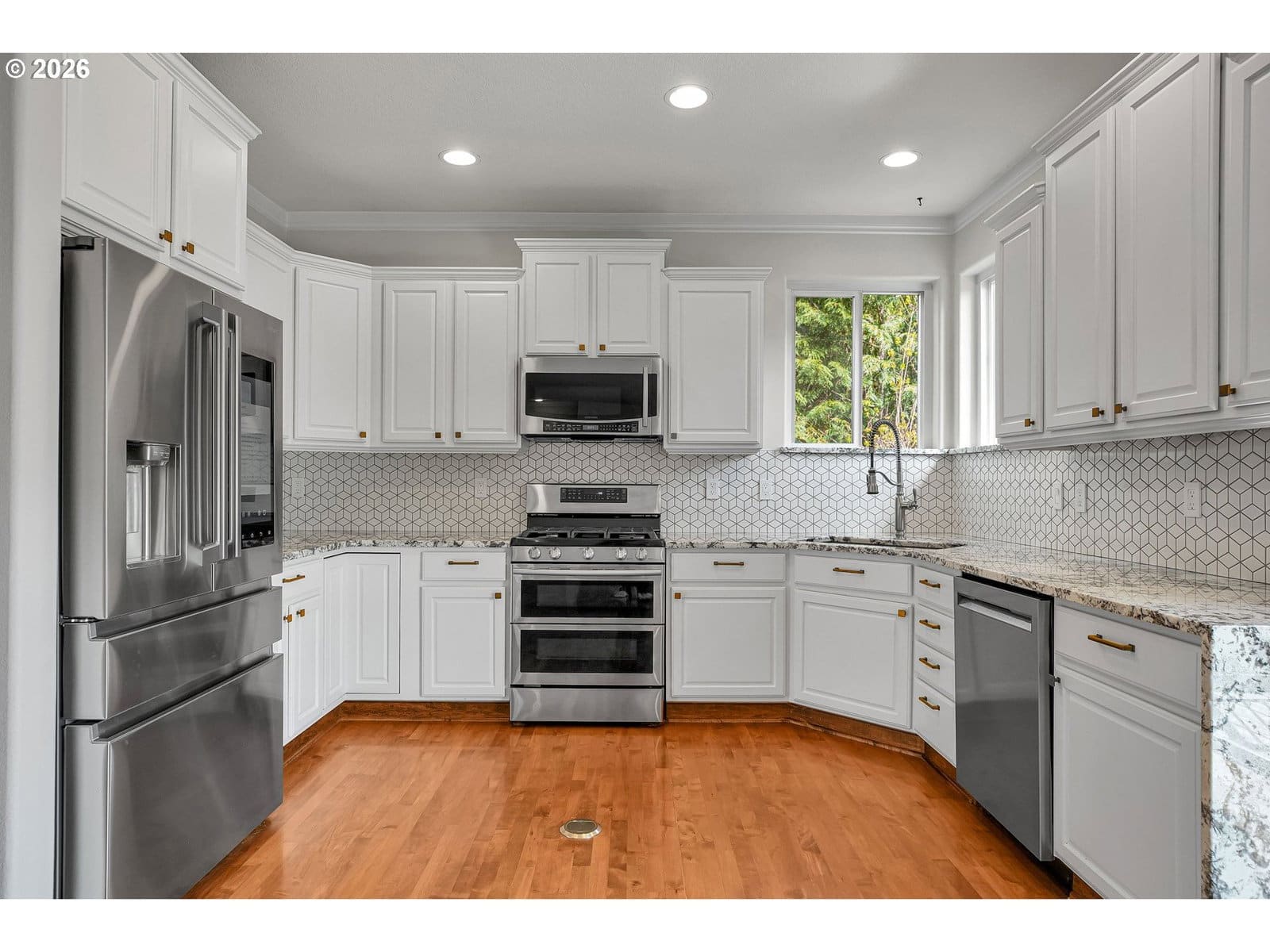 Nestled within the natural beauty of Tualatin, this exceptional residence offers a refined balance of space, design, and tranquility. Offering 3,000 sqft, 5-bedroom, 3.5-bath, three-level home with a 3-car garage is located in the sought-after Sequoia Ridge community, backing to serene trees, walking trails, and a peaceful creek—creating a private, nature-filled backdrop. Step inside to soaring ceilings, rich hardwood flooring, and abundant natural light pouring through expansive windows framing the surrounding landscape. The inviting layout seamlessly connects the formal dining area and main living spaces, offering both elegance and functionality. The chef’s kitchen is beautifully appointed with granite countertops featuring a custom waterfall edge, stainless steel appliances, double oven, pantry, custom tile backsplash, and designer finishes—perfectly designed for both everyday living and elevated entertaining. The kitchen flows effortlessly into the spacious great room, where oversized windows capture tranquil treetop views, complemented by a warm gas fireplace. Upstairs, the luxurious primary suite serves as a private retreat, introduced by French doors and highlighted by vaulted ceilings, a spa-inspired ensuite with a walk-in shower, soaking tub, and a generous walk-in closet. Three additional bedrooms offer ample space, large windows, and organized storage. A conveniently located laundry room and a well-appointed hall bath complete the upper level. The lower level provides exceptional versatility, featuring a high-ceiling bonus room ideal for a media space, gym, or flexible living, along with a fifth bedroom and full bath—perfect for guests or multigenerational living. With its own private access to the backyard and abundant storage, this level enhances both function and privacy. Outdoor living is equally impressive, with two expansive decks overlooking lush, natural surroundings, a low-maintenance turf yard, and a fully fenced backyard—creating multiple space Blue Mountain Community management503-332-2047info@bluemountaincommunity.com