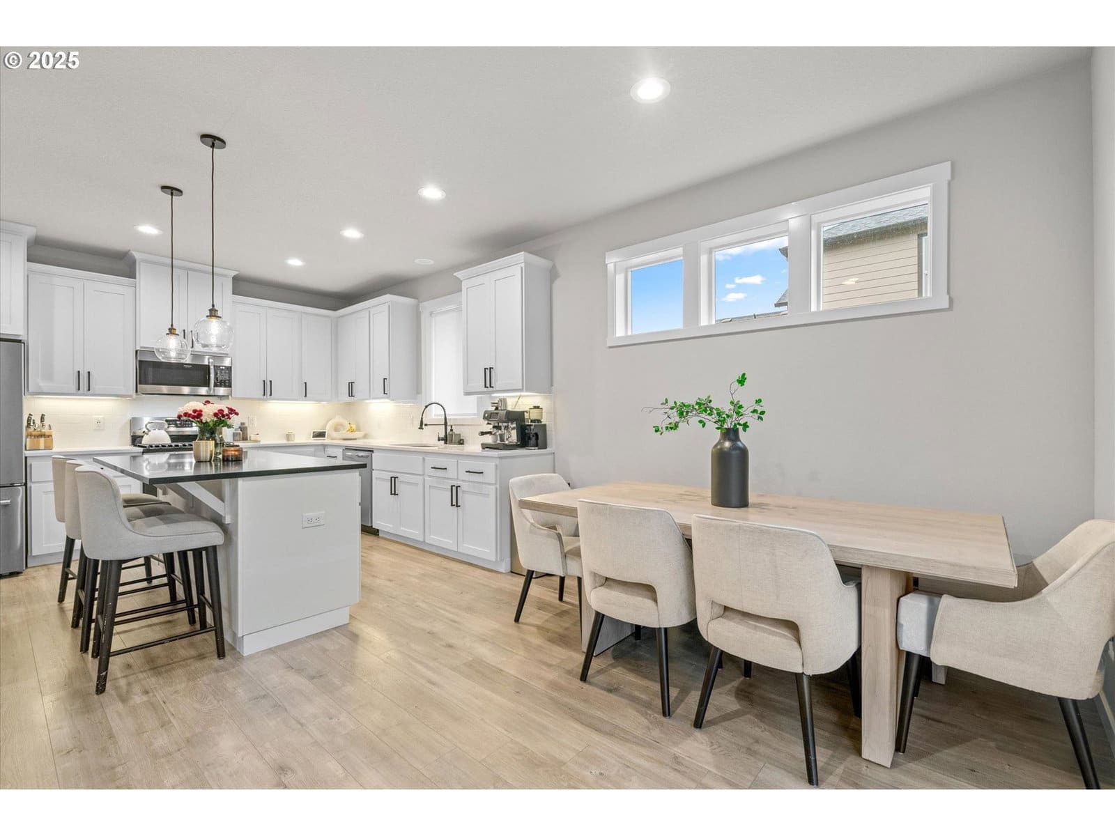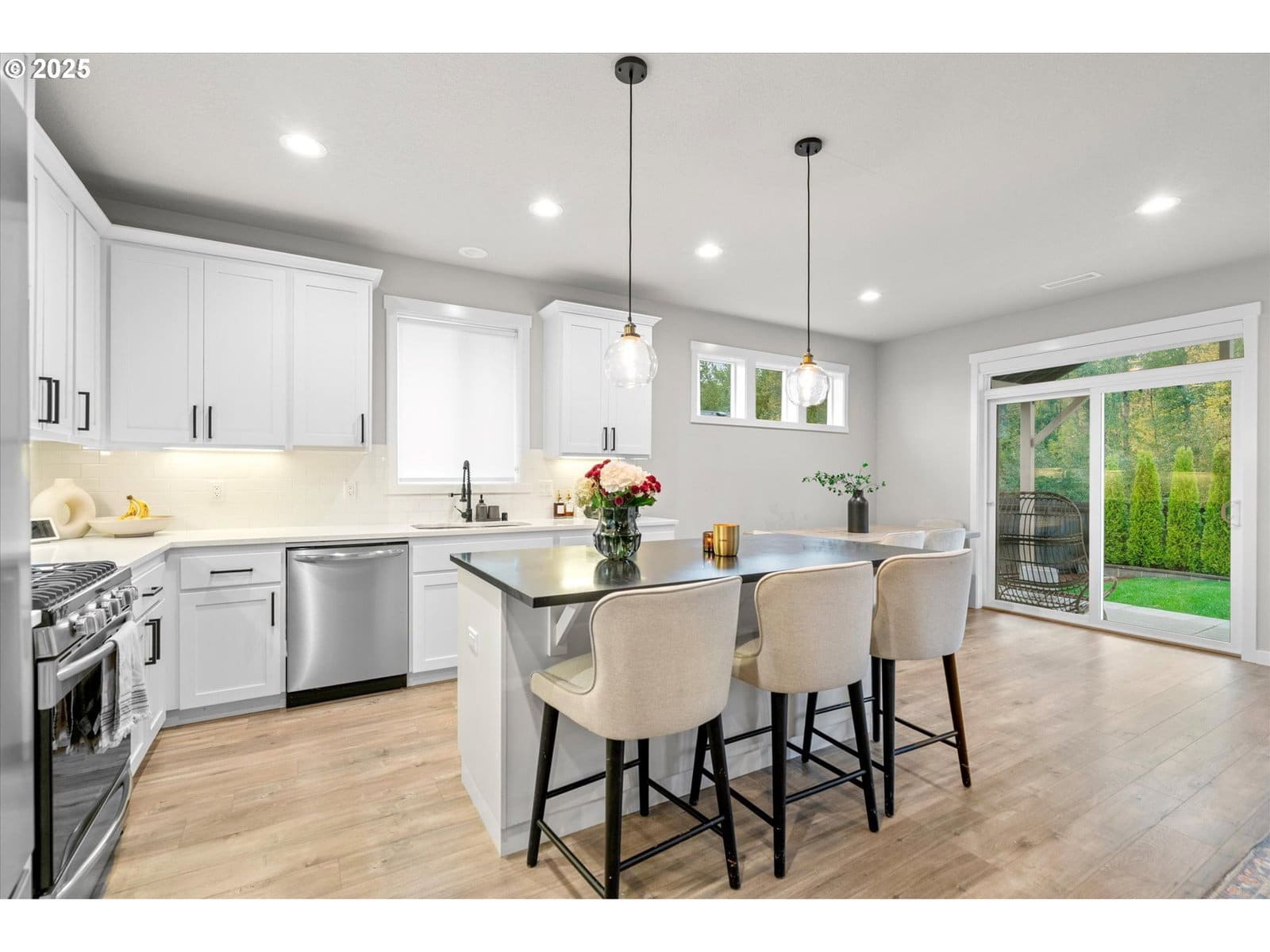 Impeccably cared-for, like-new one level home on a premium lot! This 3-bedroom, 2-bath gem combines effortless comfort with modern design and thoughtful upgrades throughout. The open-concept floor plan welcomes you with a stunning custom fireplace and TV accent wall, upgraded flooring in all bedrooms, and elegant baseboards that add a refined touch. The chef’s kitchen is the heart of the home—featuring a spacious island, upgraded quartz countertops, and a range ready for both electric and gas. Both bathrooms also showcase upgraded quartz counters and tile flooring, offering a clean, elevated aesthetic. Step outside to your private backyard retreat complete with a custom covered patio featuring lighting and a pre-wire for a fan, perfect for year-round enjoyment. Permanent Christmas lights, pre-wired landscape lighting, a camera-ready front floodlight, and a rear retaining wall all add value and convenience. Privacy landscaping, reseeded lawn, and freshly refreshed bark dust complete the picture. Lovingly maintained and prepped for every season, this home truly stands out for its quality, care, and move-in-ready perfection. Welcome Home.