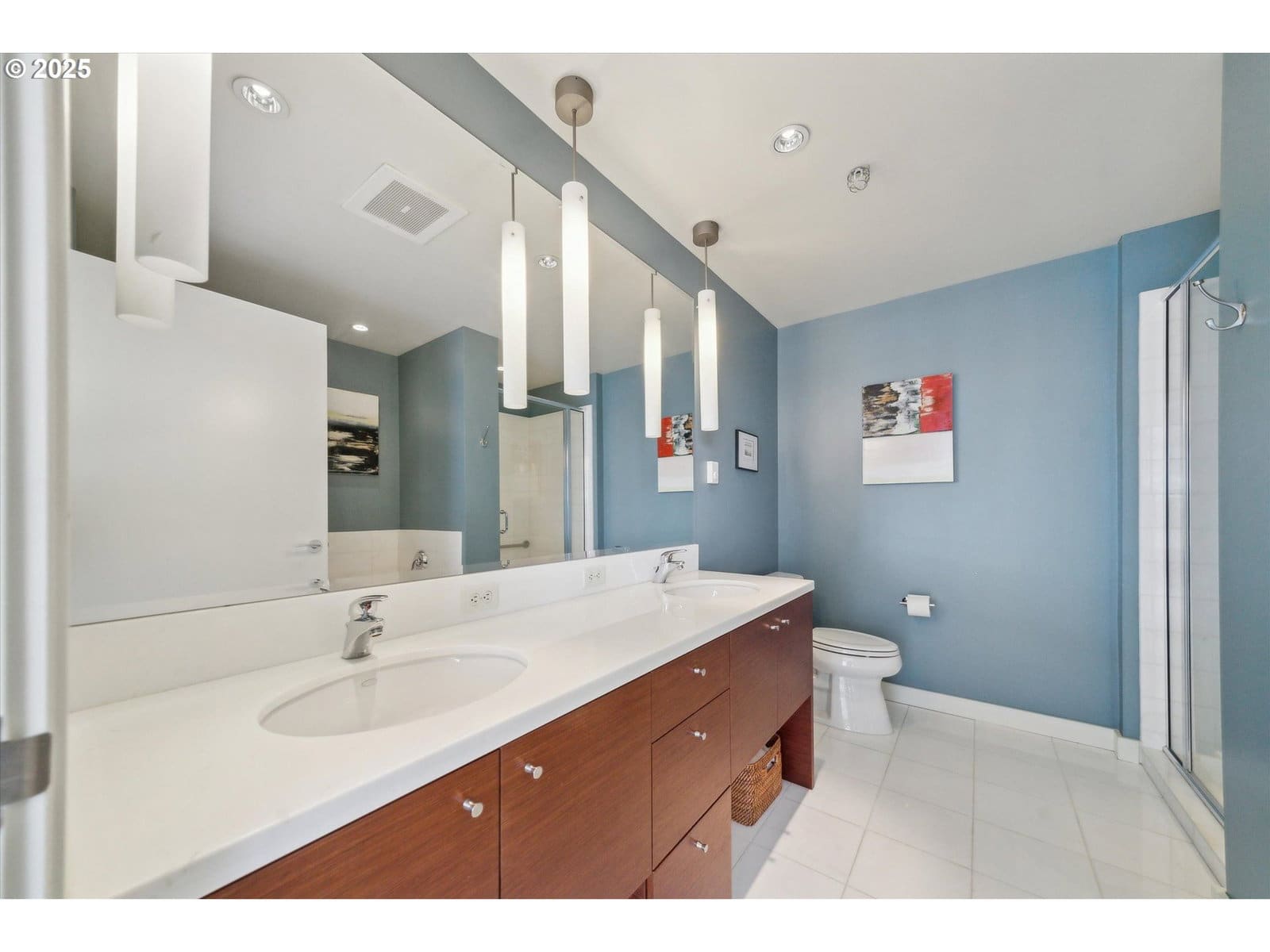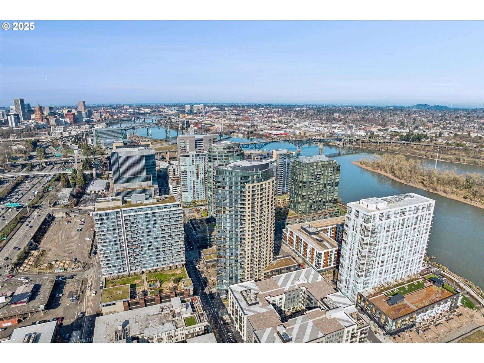 Perched on the 25th floor, this stunning 2-bedroom, 2-bath South Waterfront condo showcases sweeping views of the Willamette River, Mt. St. Helens, and the SW Hills. Inside, an open-concept layout creates a space that feels both refined and welcoming. The kitchen features stainless steel appliances, generous storage, and granite countertops. The living room is ideal for relaxing or entertaining, while the dining area is perfectly positioned to take in river views. The primary suite is generously proportioned, offering a large closet and an en-suite bathroom with a soaking tub and walk-in shower. The second bedroom/den functions beautifully as a home office or guest retreat, complete with a Murphy bed and convenient access to a full guest bath. Step out onto your private balcony to enjoy the views from above, or explore the building’s exceptional amenities, including concierge services, a community room, and beautifully maintained rooftop gardens. Secure parking includes two deeded spaces. Ideally located in the South Waterfront neighborhood, this condo is just steps from restaurants, shops, and more, with easy access to OHSU via the tram. Enjoy the tranquility of a morning stroll along the river and then hop onto the Streetcar and you’re connected to the best of Portland.