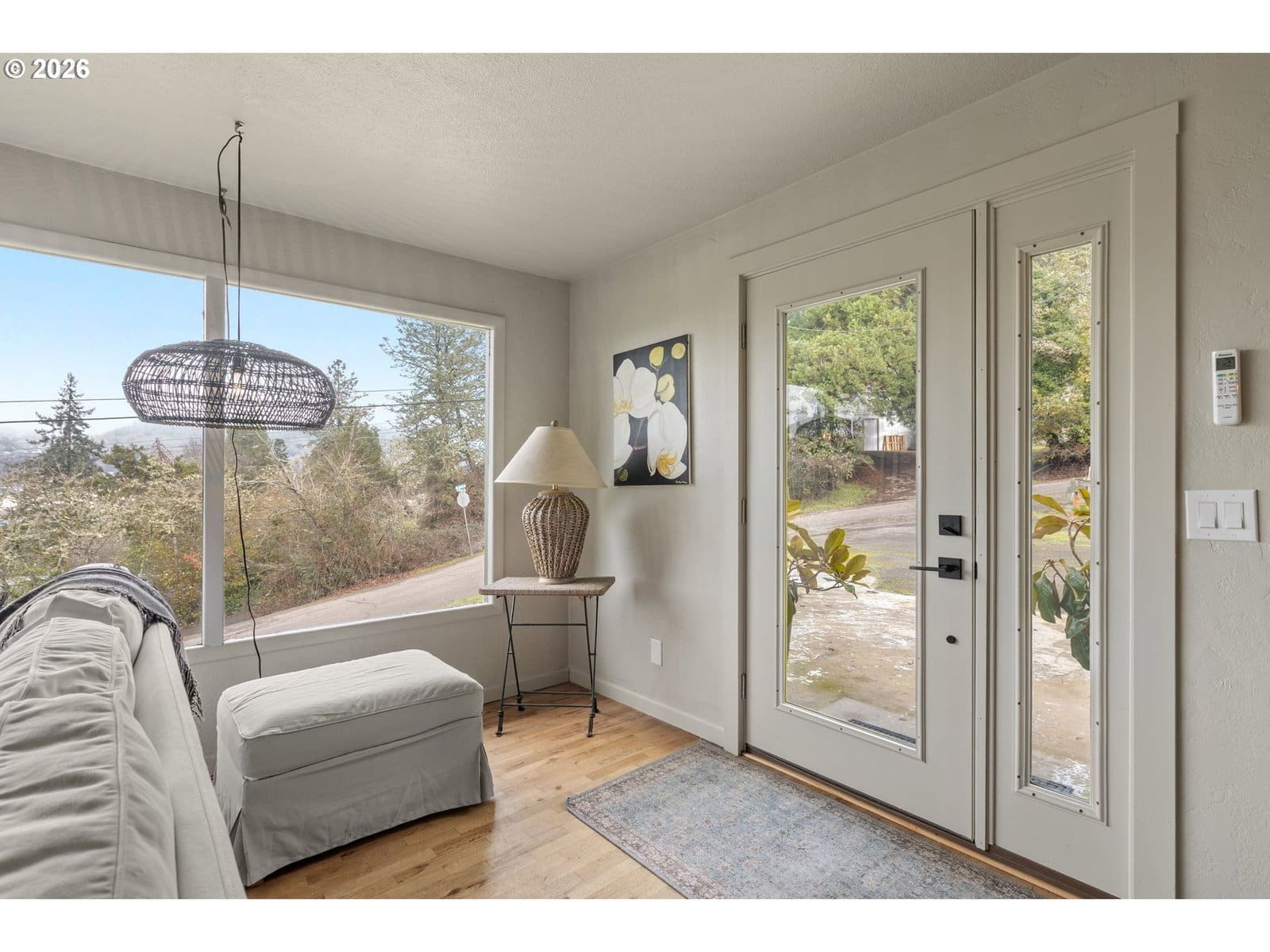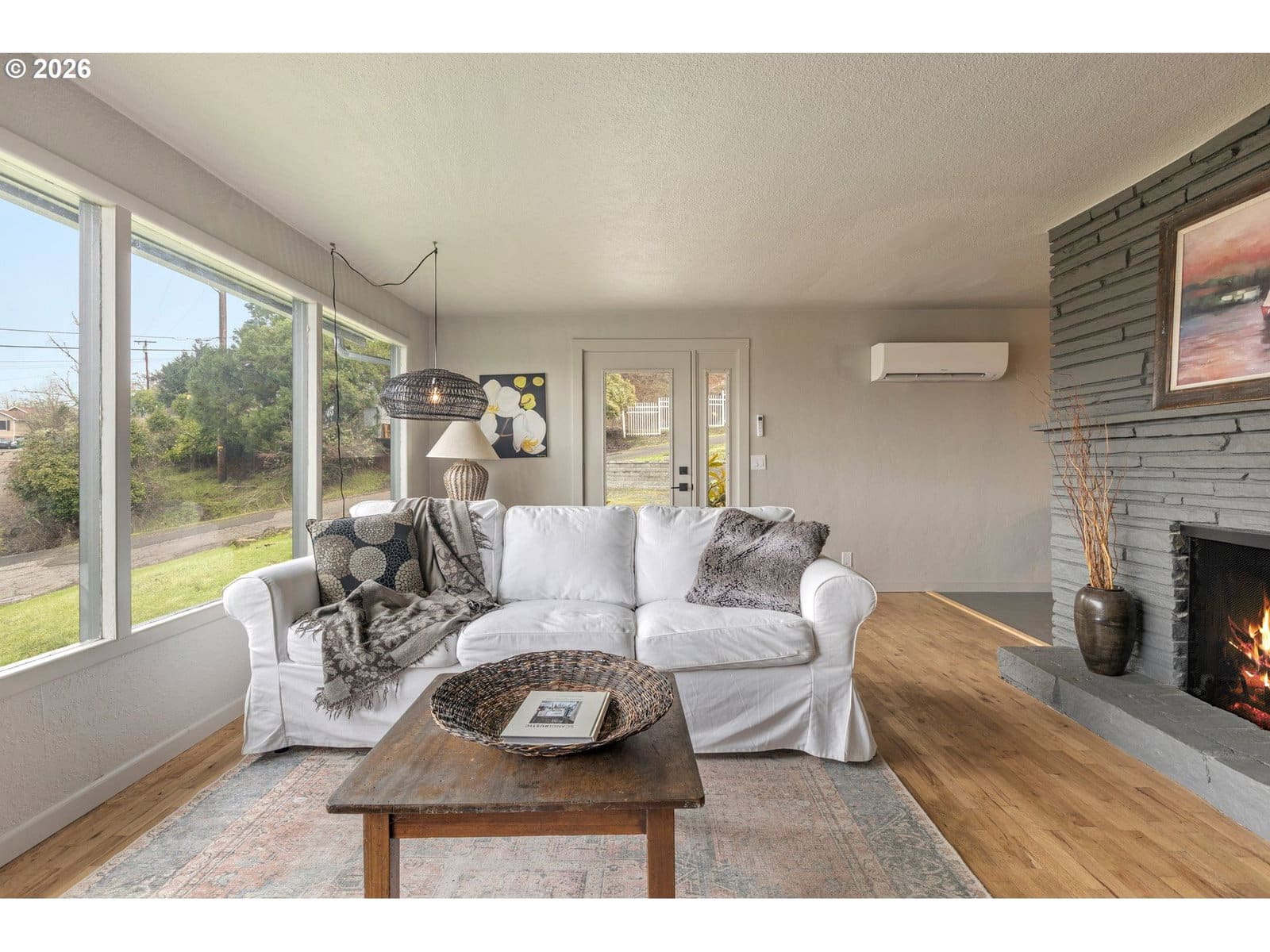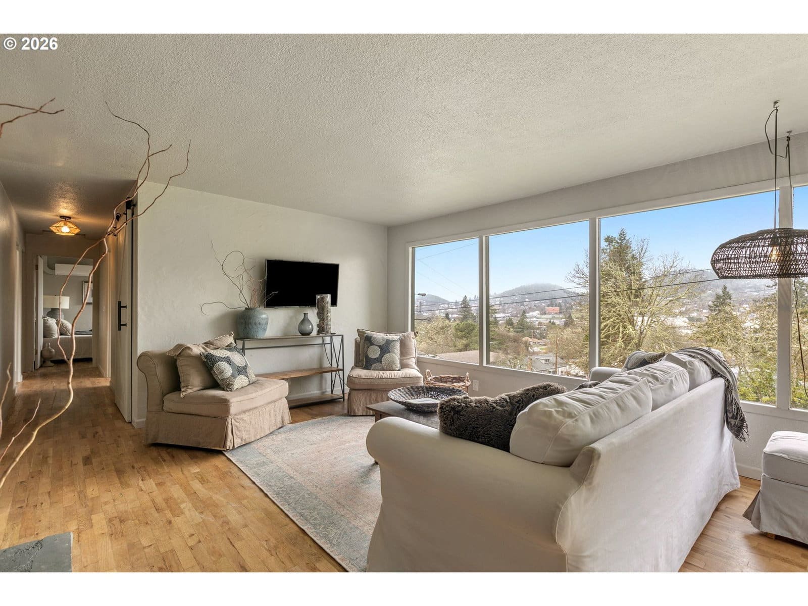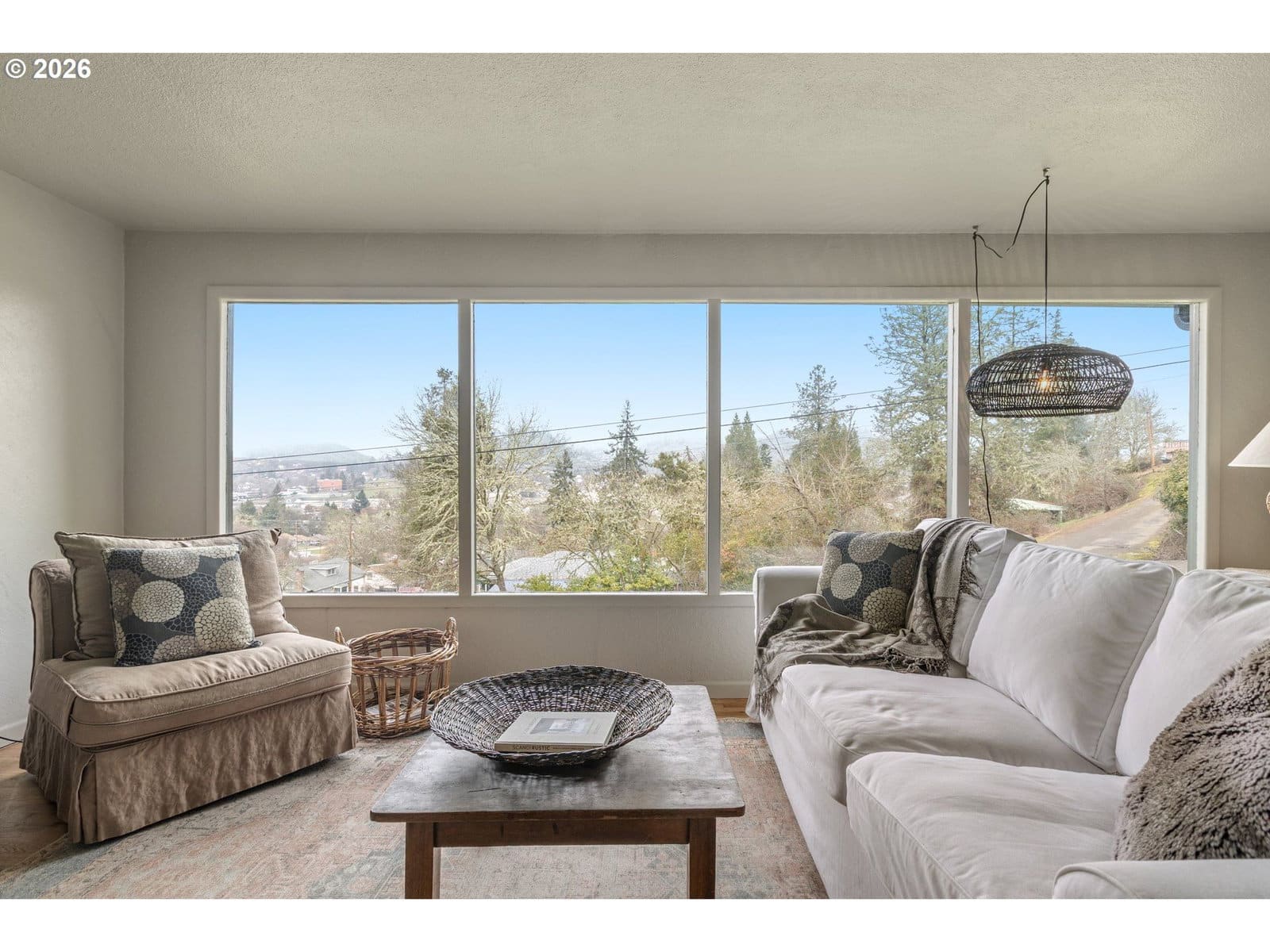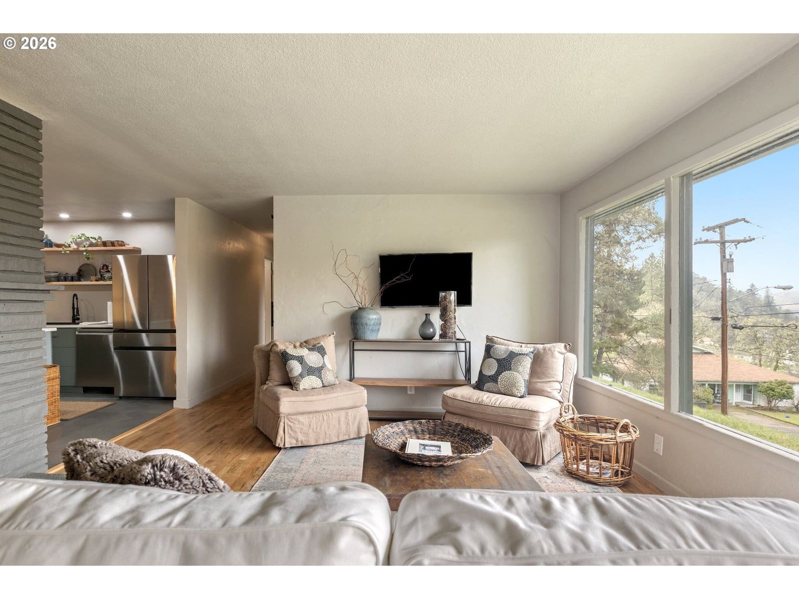 Experience the perfect blend of vintage charm and contemporary luxury in this freshly remodeled Mid-Century Modern ranch home. Situated on a spacious .30-acre lot, this single-level residence is perfectly positioned to capture stunning views of the Roseburg city lights and surrounding mountain peaks directly from your living room windows. The heart of the home features an open layout anchored by massive picture windows that flood the space with natural light. Take in the scenery while relaxing by the floor-to-ceiling stacked stone fireplace and hearth. The main living areas and hallways boast beautiful hardwood flooring, leading to a reimagined kitchen with elegant quartz countertops, a functional island, and new cabinetry featuring pull-out drawers. Modern amenities include new stainless steel appliances, a sleek range hood, and durable Marmoleum flooring that flows into the sizable dining area. The primary suite offers a private retreat with hardwood floors and those signature front-facing views. The second bedroom is bright and versatile with Marmoleum flooring and a brand-new wardrobe, while the third bedroom features hardwood floors and large windows that frame the beautiful exterior scenery. The freshly remodeled bathroom is a showstopper, featuring a double-sink vanity, a classic clawfoot soaking tub, and a brand-new walk-in tile shower, while also doubling as a convenient laundry suite with a stackable washer and dryer. Modern efficiency is ensured with a brand-new ductless heating and cooling system and fresh interior and exterior paint. Outside, you will find a large garage/workshop perfect for hobbies, a large parking area, and a lush yard with endless potential for gardening. Located just a minute from the vibrant downtown area, this home perfectly balances secluded views with urban convenience. Don’t miss your chance to own this modernized classic—schedule your private tour today! Seller is offering a 1 year home warranty to a buyer through closing.
