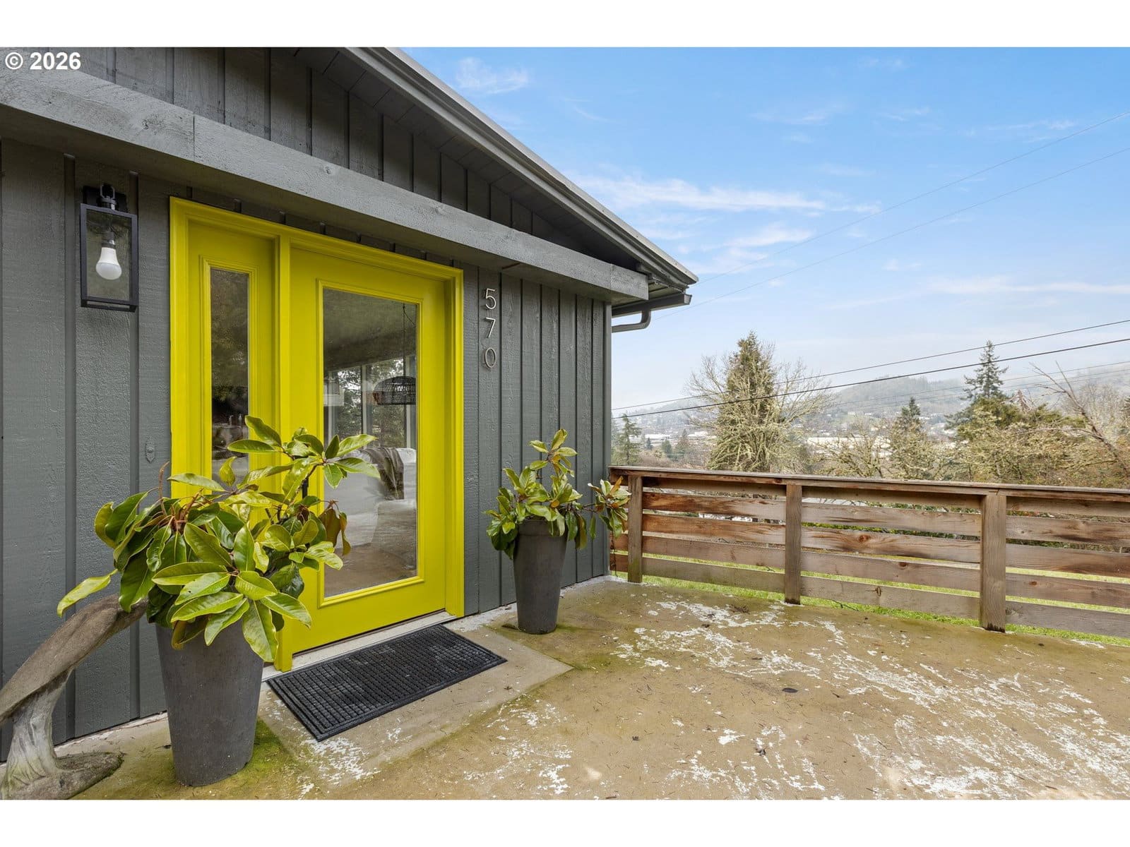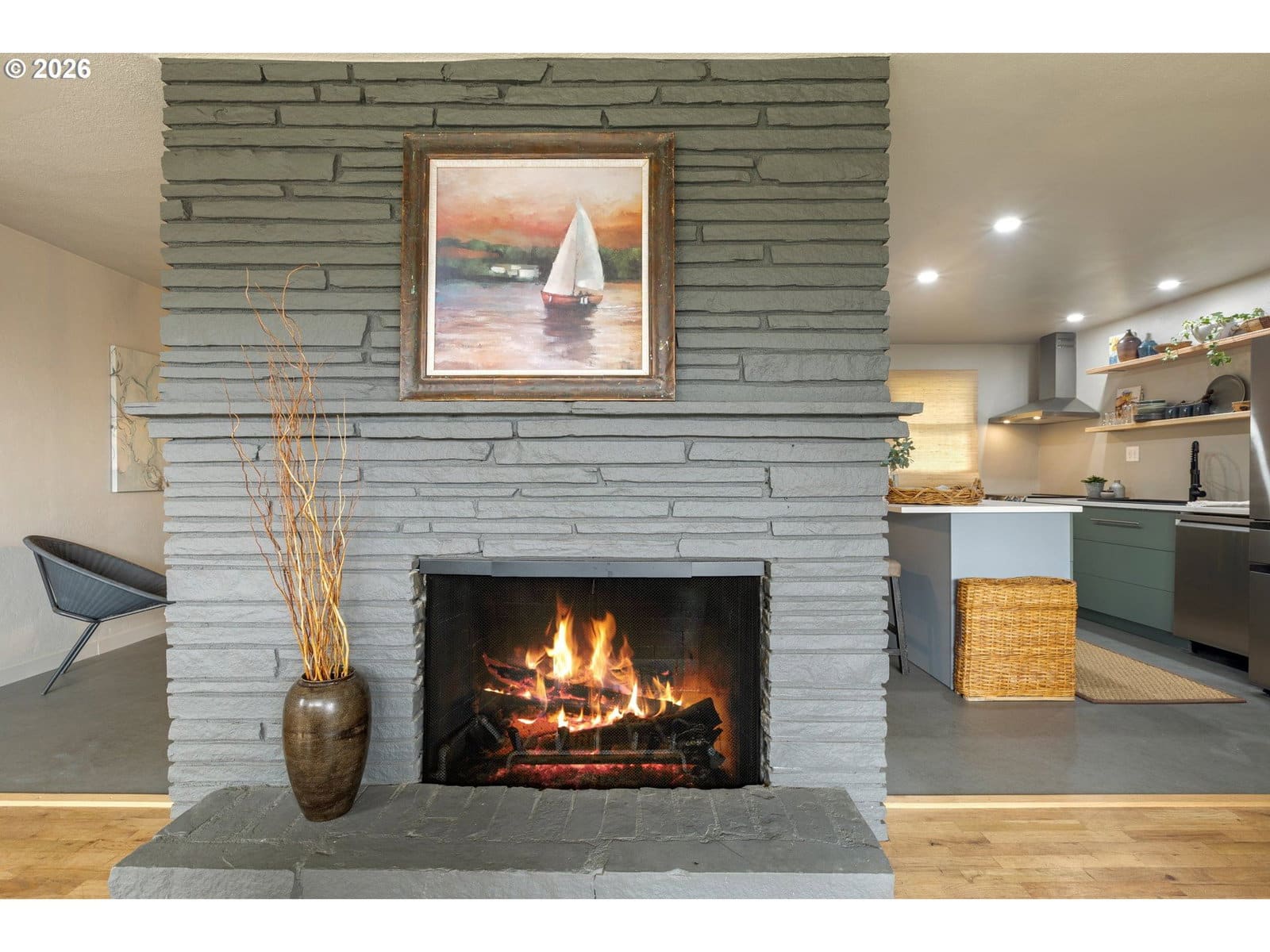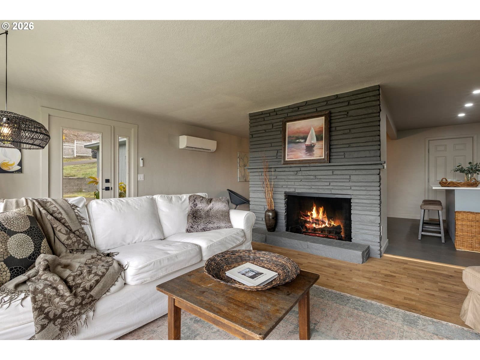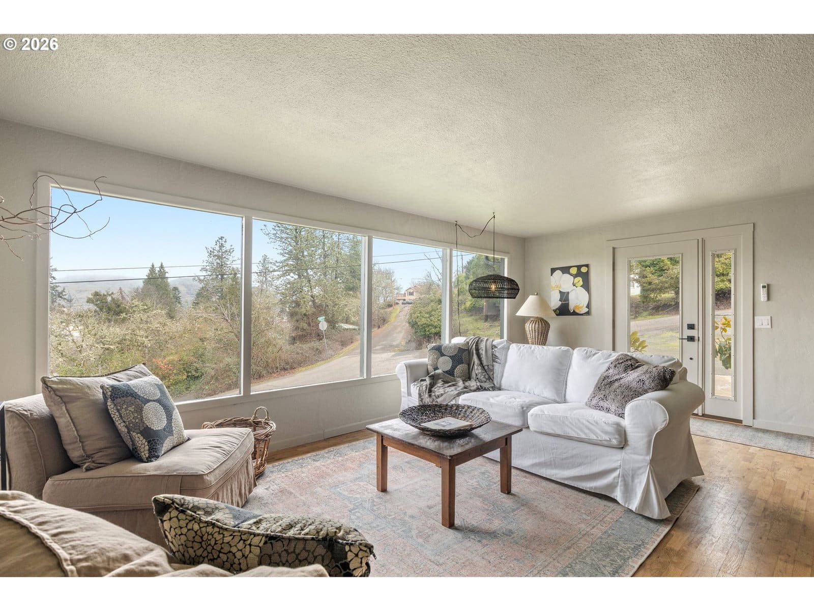Experience the perfect blend of vintage charm and contemporary luxury in this freshly remodeled Mid-Century Modern ranch home. Situated on a spacious .30-acre lot, this single-level residence is perfectly positioned to capture stunning views of the Roseburg city lights and surrounding mountain peaks directly from your living room windows. The heart of the home features an open layout anchored by massive picture windows that flood the space with natural light. Take in the scenery while relaxing by the floor-to-ceiling stacked stone fireplace and hearth. The main living areas and hallways boast beautiful hardwood flooring, leading to a reimagined kitchen with elegant quartz countertops, a functional island, and new cabinetry featuring pull-out drawers. Modern amenities include new stainless steel appliances, a sleek range hood, and durable Marmoleum flooring that flows into the sizable dining area. The primary suite offers a private retreat with hardwood floors and those signature front-facing views. The second bedroom is bright and versatile with Marmoleum flooring and a brand-new wardrobe, while the third bedroom features hardwood floors and large windows that frame the beautiful exterior scenery. The freshly remodeled bathroom is a showstopper, featuring a double-sink vanity, a classic clawfoot soaking tub, and a brand-new walk-in tile shower, while also doubling as a convenient laundry suite with a stackable washer and dryer. Modern efficiency is ensured with a brand-new ductless heating and cooling system and fresh interior and exterior paint. Outside, you will find a large garage/workshop perfect for hobbies, a large parking area, and a lush yard with endless potential for gardening. Located just a minute from the vibrant downtown area, this home perfectly balances secluded views with urban convenience. Don’t miss your chance to own this modernized classic—schedule your private tour today! Seller is offering a 1 year home warranty to a buyer through closing.