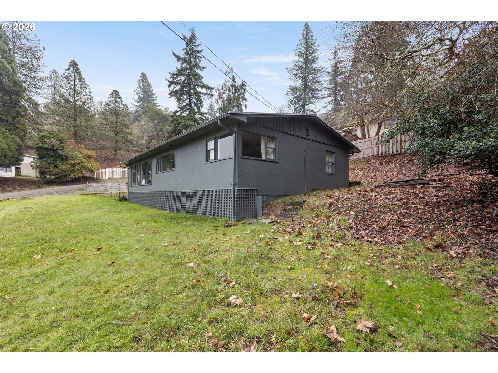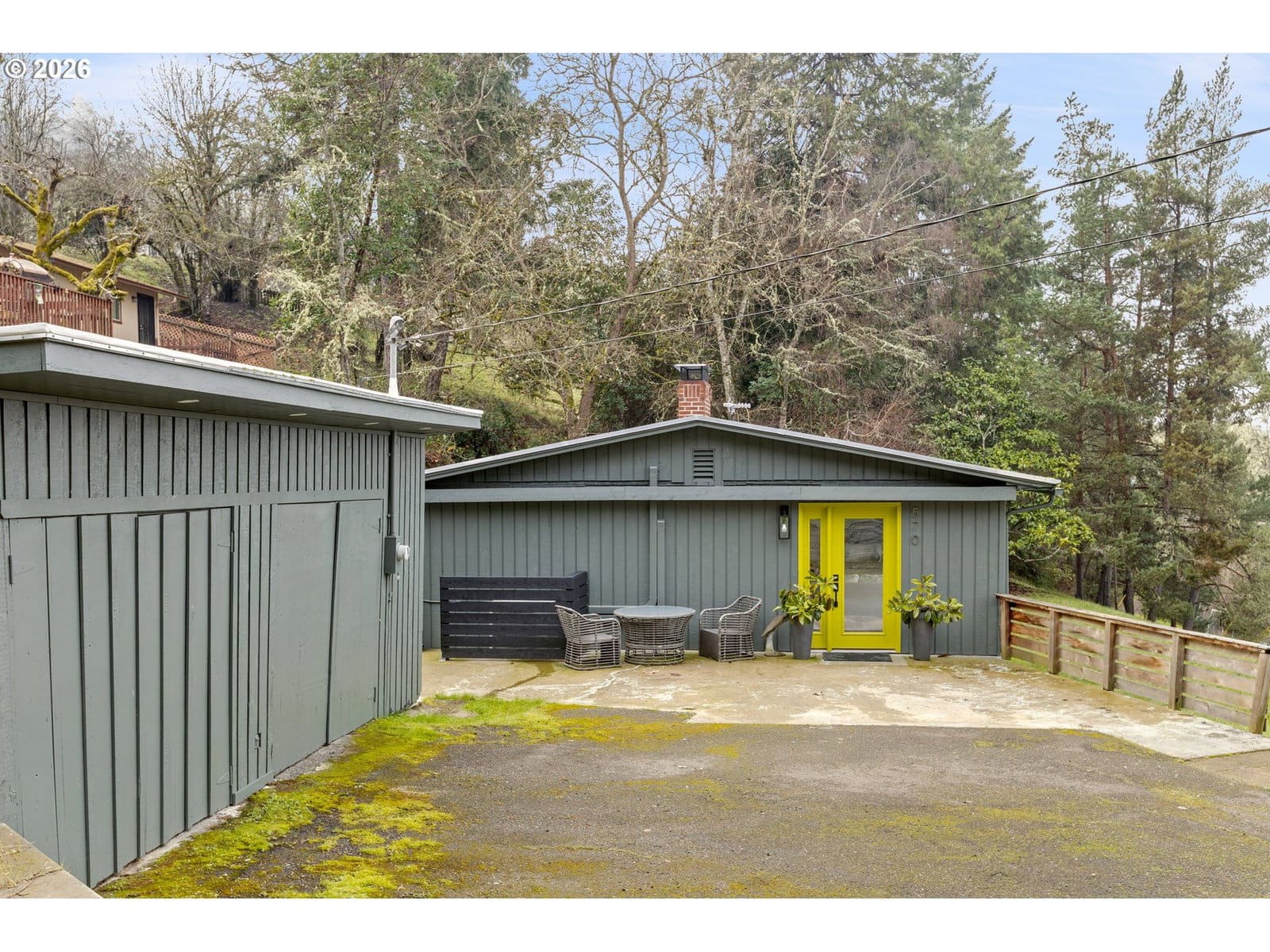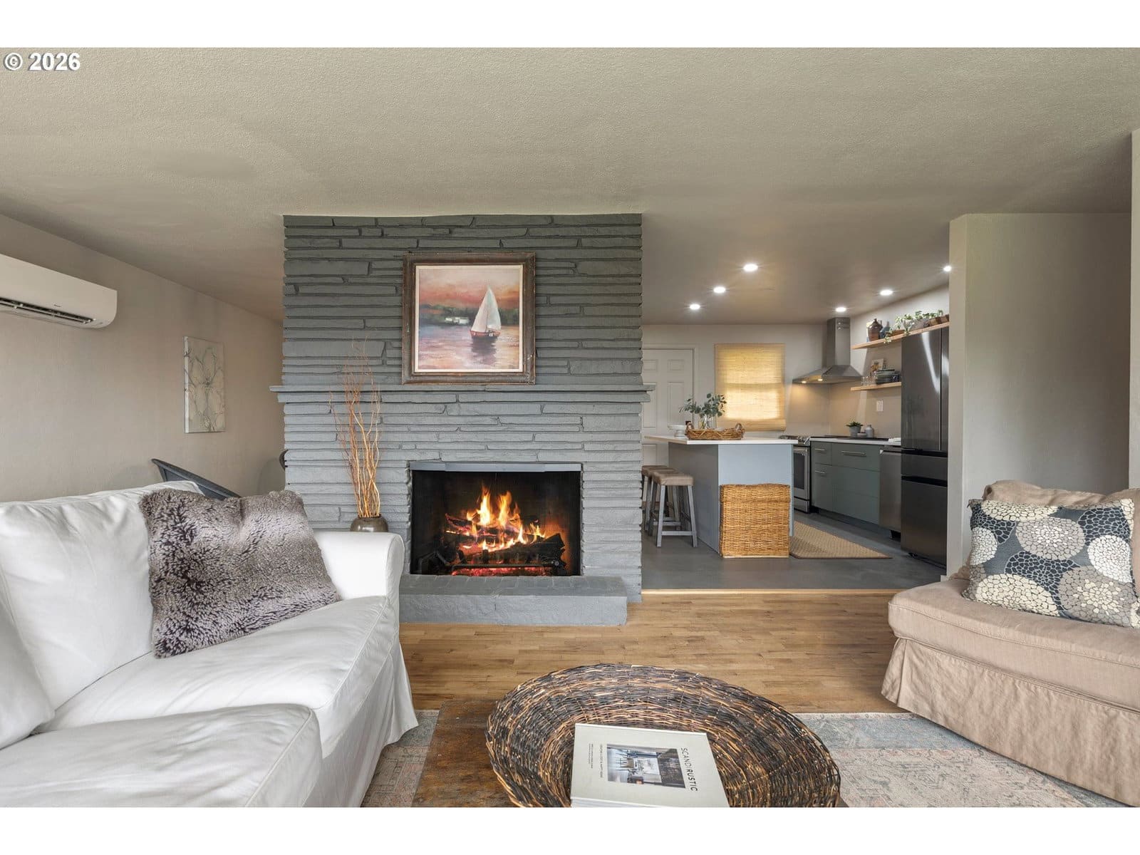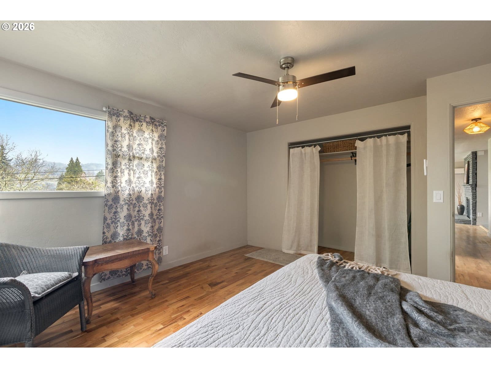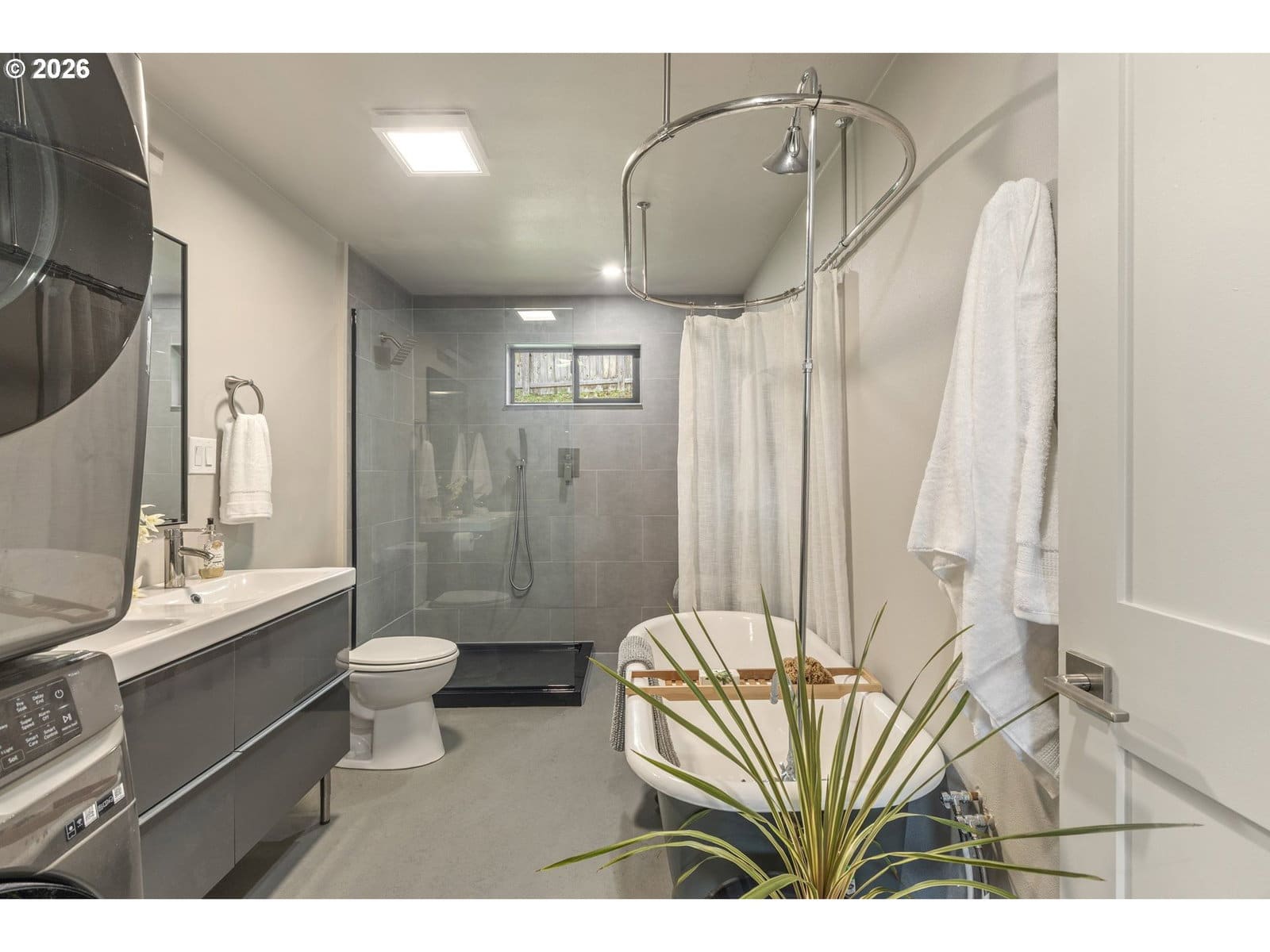 Experience the perfect blend of vintage charm and contemporary luxury in this freshly remodeled Mid-Century Modern ranch home. Situated on a spacious .30-acre lot, this single-level residence is perfectly positioned to capture stunning views of the Roseburg city lights and surrounding mountain peaks directly from your living room windows. The heart of the home features an open layout anchored by massive picture windows that flood the space with natural light. Take in the scenery while relaxing by the floor-to-ceiling stacked stone fireplace and hearth. The main living areas and hallways boast beautiful hardwood flooring, leading to a reimagined kitchen with elegant quartz countertops, a functional island, and new cabinetry featuring pull-out drawers. Modern amenities include new stainless steel appliances, a sleek range hood, and durable Marmoleum flooring that flows into the sizable dining area. The primary suite offers a private retreat with hardwood floors and those signature front-facing views. The second bedroom is bright and versatile with Marmoleum flooring and a brand-new wardrobe, while the third bedroom features hardwood floors and large windows that frame the beautiful exterior scenery. The freshly remodeled bathroom is a showstopper, featuring a double-sink vanity, a classic clawfoot soaking tub, and a brand-new walk-in tile shower, while also doubling as a convenient laundry suite with a stackable washer and dryer. Modern efficiency is ensured with a brand-new ductless heating and cooling system and fresh interior and exterior paint. Outside, you will find a large garage/workshop perfect for hobbies, a large parking area, and a lush yard with endless potential for gardening. Located just a minute from the vibrant downtown area, this home perfectly balances secluded views with urban convenience. Don’t miss your chance to own this modernized classic—schedule your private tour today! Seller is offering a 1 year home warranty to a buyer through closing.