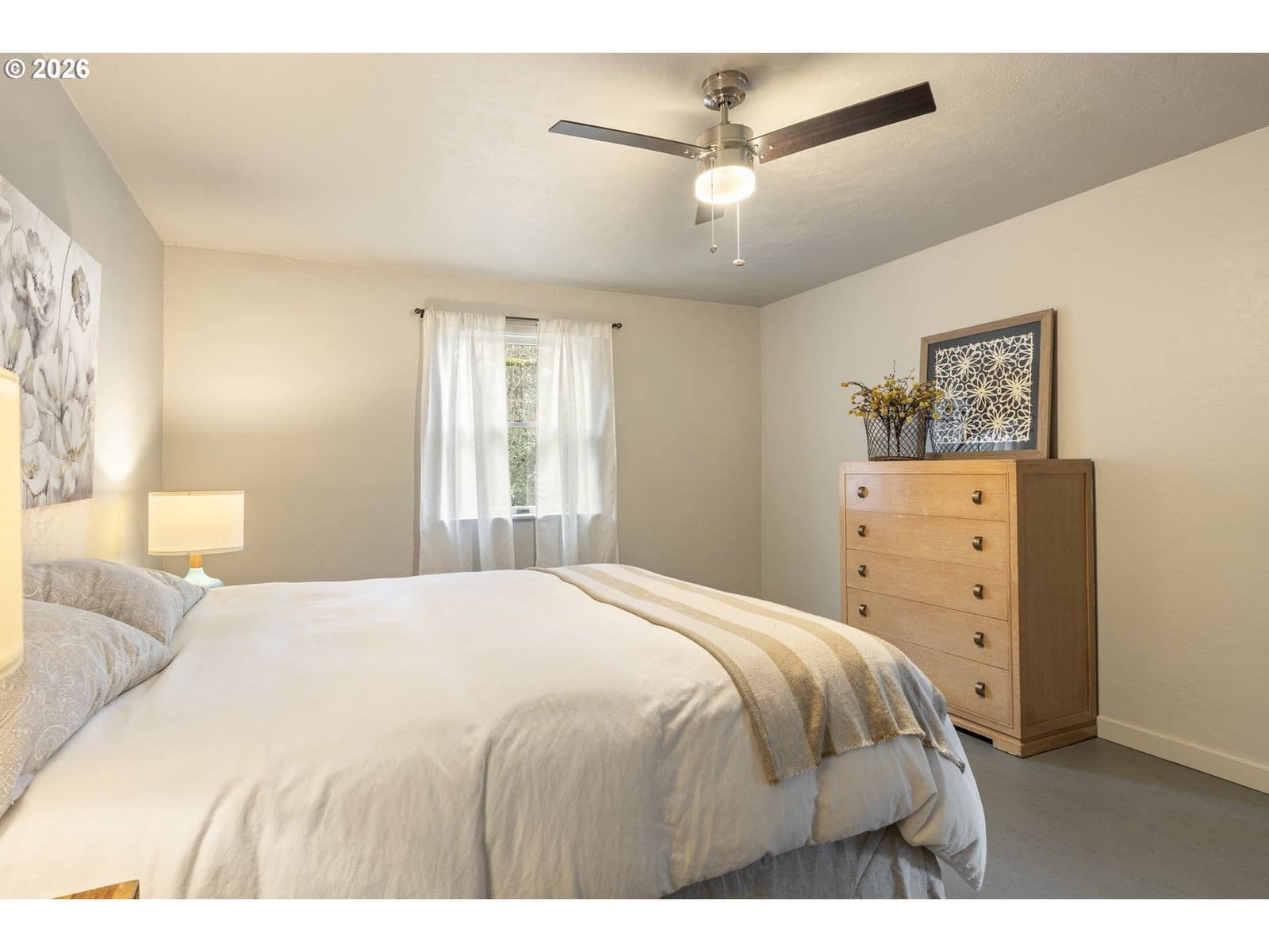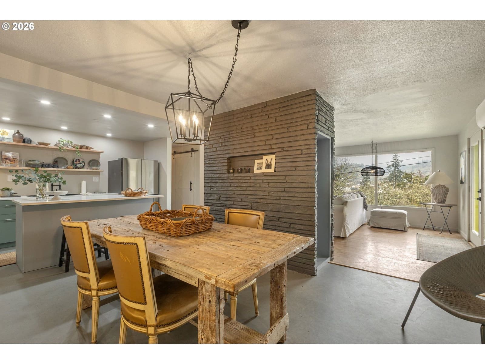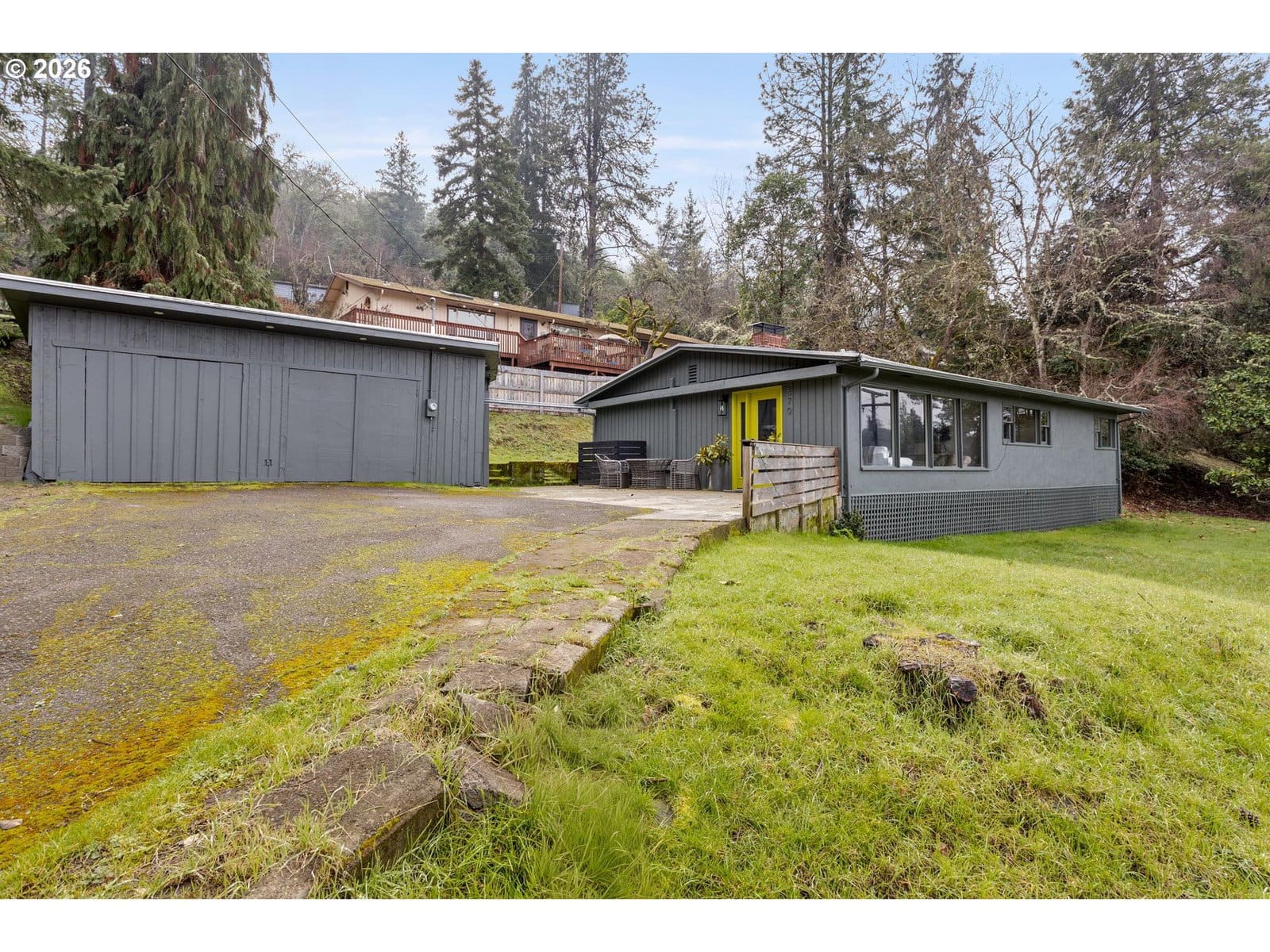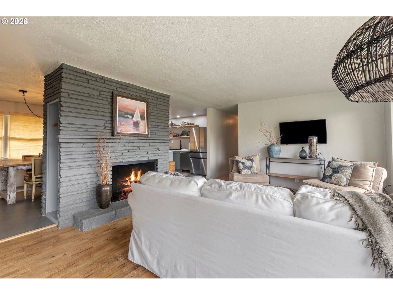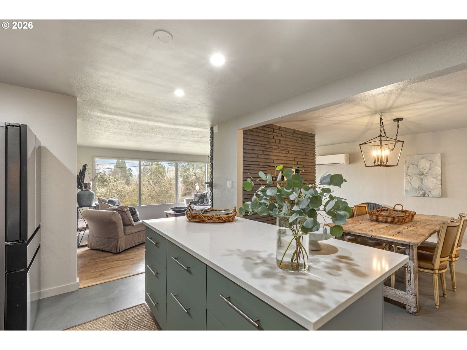 Experience the perfect blend of vintage charm and contemporary luxury in this freshly remodeled Mid-Century Modern ranch home. Situated on a spacious .30-acre lot, this single-level residence is perfectly positioned to capture stunning views of the Roseburg city lights and surrounding mountain peaks directly from your living room windows. The heart of the home features an open layout anchored by massive picture windows that flood the space with natural light. Take in the scenery while relaxing by the floor-to-ceiling stacked stone fireplace and hearth. The main living areas and hallways boast beautiful hardwood flooring, leading to a reimagined kitchen with elegant quartz countertops, a functional island, and new cabinetry featuring pull-out drawers. Modern amenities include new stainless steel appliances, a sleek range hood, and durable Marmoleum flooring that flows into the sizable dining area. The primary suite offers a private retreat with hardwood floors and those signature front-facing views. The second bedroom is bright and versatile with Marmoleum flooring and a brand-new wardrobe, while the third bedroom features hardwood floors and large windows that frame the beautiful exterior scenery. The freshly remodeled bathroom is a showstopper, featuring a double-sink vanity, a classic clawfoot soaking tub, and a brand-new walk-in tile shower, while also doubling as a convenient laundry suite with a stackable washer and dryer. Modern efficiency is ensured with a brand-new ductless heating and cooling system and fresh interior and exterior paint. Outside, you will find a large garage/workshop perfect for hobbies, a large parking area, and a lush yard with endless potential for gardening. Located just a minute from the vibrant downtown area, this home perfectly balances secluded views with urban convenience. Don’t miss your chance to own this modernized classic—schedule your private tour today! Seller is offering a 1 year home warranty to a buyer through closing.